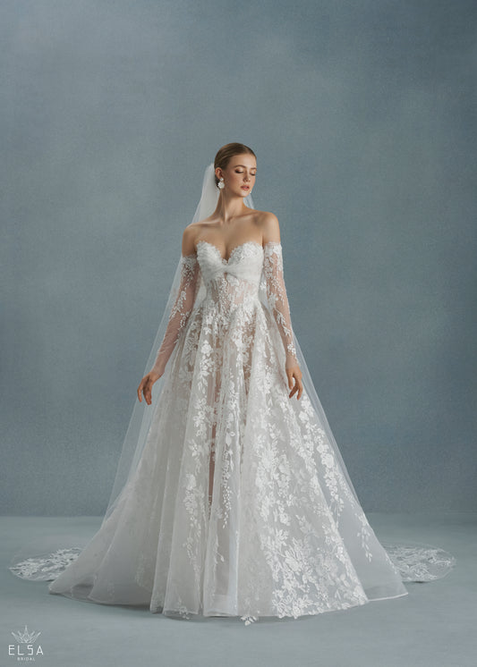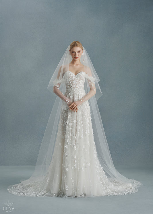 DESCRIPTIONRomantic and ethereal, this off-shoulder A-line gown features a soft illusion neckline and floral appliquรฉs that blossom down sheer fitted sleeves. The boned bodice offers gentle structure while the cascading layers of embroidered tulle move like whispered vows. Finished with a chapel train, this...-
