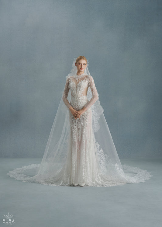 DESCRIPTIONSculptural elegance takes form in this body-contouring mermaid gown. The high illusion neckline and long sleeves are adorned with linear beaded embroidery that mirrors the natural flow of the body. Subtle nude illusion cutouts enhance the silhouette while a flowing cathedral veil adds grandeur....-