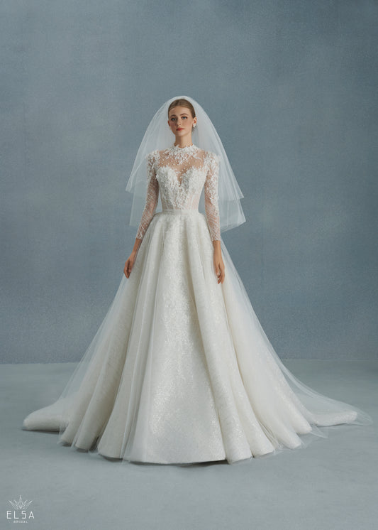 DESCRIPTIONRefined and radiant: a subtly shimmering Aโline gown, sculpted at the waist and accented by a detached tulle sash that floats on the breeze. The high neckline and long sleeves evoke timeless grace, updated with modern sparkle. FEATURES Illusion high neckline with delicate sequin...-