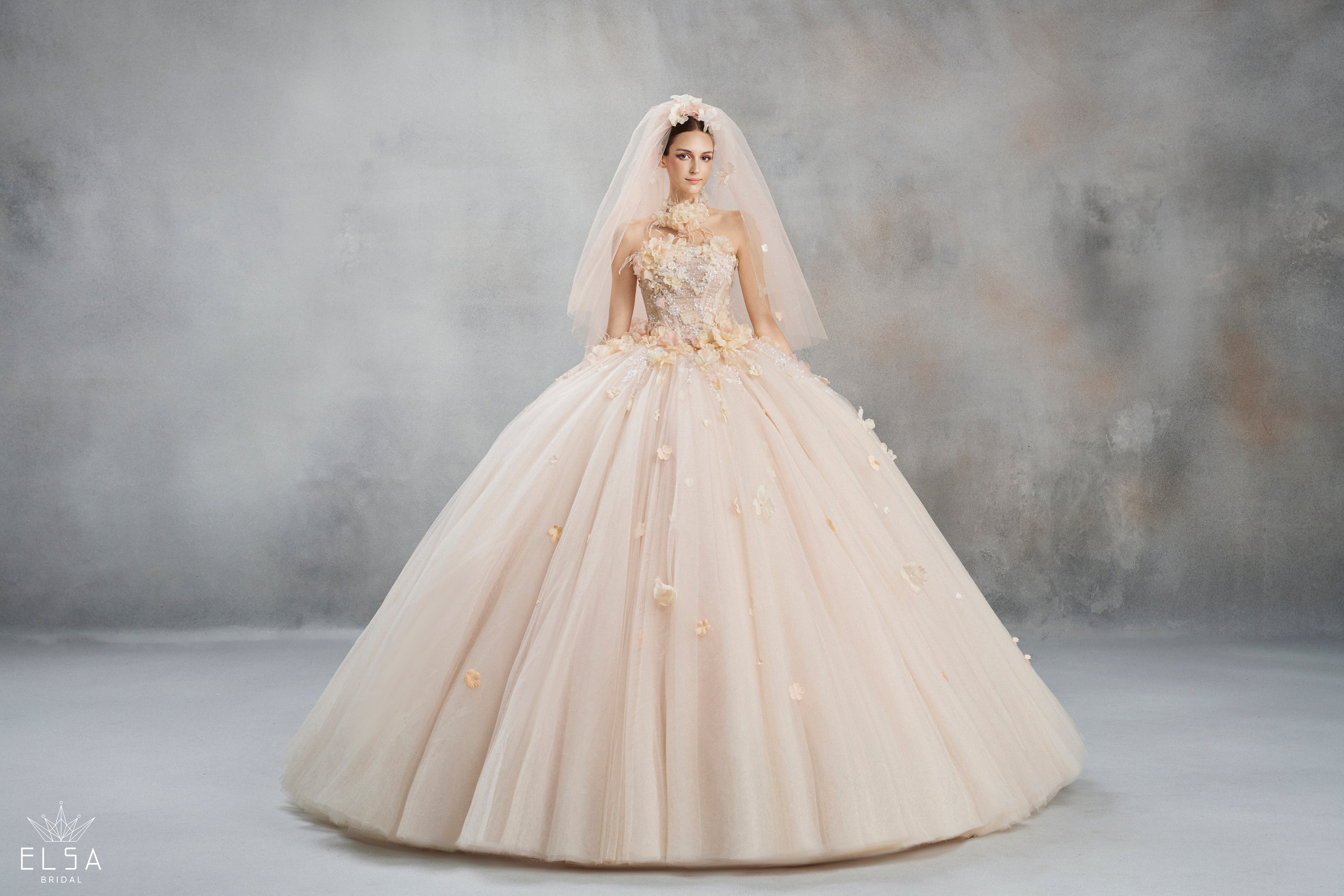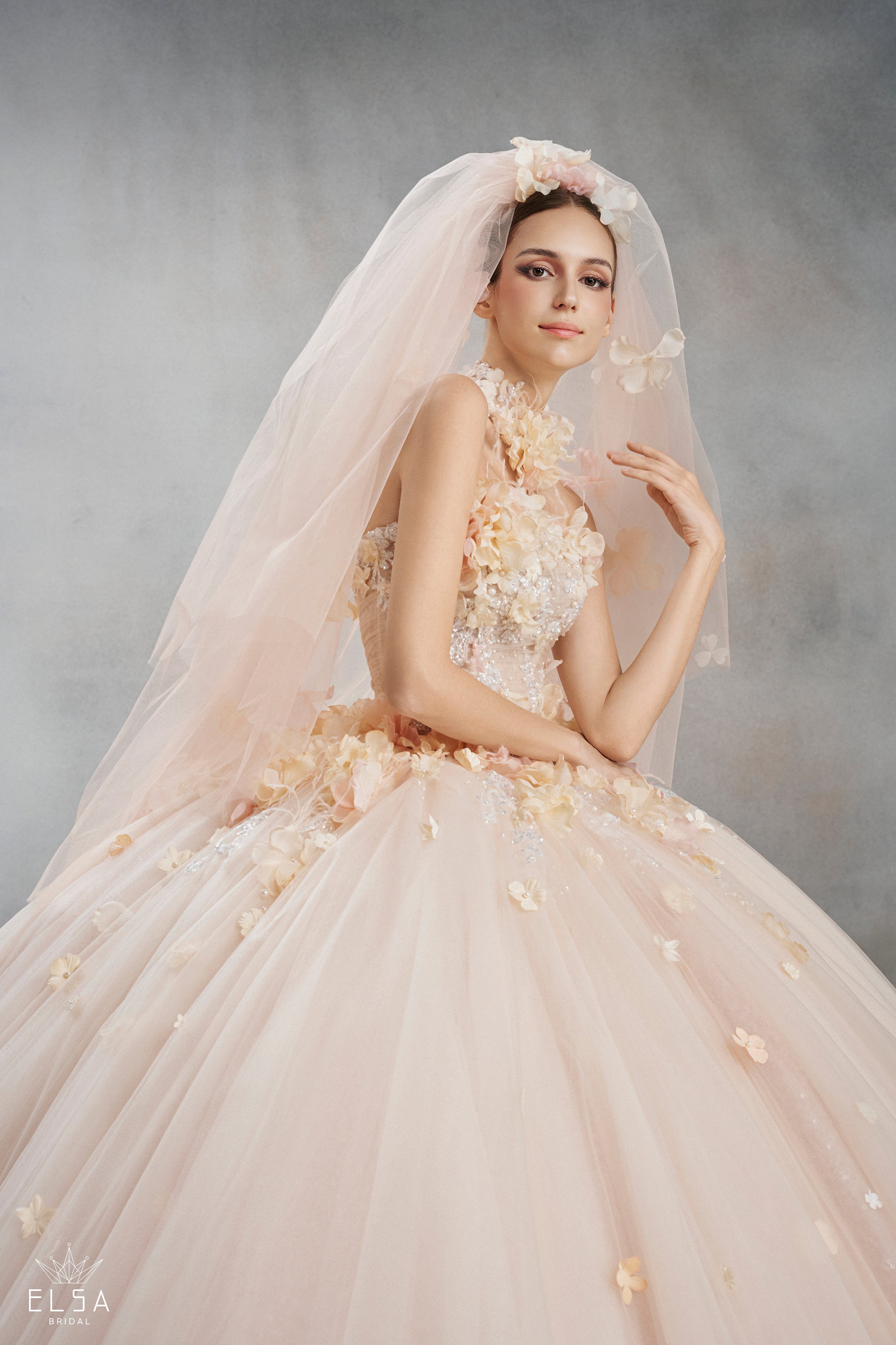 The true magic lies in the grand, sweeping skirt, where cascading silk blooms drift down layers of sun-kissed tulle like fallen petals on a forest floor. As the train unfolds, the 3D florals create a stunning trail of dimension and movement. Crowned with a matching floral-accented veil, this gown is designed for the bride who wants to embody a modern-day fairytale—ethereal, blooming, and profoundly beautiful.