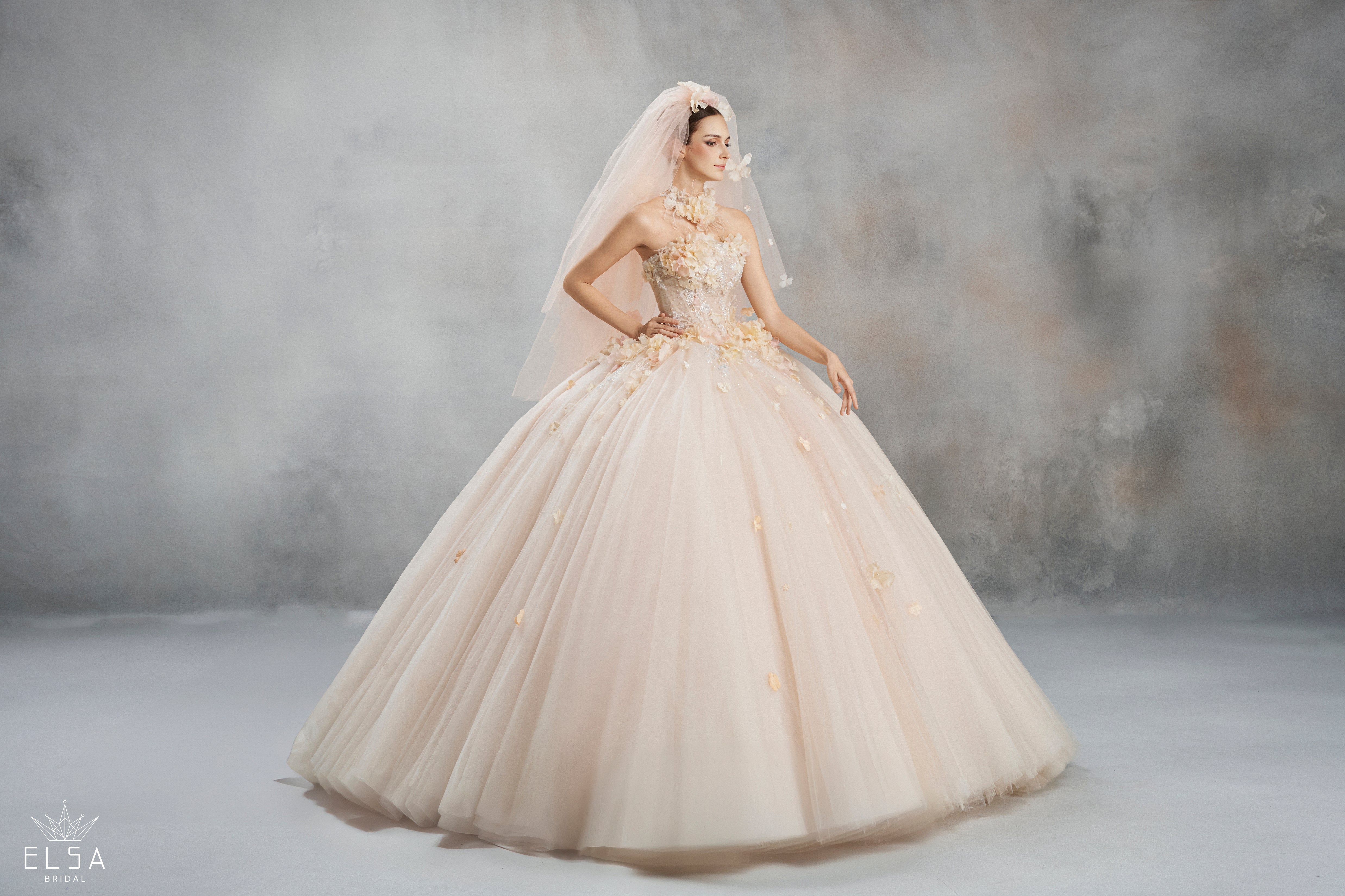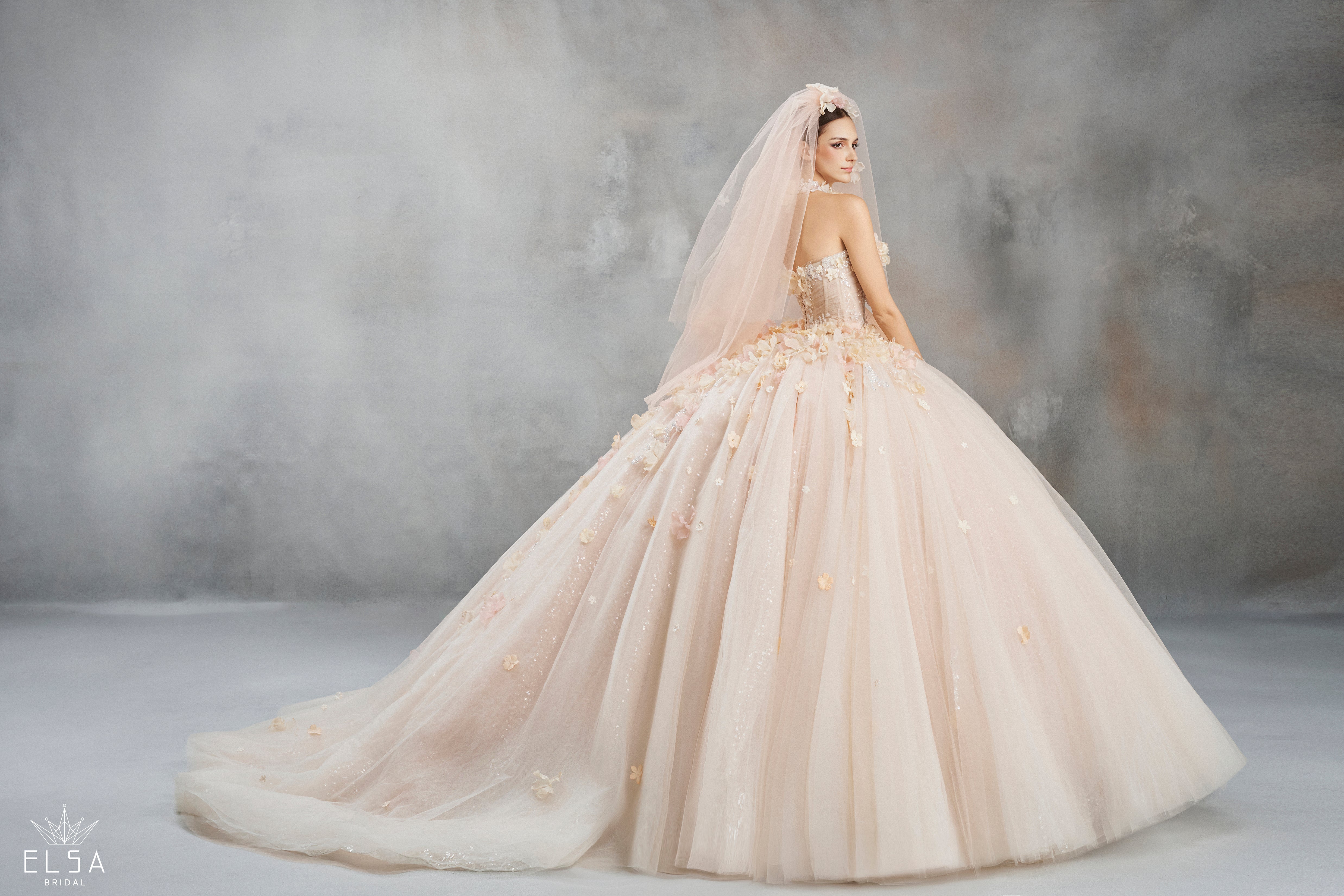 Like a garden awakening under the first light of dawn, this strapless sweetheart ball gown is a breathtaking celebration of botanical romance. The bodice is a masterpiece of texture, featuring a plunging sweetheart neckline encrusted with an intricate tapestry of 3D floral appliqués and shimmering crystal vines. Dipping into a romantic champagne-blush palette, the gown radiates a warmth that is both sophisticated and whimsical.