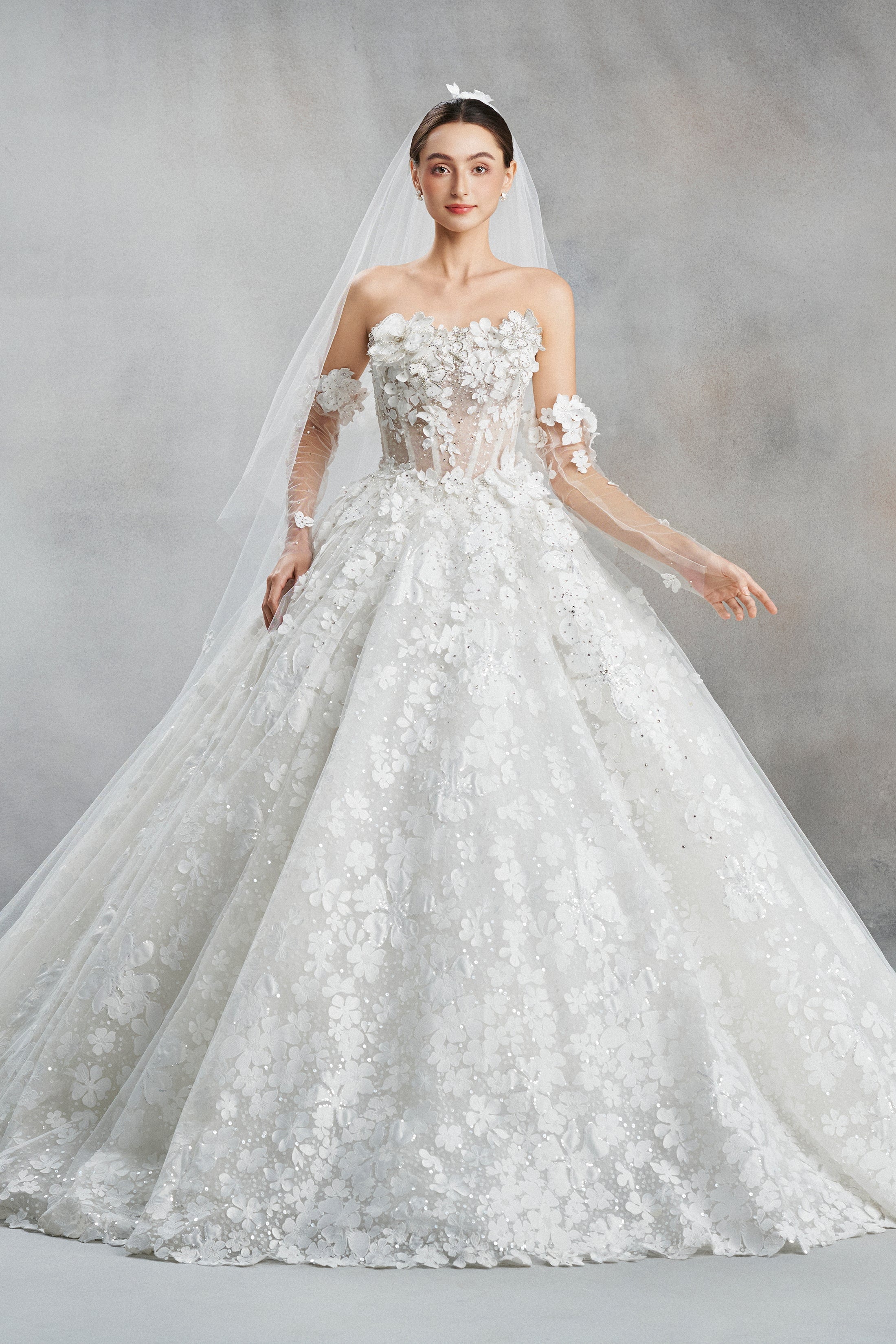 Stepping out from a winter fairytale, this strapless sweetheart ball gown is a breathtaking display of delicate texture and crystalline light. The bodice features a masterfully sculpted corset with sheer illusion panels and exposed boning, creating a modern, high-fashion silhouette. A lush garden of 3D silk floral appliqués blooms across the neckline and waist, cascading down the arms onto ethereal, detachable illusion sleeves that add a touch of mysterious grace.