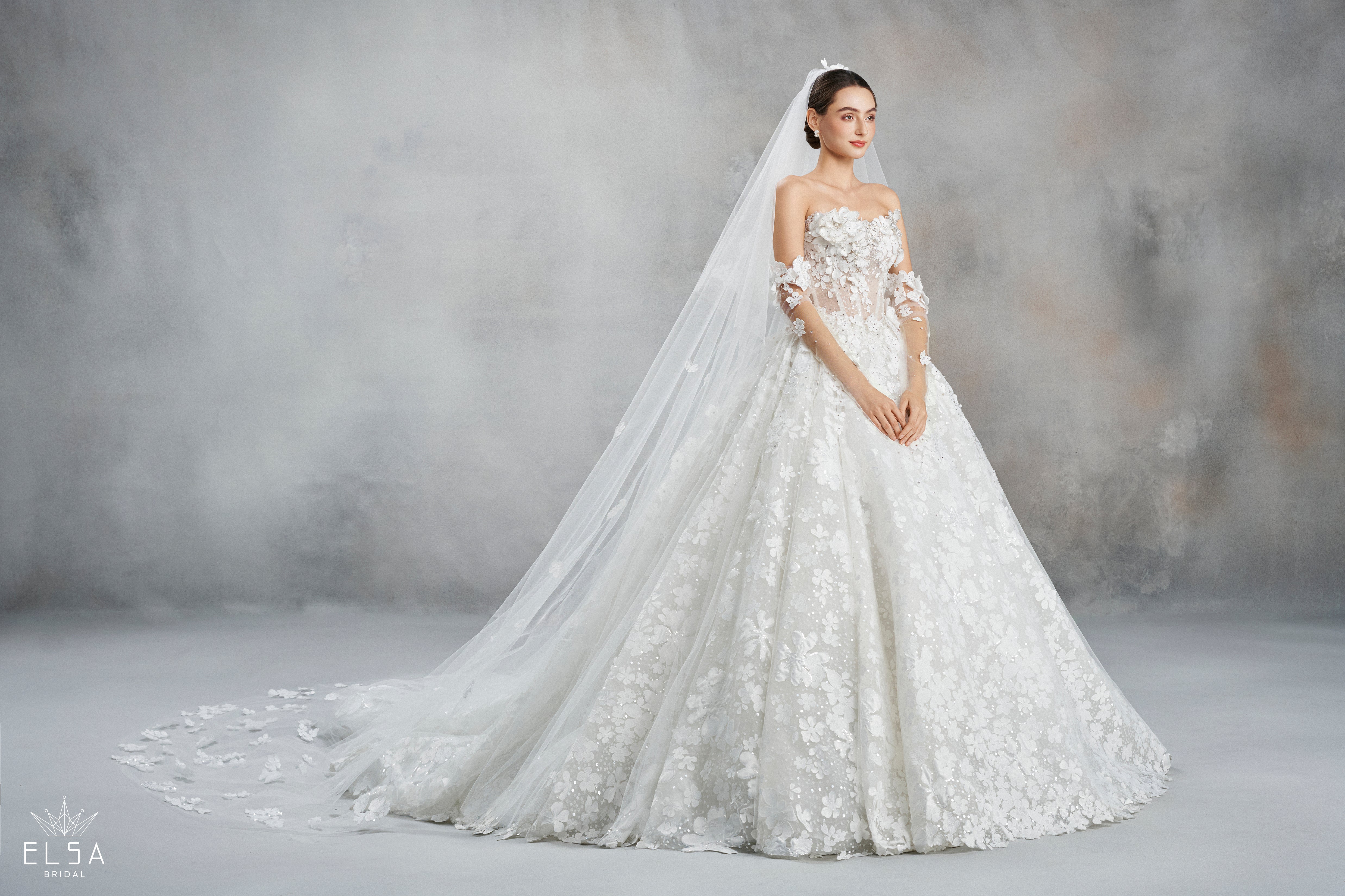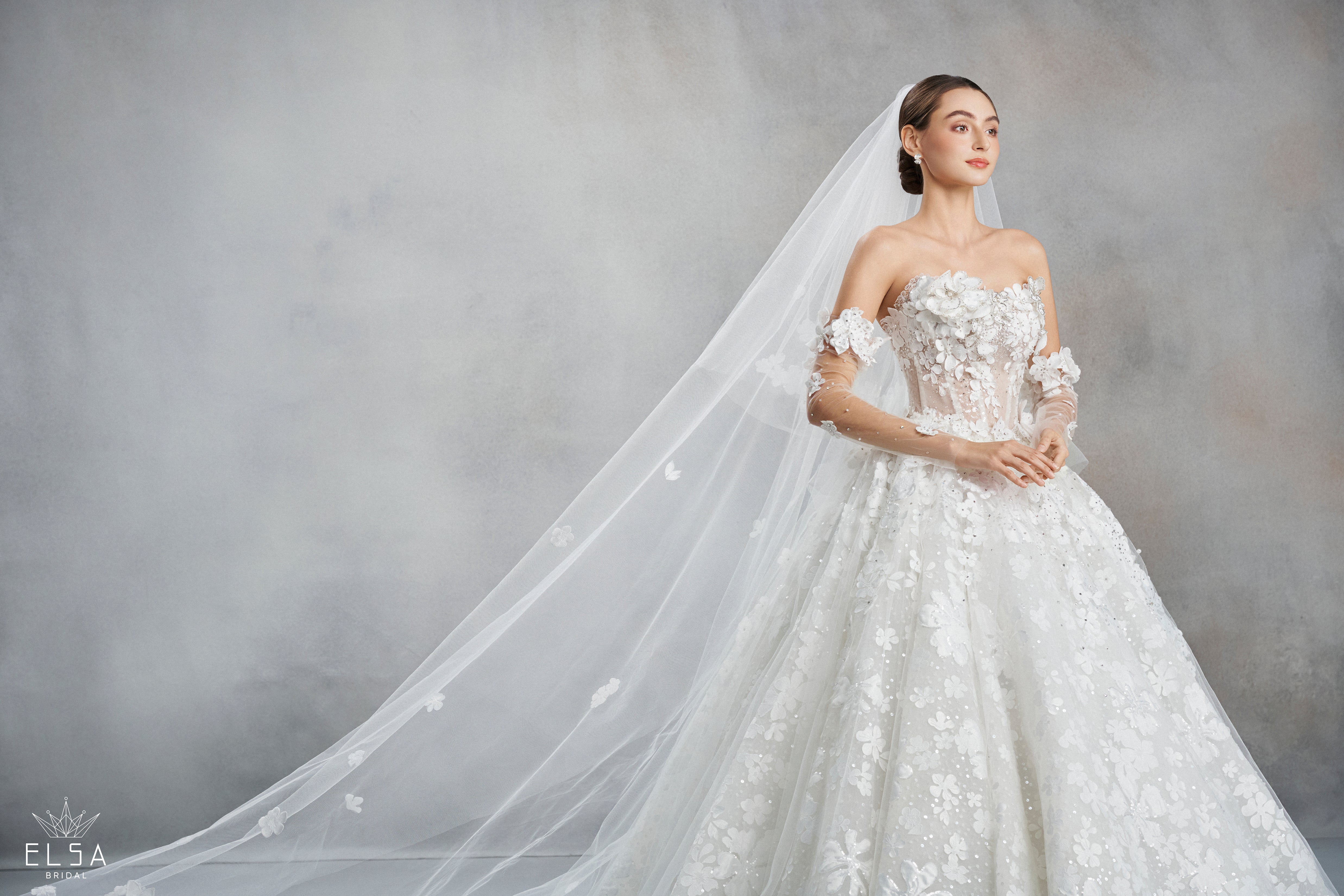 Grand Cathedral Silhouette: A dramatic, multi-layered skirt designed to create a striking royal entrance.
