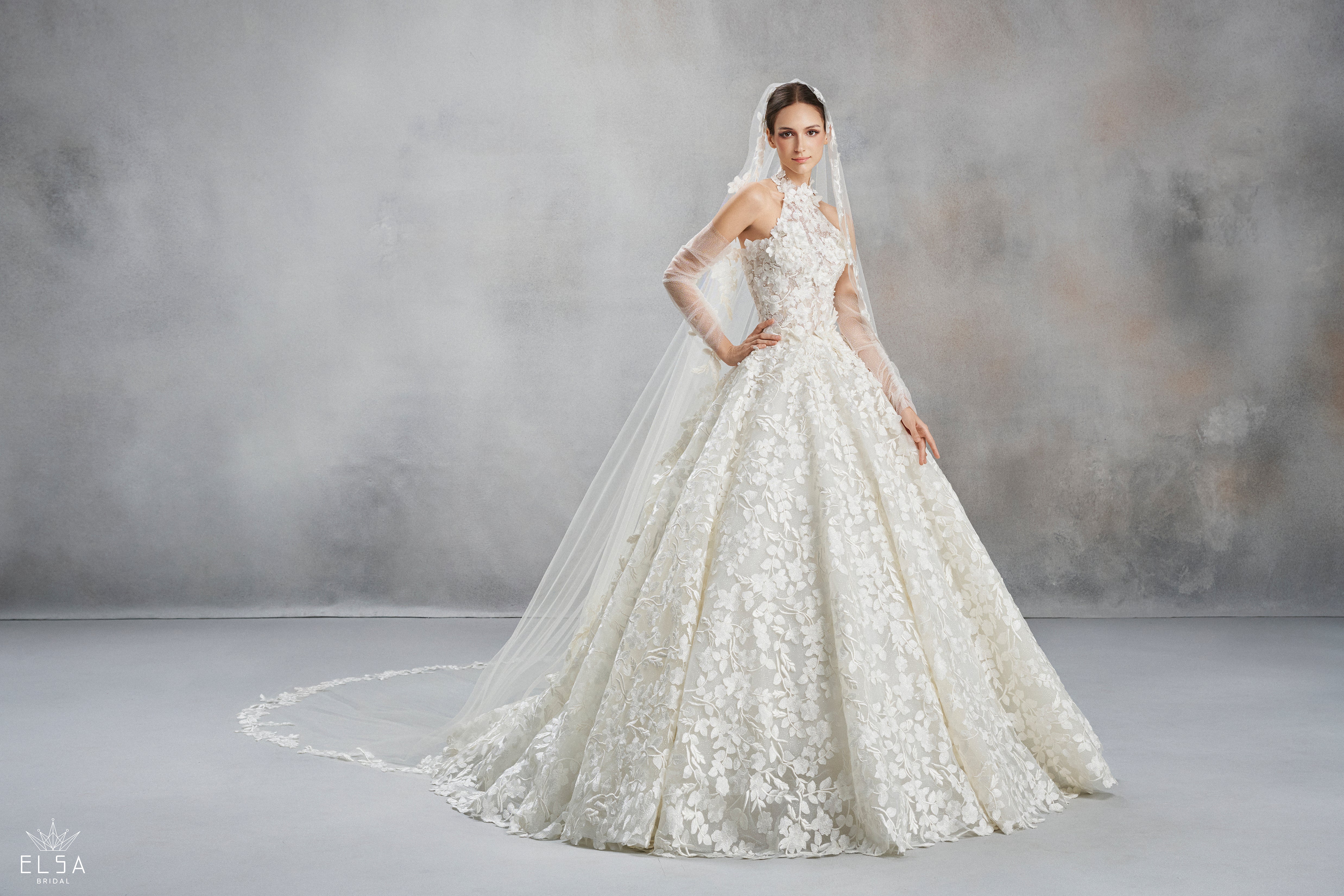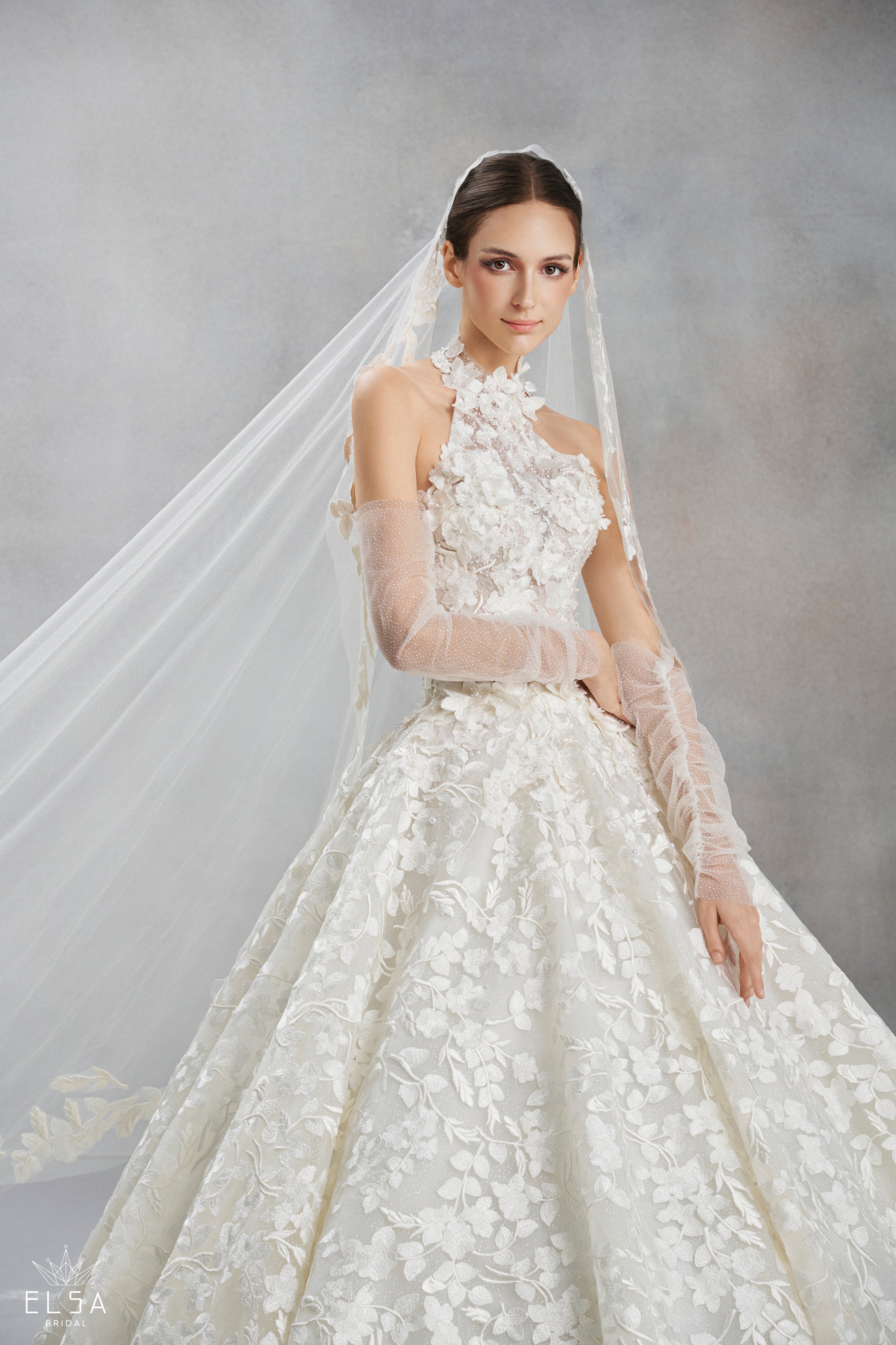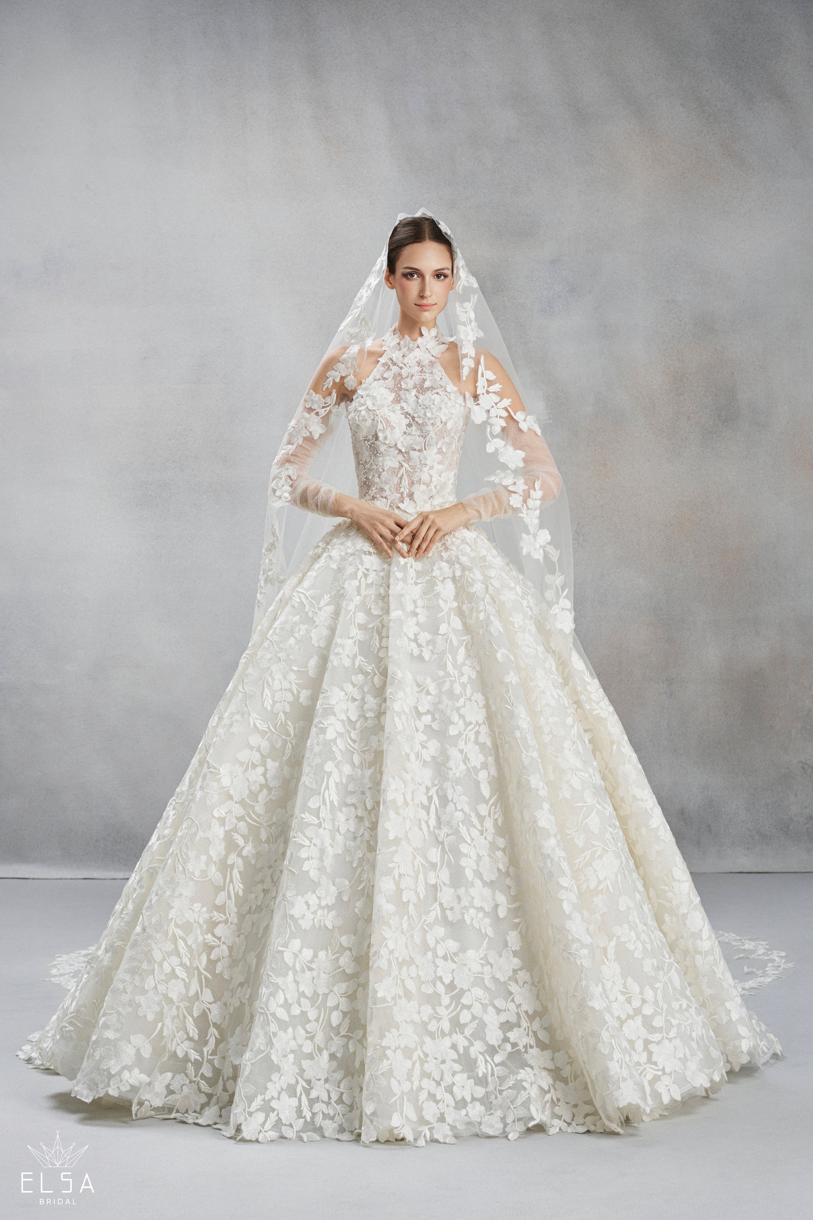 A breathtaking tribute to timeless grace and botanical artistry, this high-neck ball gown is a vision of pure, ethereal elegance. The design features a sophisticated halter-style high neckline that flows seamlessly into slender illusion long sleeves, creating a "second-skin" effect. Every inch of the sheer bodice is intricately adorned with cascading floral lace and vine motifs, which appear to bloom naturally across the shoulders and arms, evoking the romantic charm of a hidden garden in spring.