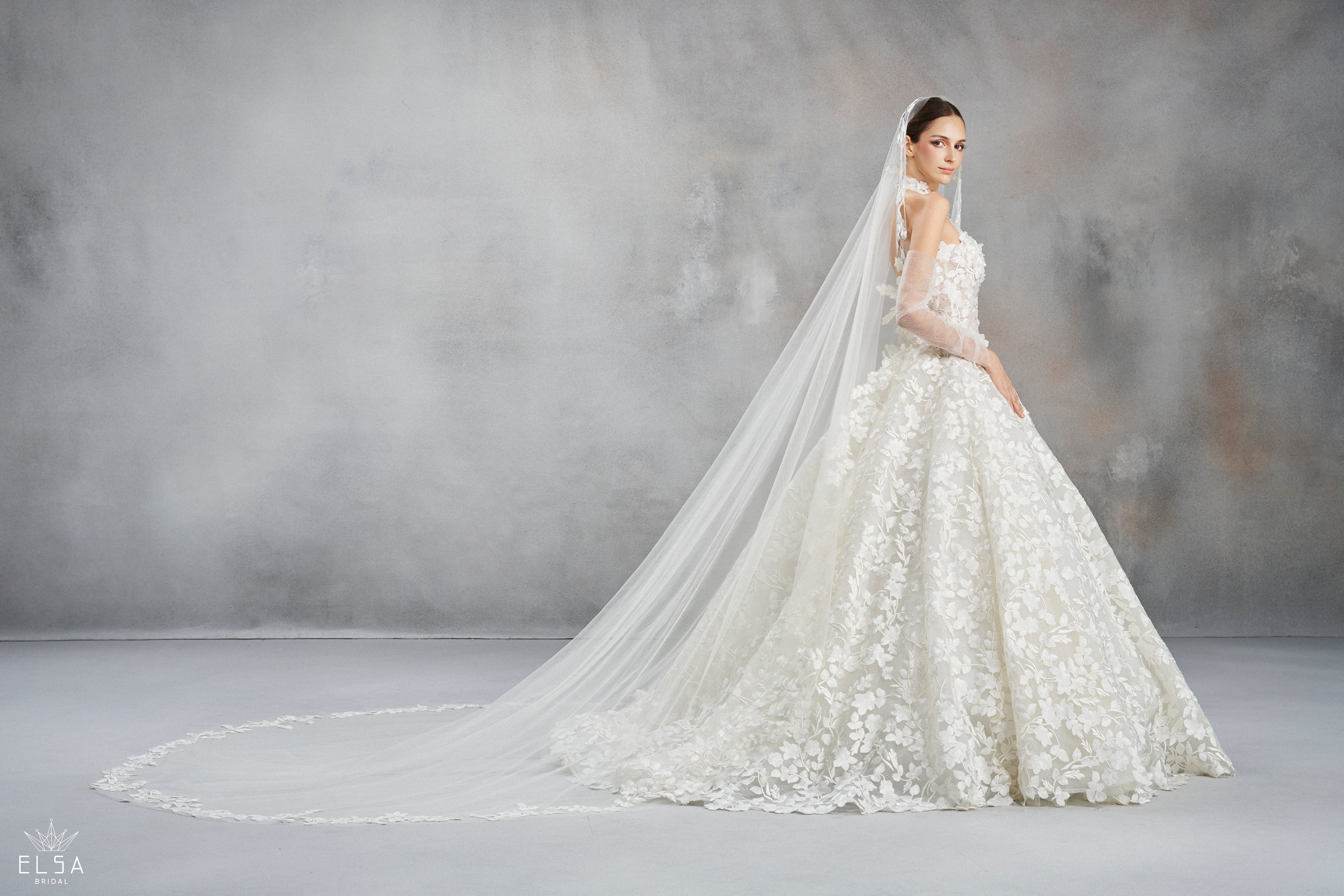 The gown transitions into a majestic, ultra-voluminous skirt that captures the perfect balance between structure and movement. Thousands of delicate lace appliqués are hand-stitched across layers of shimmering tulle, creating a rich, multi-dimensional texture that radiates a soft, ivory glow. Paired with a cathedral-length veil bordered in matching floral lace, this gown is designed for the bride who desires a regal, high-coverage look that is both modern and eternally unforgettable.