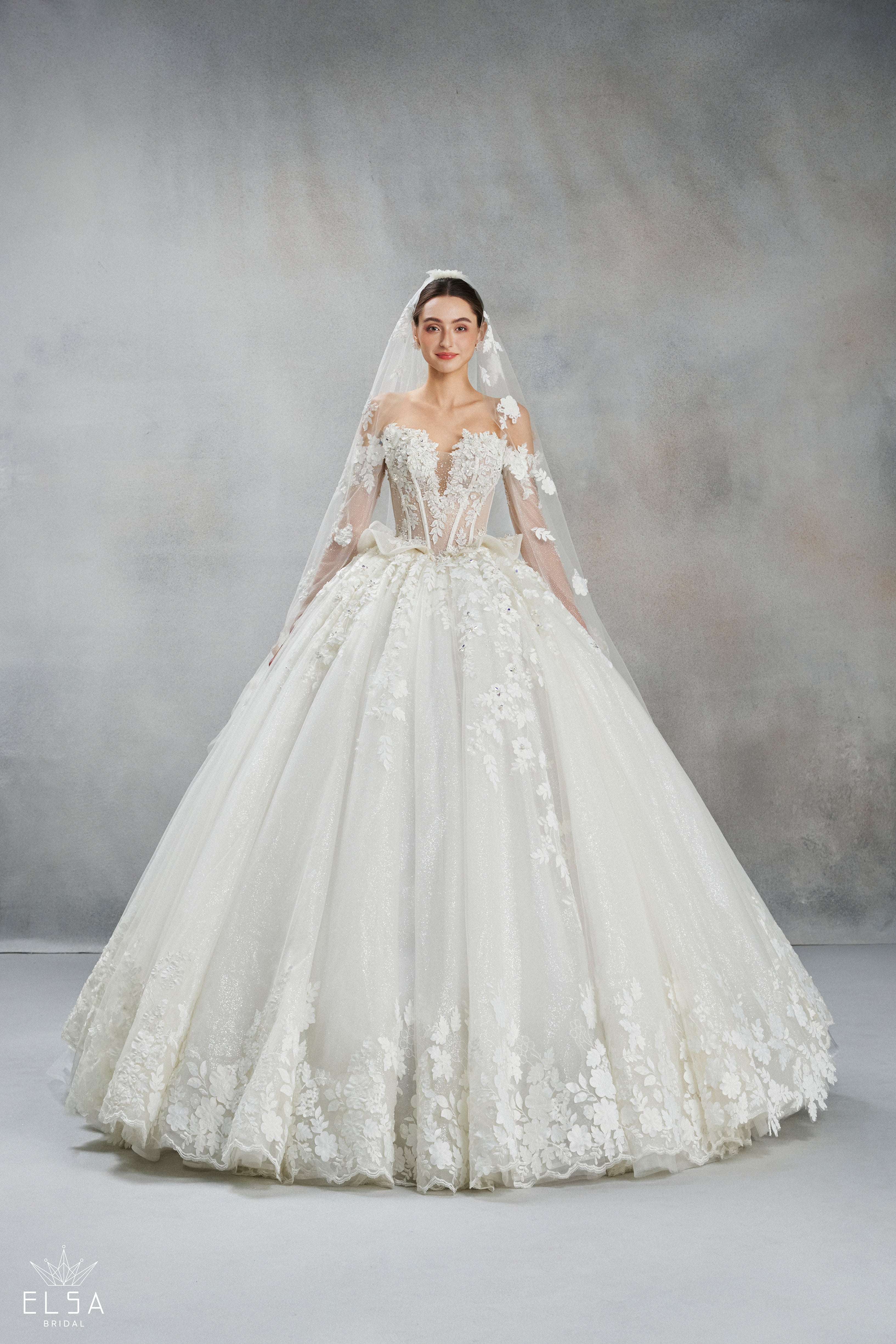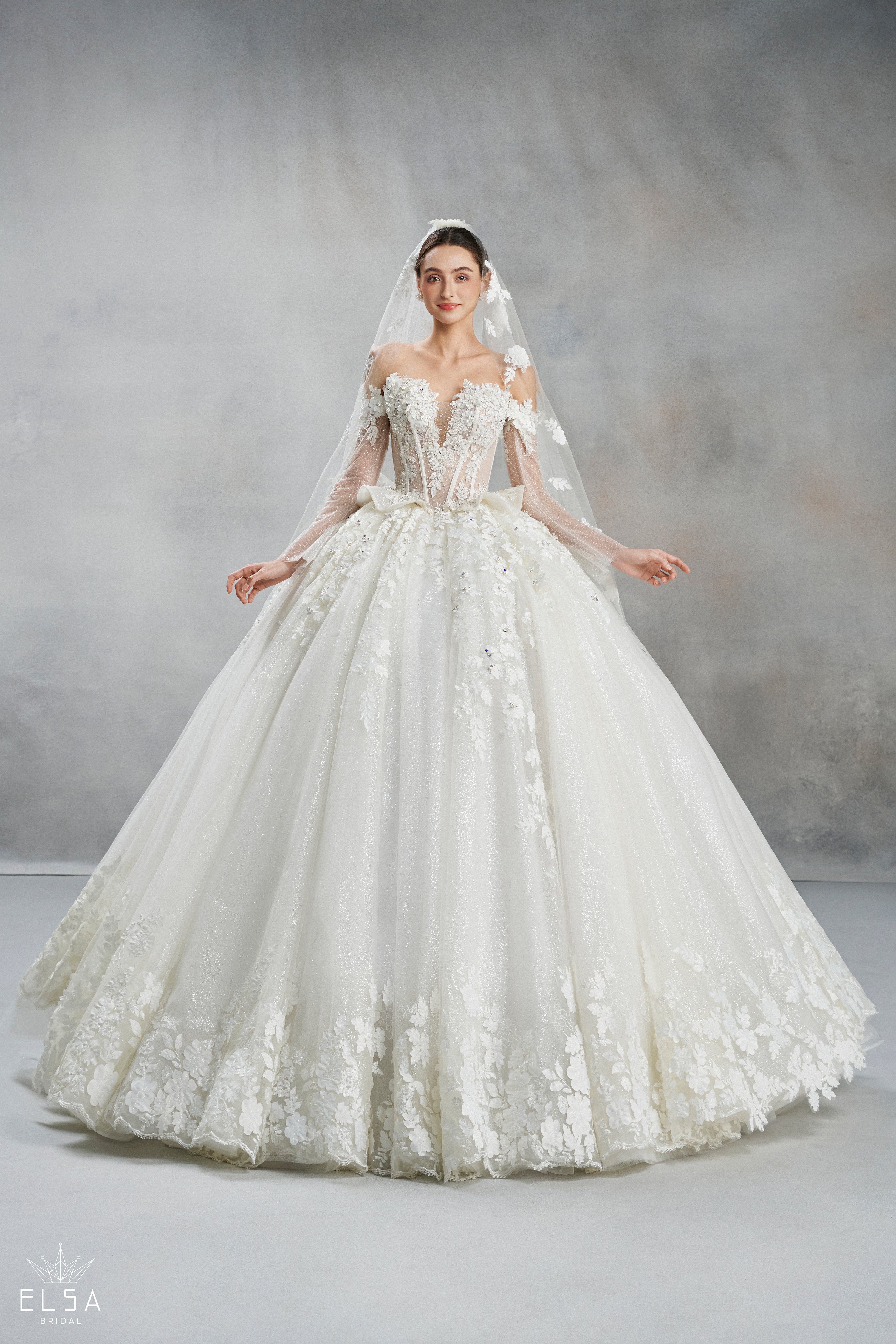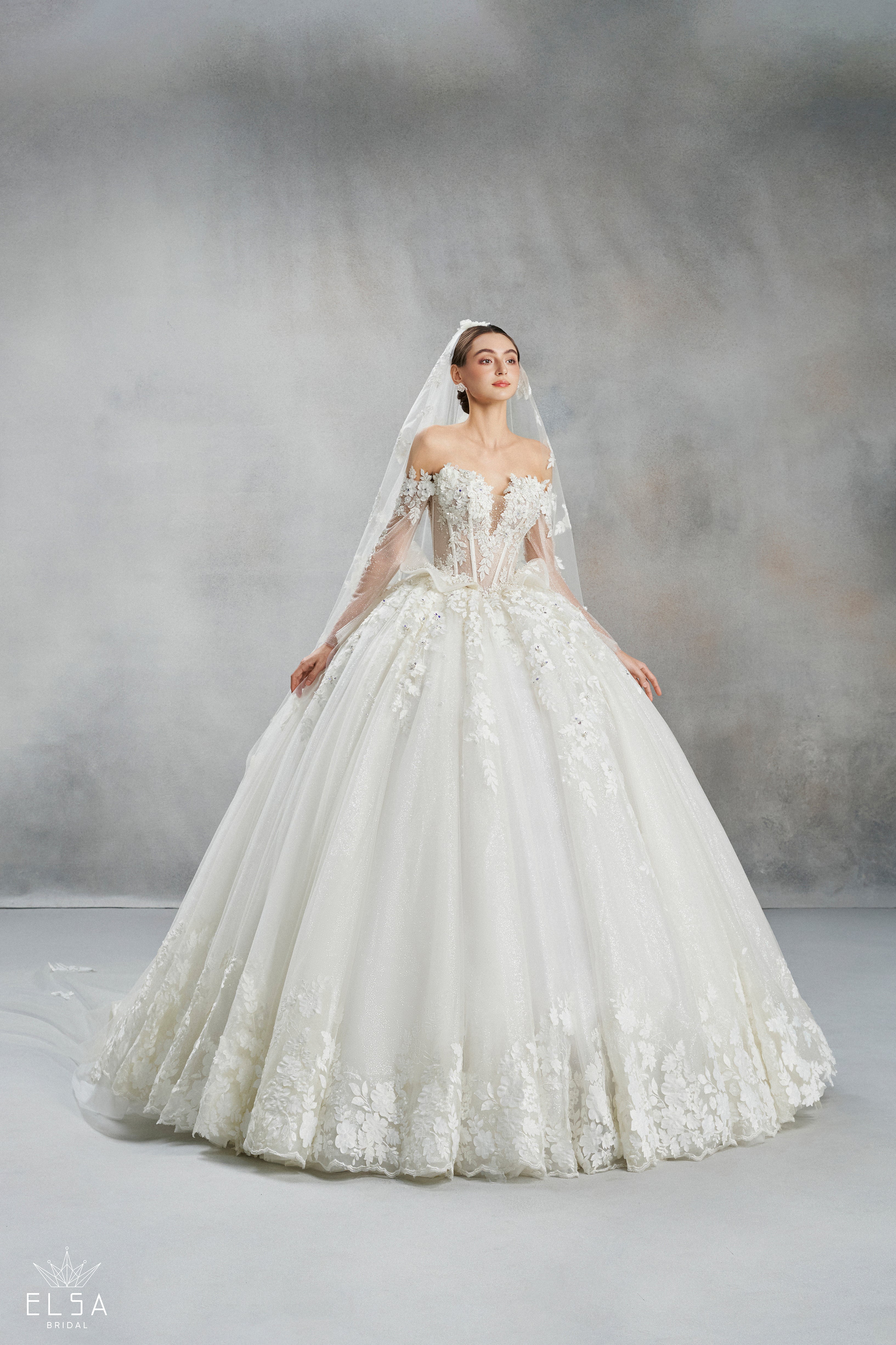 A breathtaking fusion of modern allure and timeless romance, this off-the-shoulder ball gown is a vision of celestial beauty. The gown features a plunging illusion V-neckline framed by delicate, hand-stitched floral appliqués that transition into shimmering, floor-length illusion sleeves. The meticulously sculpted corset bodice, defined by visible haute couture boning and sheer panels, creates a regal silhouette that captures the perfect balance between structure and grace.