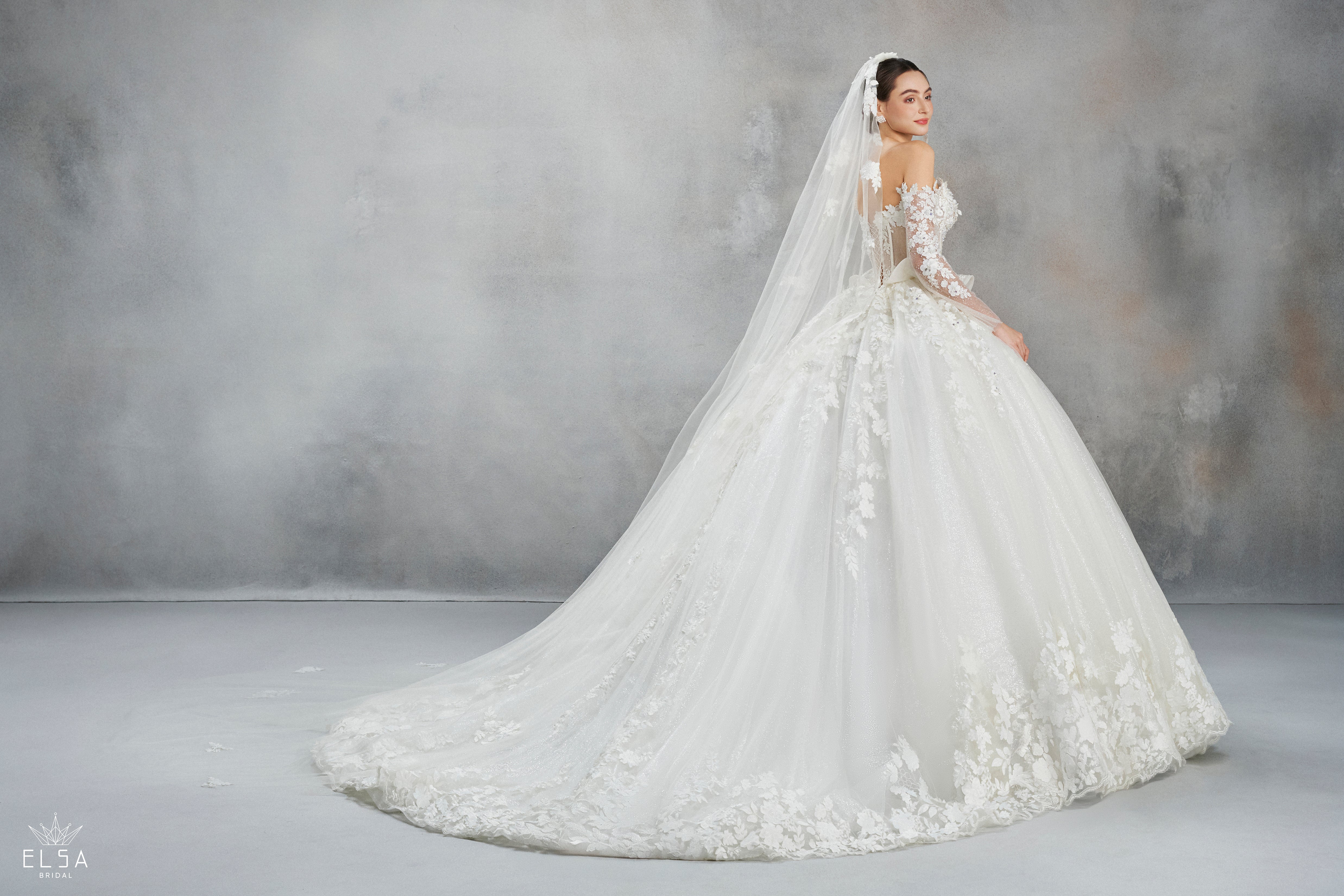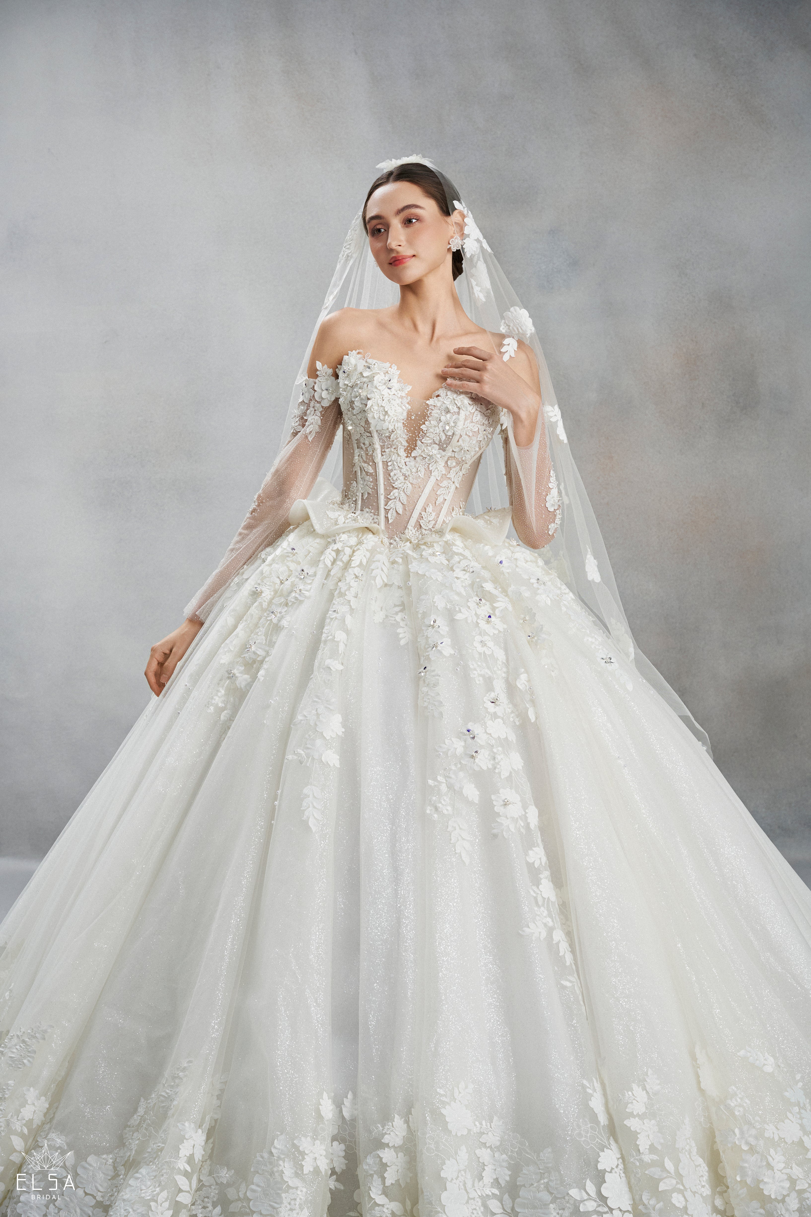 The true magic lies in the grand, ultra-voluminous skirt, where cascading 3D blossoms drift down like fallen petals across a galaxy of shimmering tulle. As the fabric catches the light, a multidimensional glow radiates from every layer, culminating in a magnificent floral-bordered hem. Crowned with a matching ethereal veil scattered with micro-blooms, this gown is designed for the bride who moves with an unforgettable sense of radiance and power.