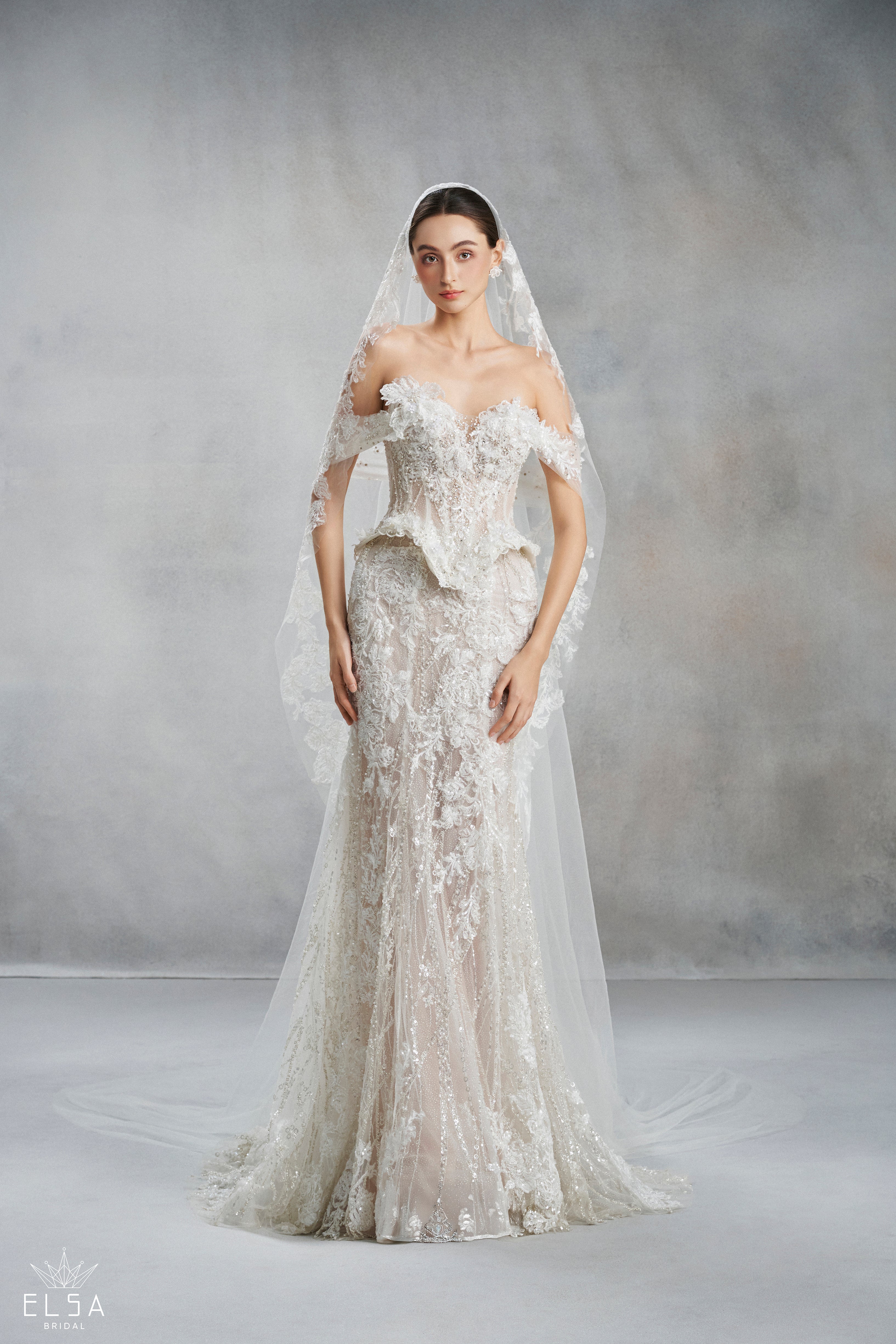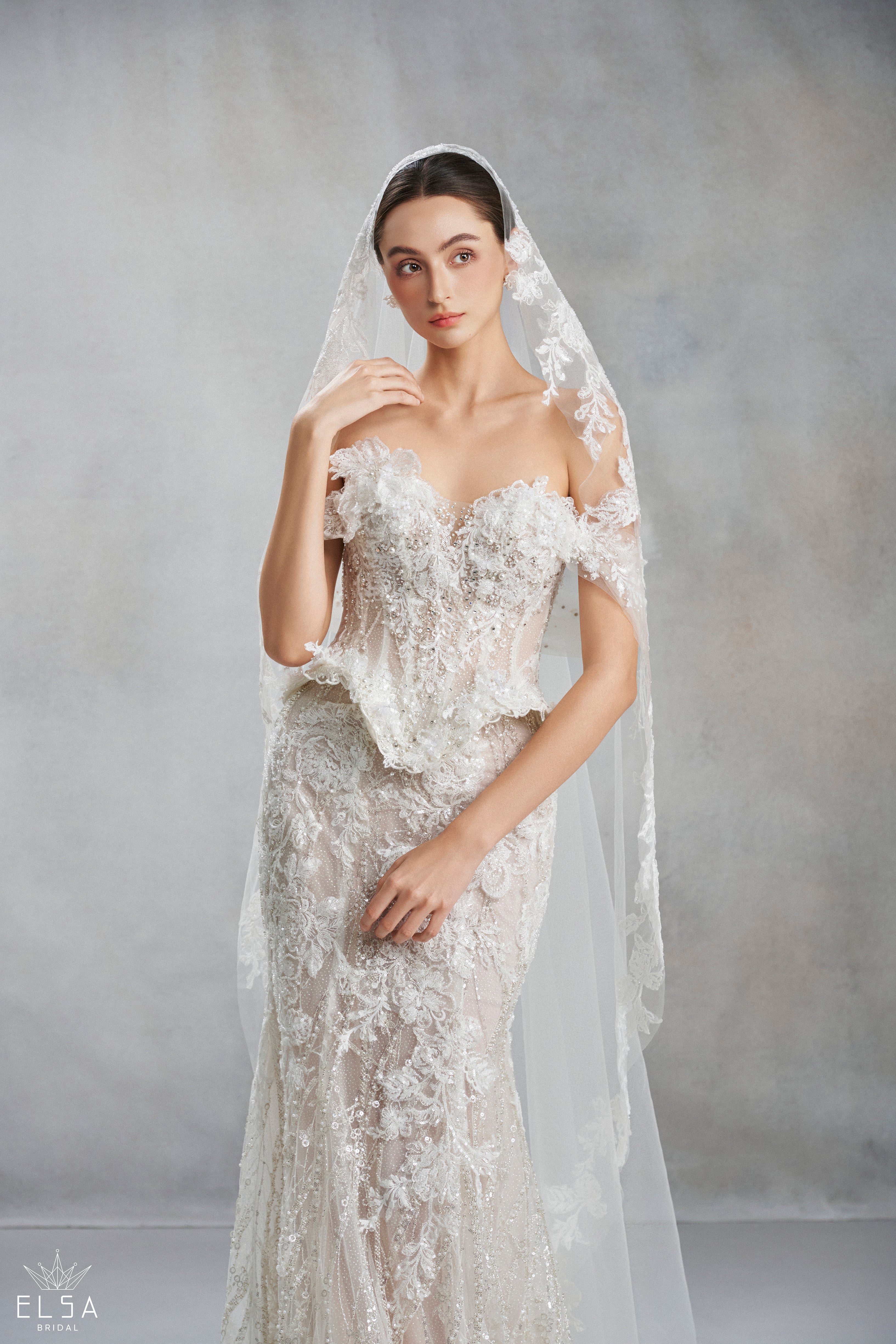 The skirt transitions into a sophisticated mermaid flare, paired with an ethereal, long lace-bordered veil to create an ensemble that is both provocative and regal. This is the ultimate choice for the bride who embraces a sharp, confident beauty and desires to shine brilliantly with every step.