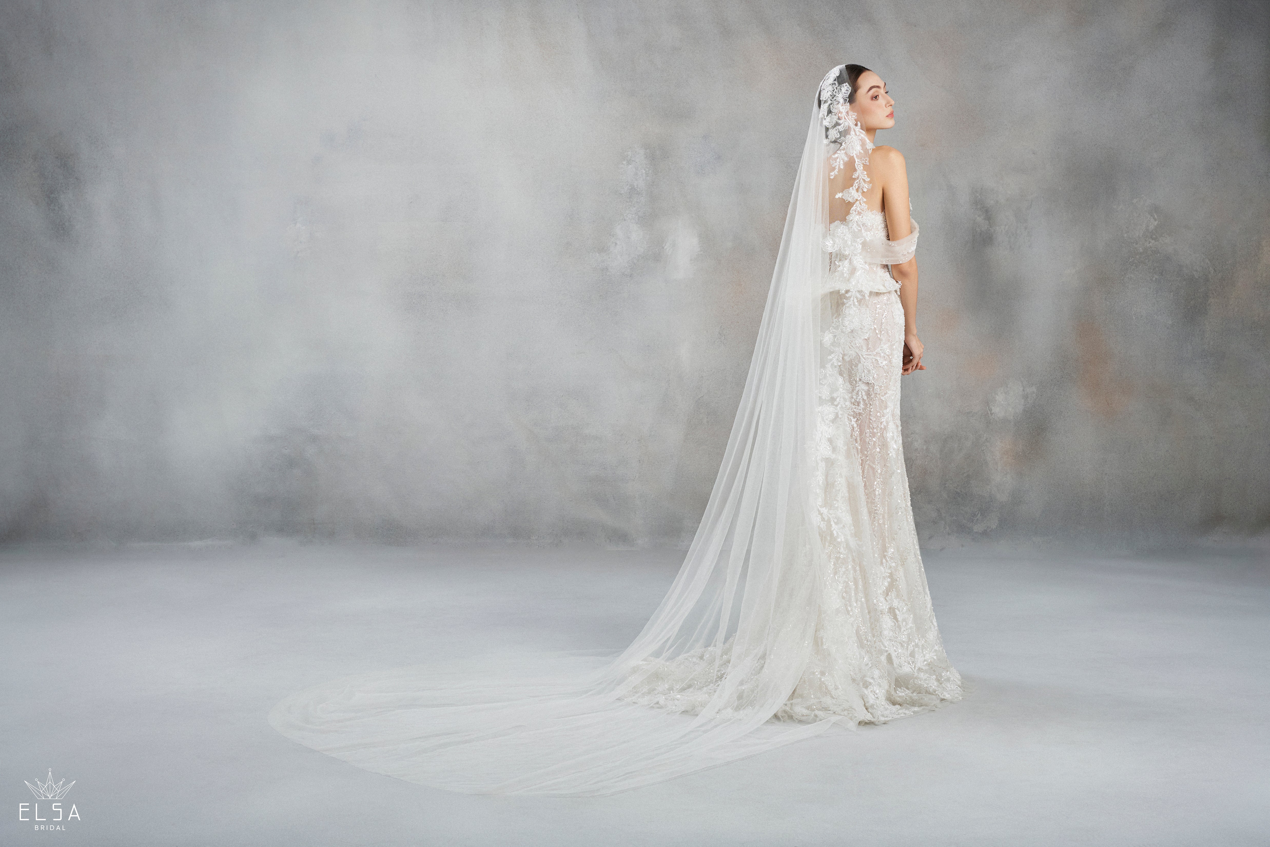 Ethereal Lace-Trimmed Veil: A delicate, sheer veil bordered with hand-stitched lace, enhancing the gown’s romantic and royal aura.