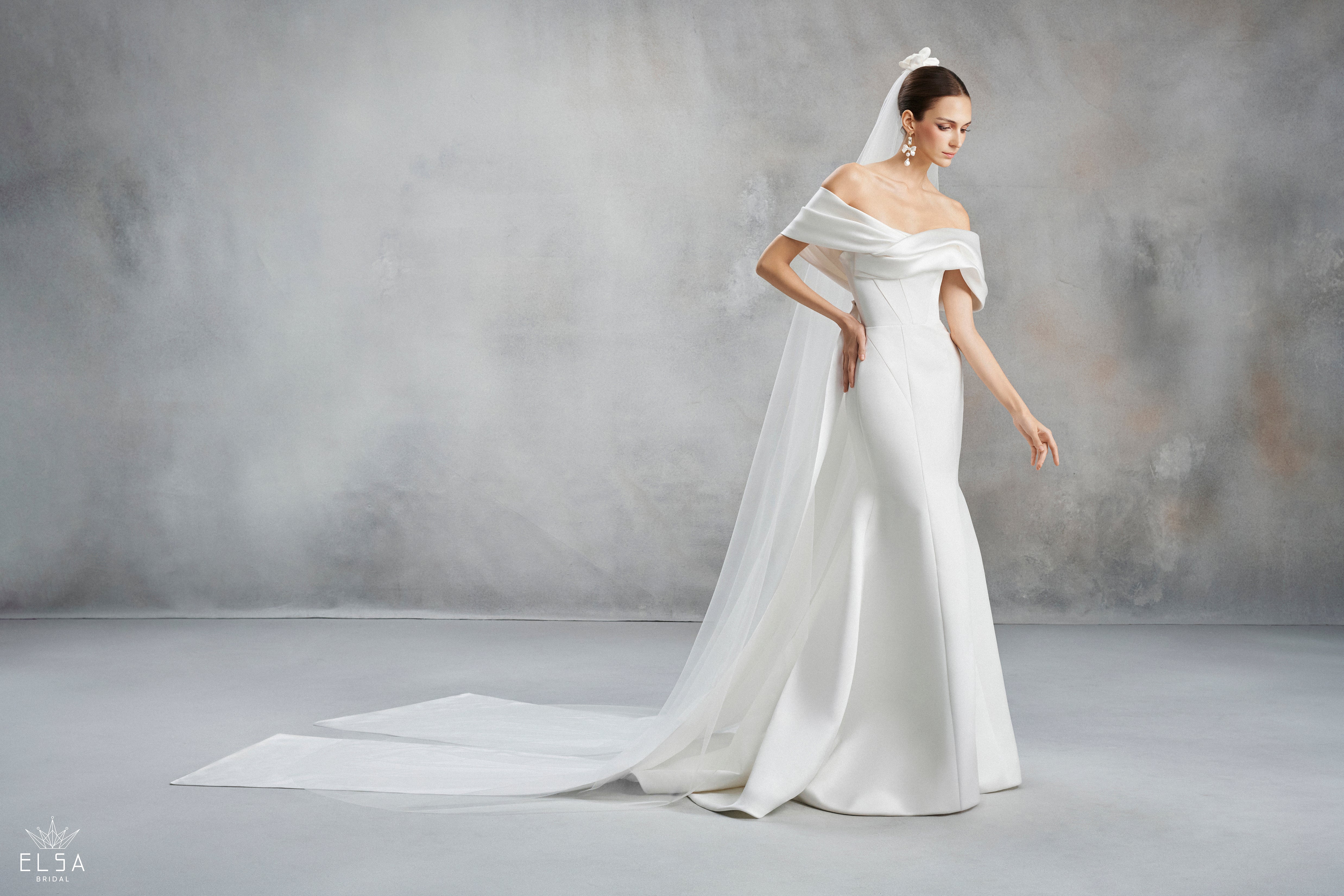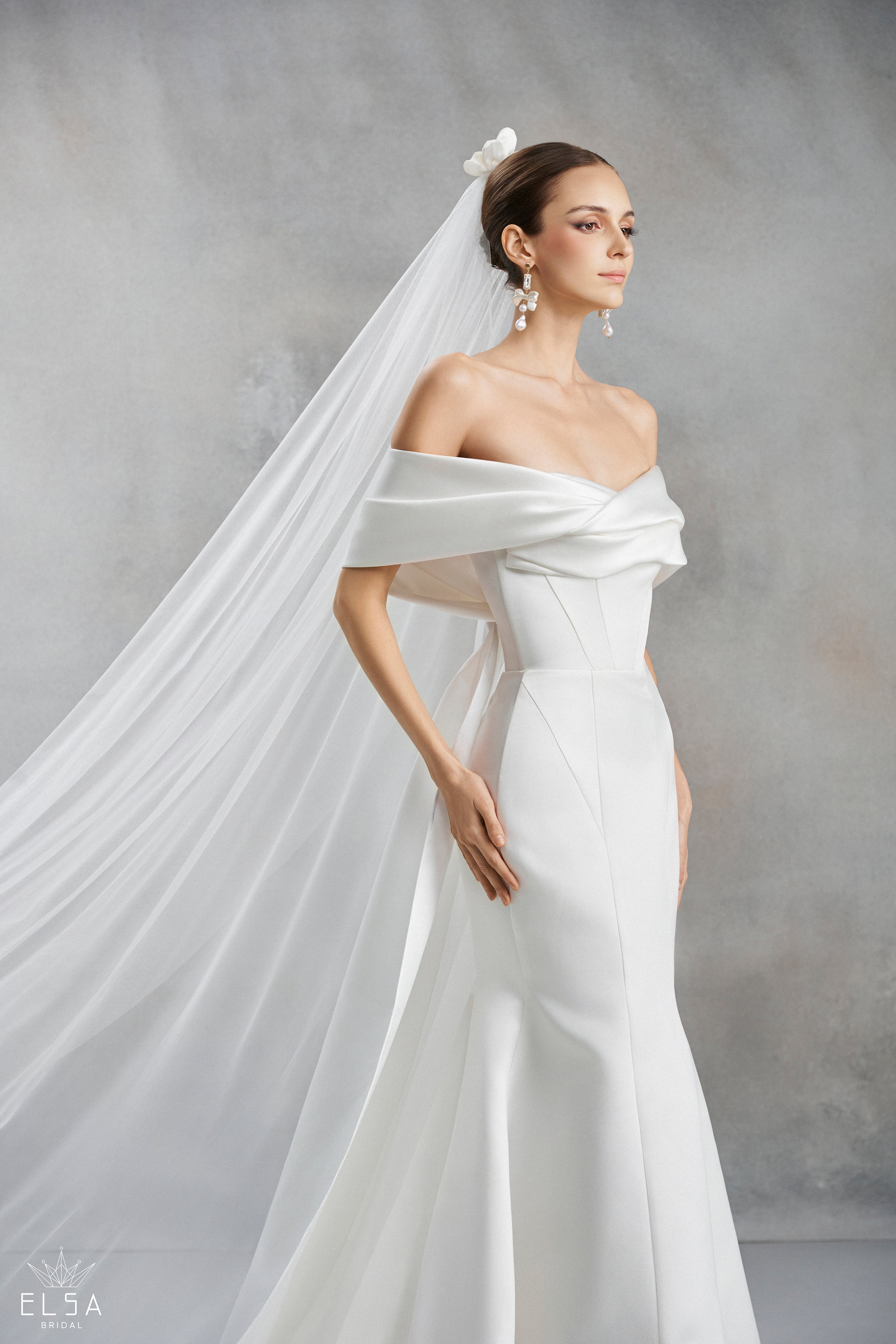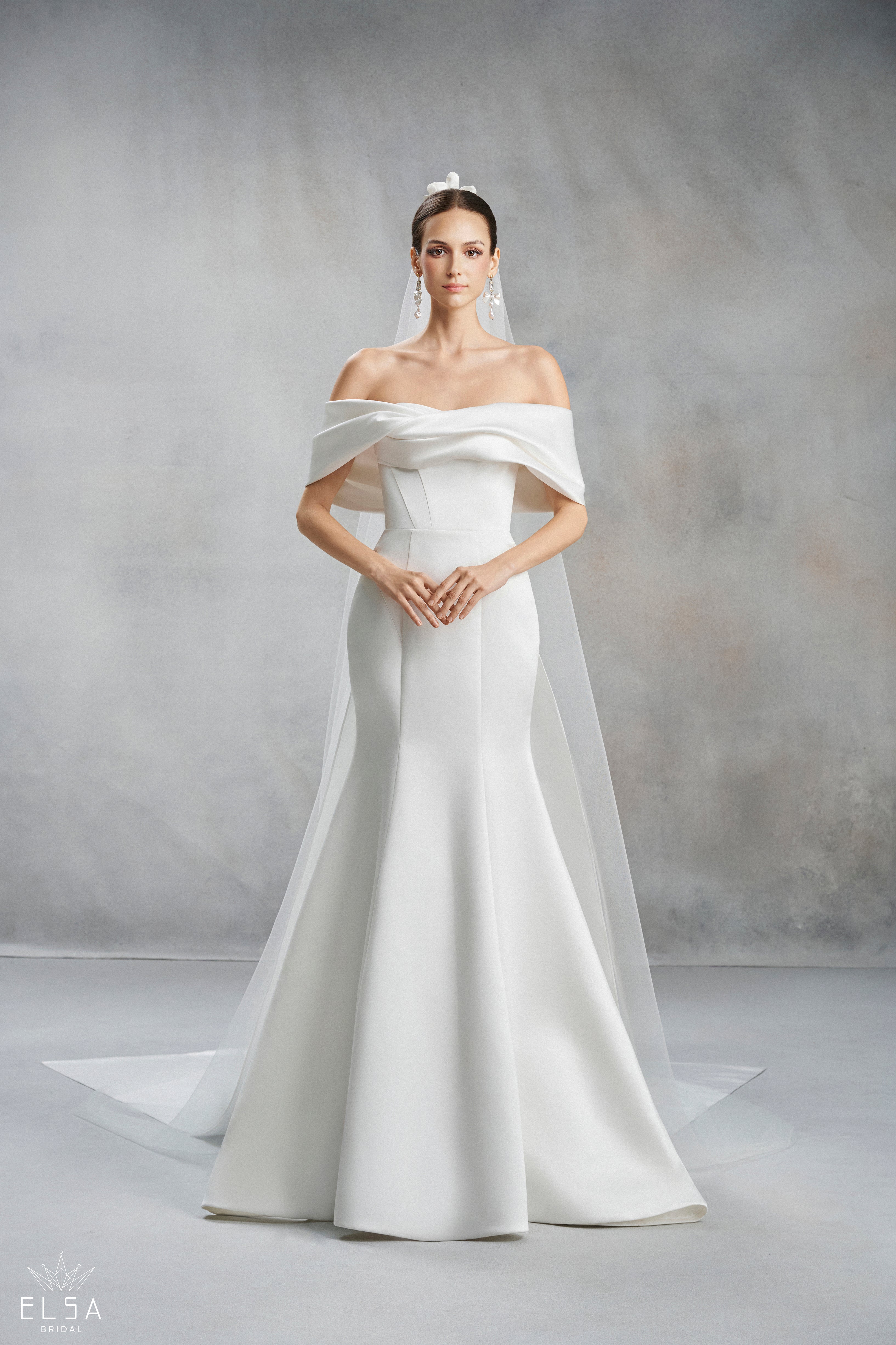 A celebration of pure form and sculptural elegance, this off-the-shoulder trumpet gown is designed for the modern bride who seeks a "less is more" aesthetic with high-fashion impact. Meticulously crafted from ultra-luxe, heavy-weight Mikado satin, the gown features a luminous, pearlescent sheen that radiates sophisticated luxury. The highlight is the artfully draped off-the-shoulder wrap, which creates a soft, voluminous fold around the arms and neckline, beautifully framing the collarbone and décolletage.