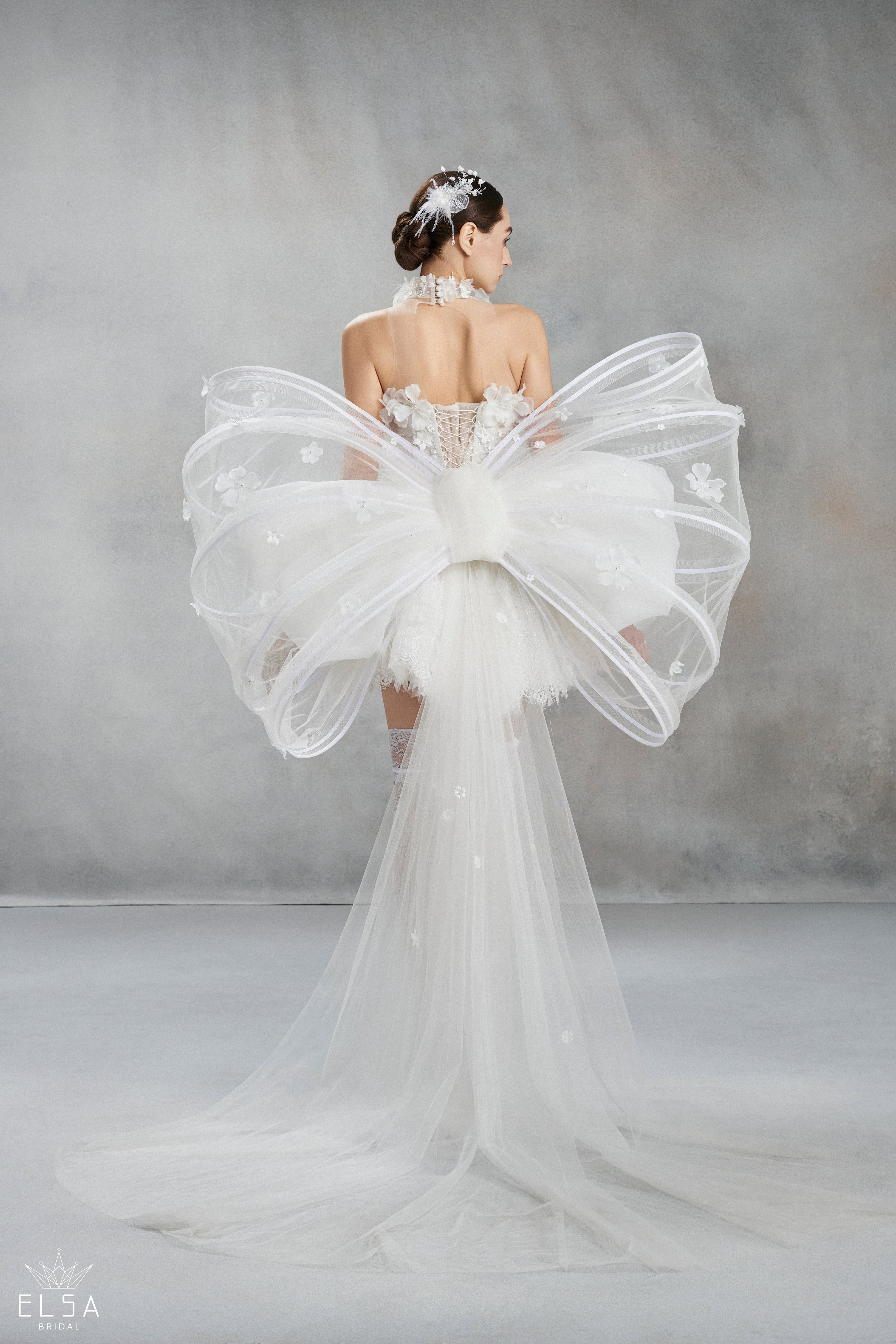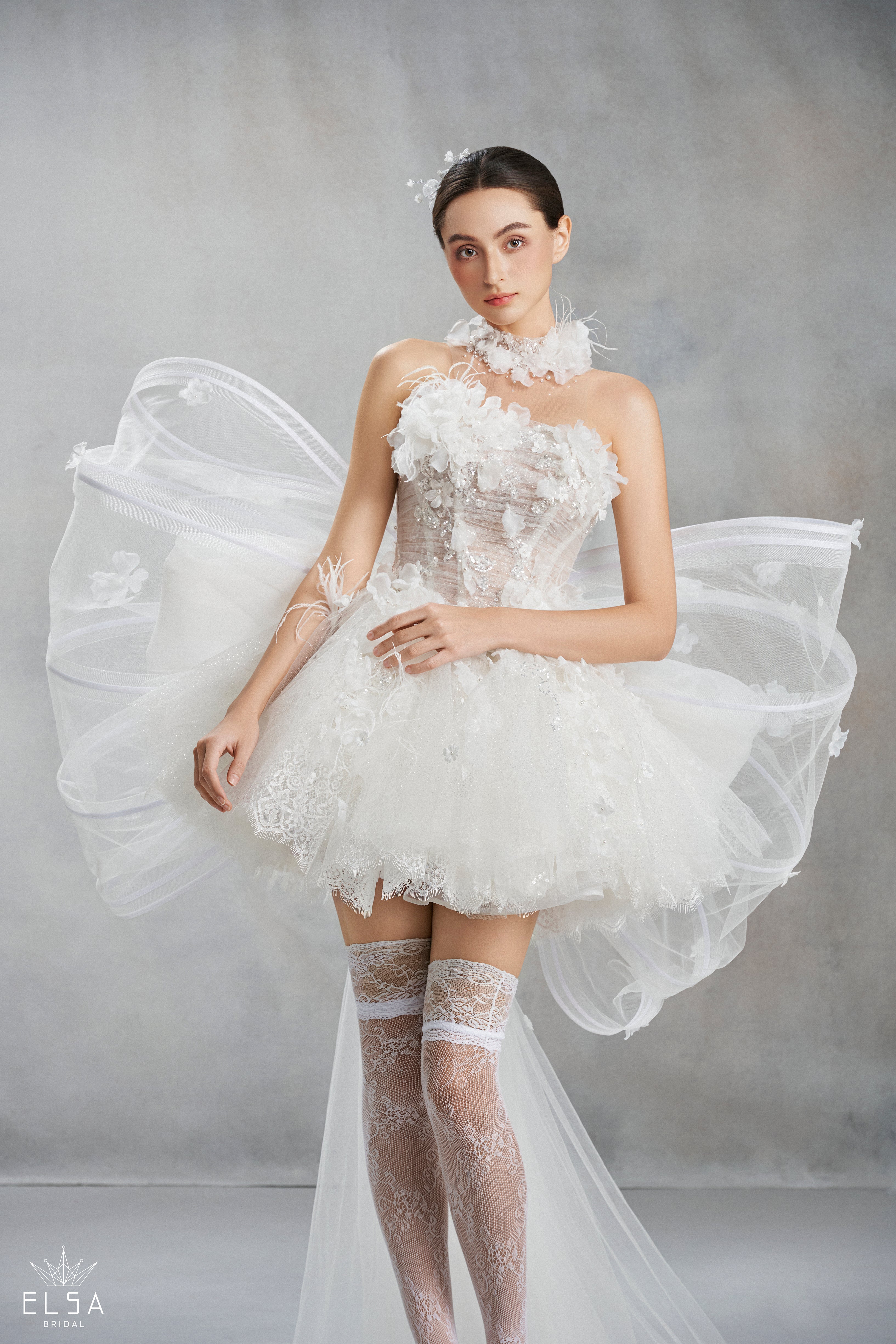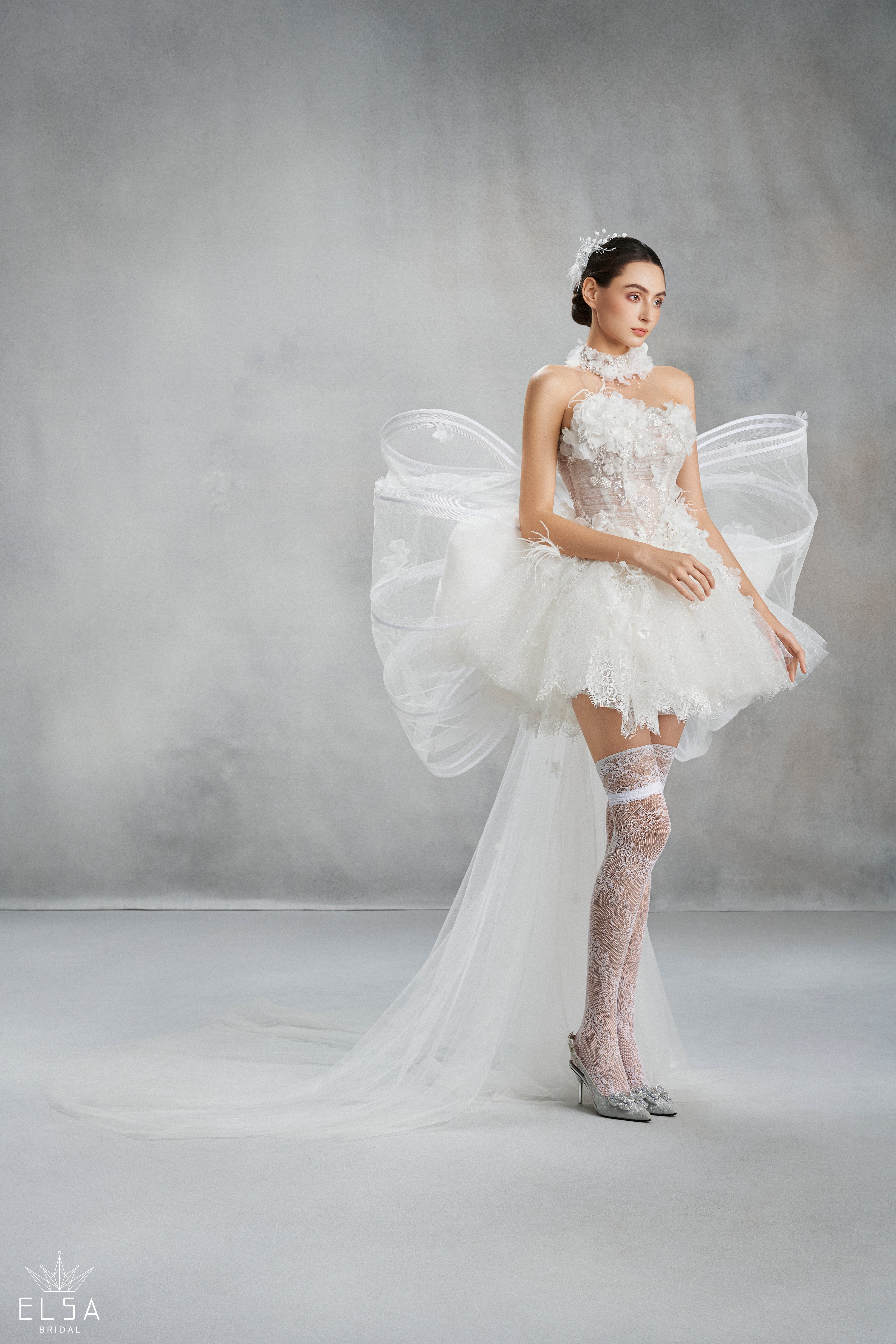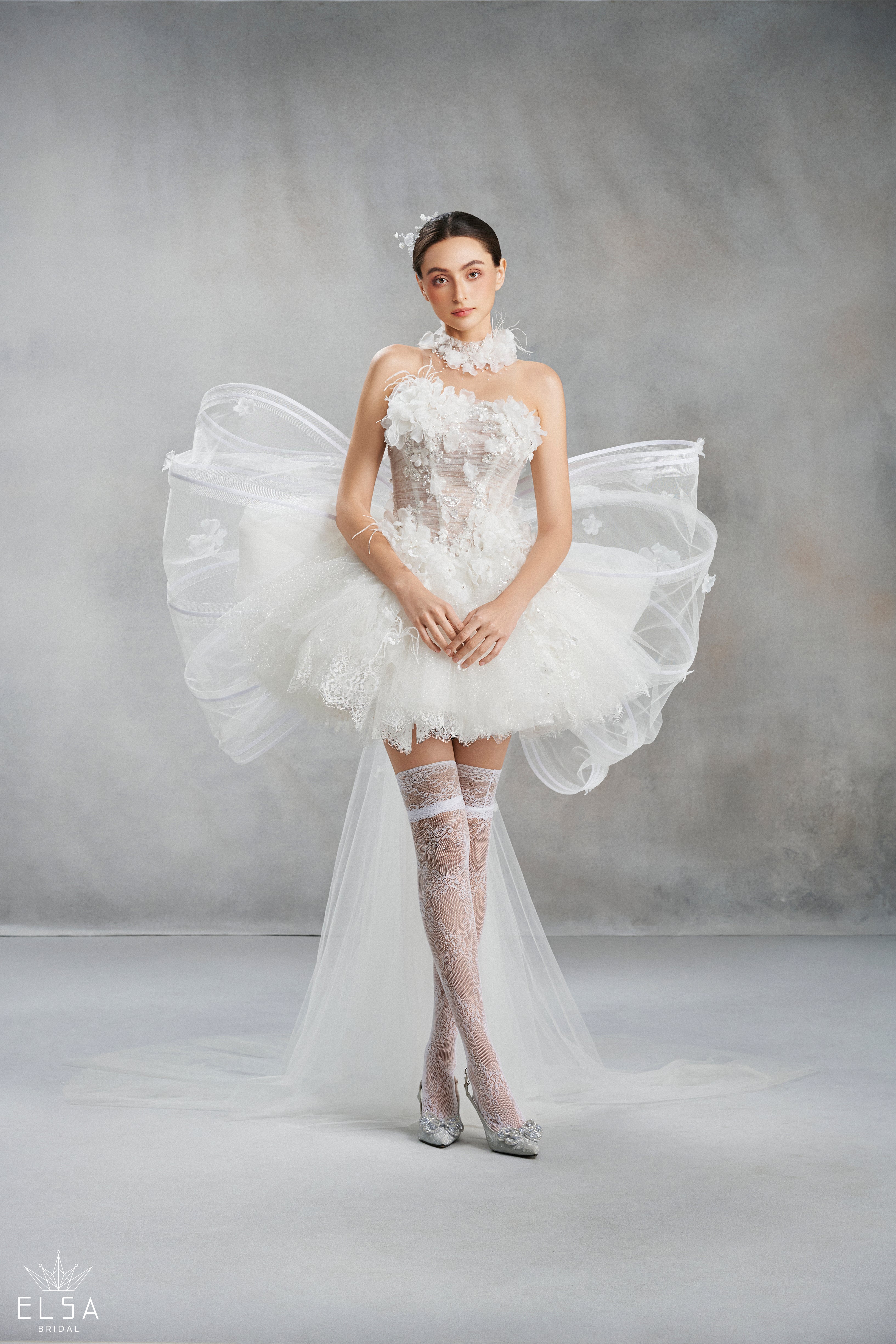 The centerpiece of the design is a sculpted sheer corset, hand-embellished with pristine 3D floral appliqués and soft feathers that create a cloud-like, floating effect. The unique highlight lies in the architectural butterfly wings crafted from rigid illusion tulle, soaring proudly from the back. Styled with baroque-patterned lace stockings, this is the ultimate choice for the trendsetting bride looking to steal the spotlight during an unforgettable after-party.