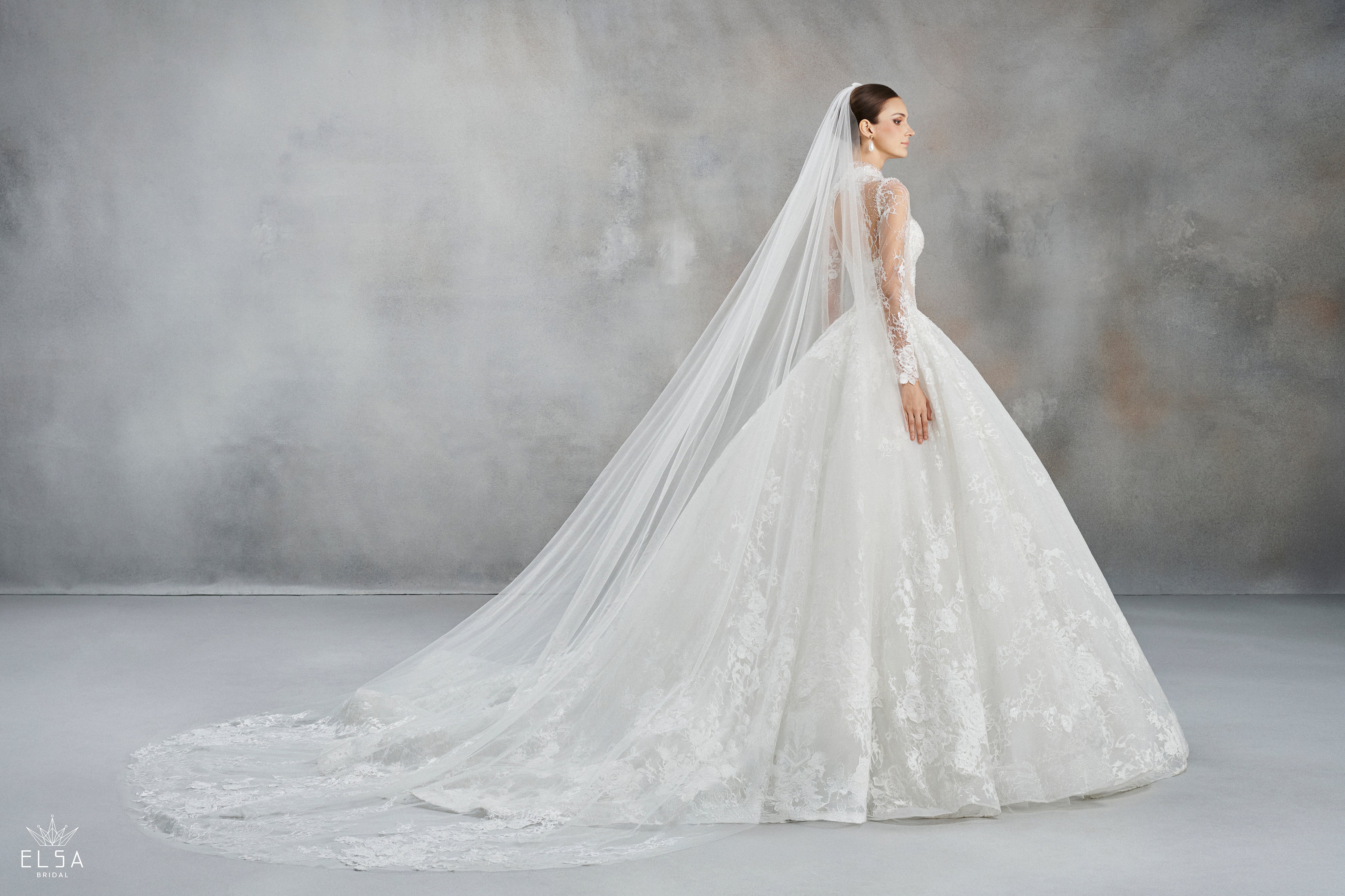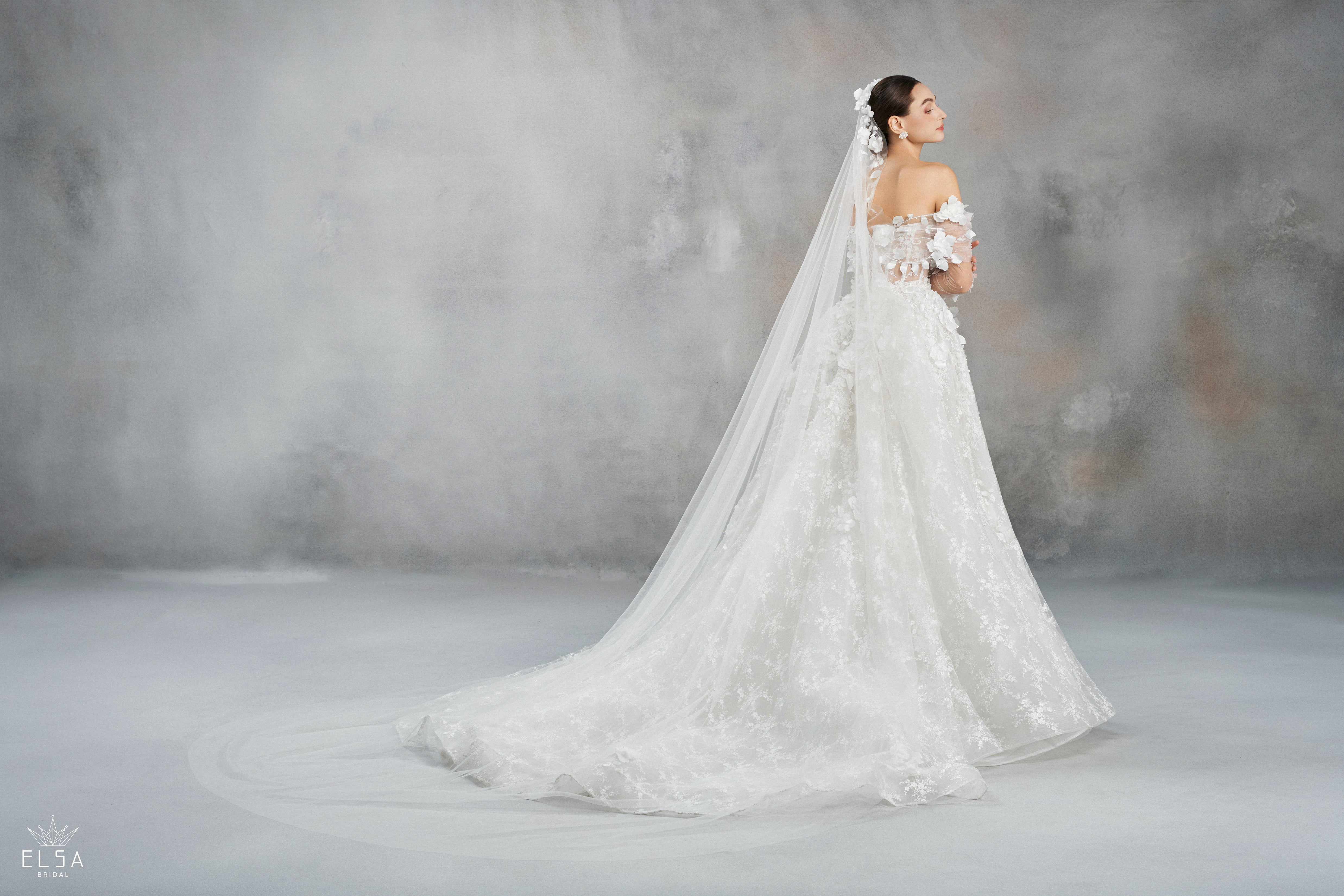 The grand, ultra-voluminous skirt is crafted from premium glitter-infused tulle, creating a 360-degree radiant glow. As the light hits the fabric, it reveals a multidimensional brilliance that extends into a magnificent cathedral train. Paired with a delicate tulle veil, this gown offers a royal presence that is both modern and profoundly luminous.