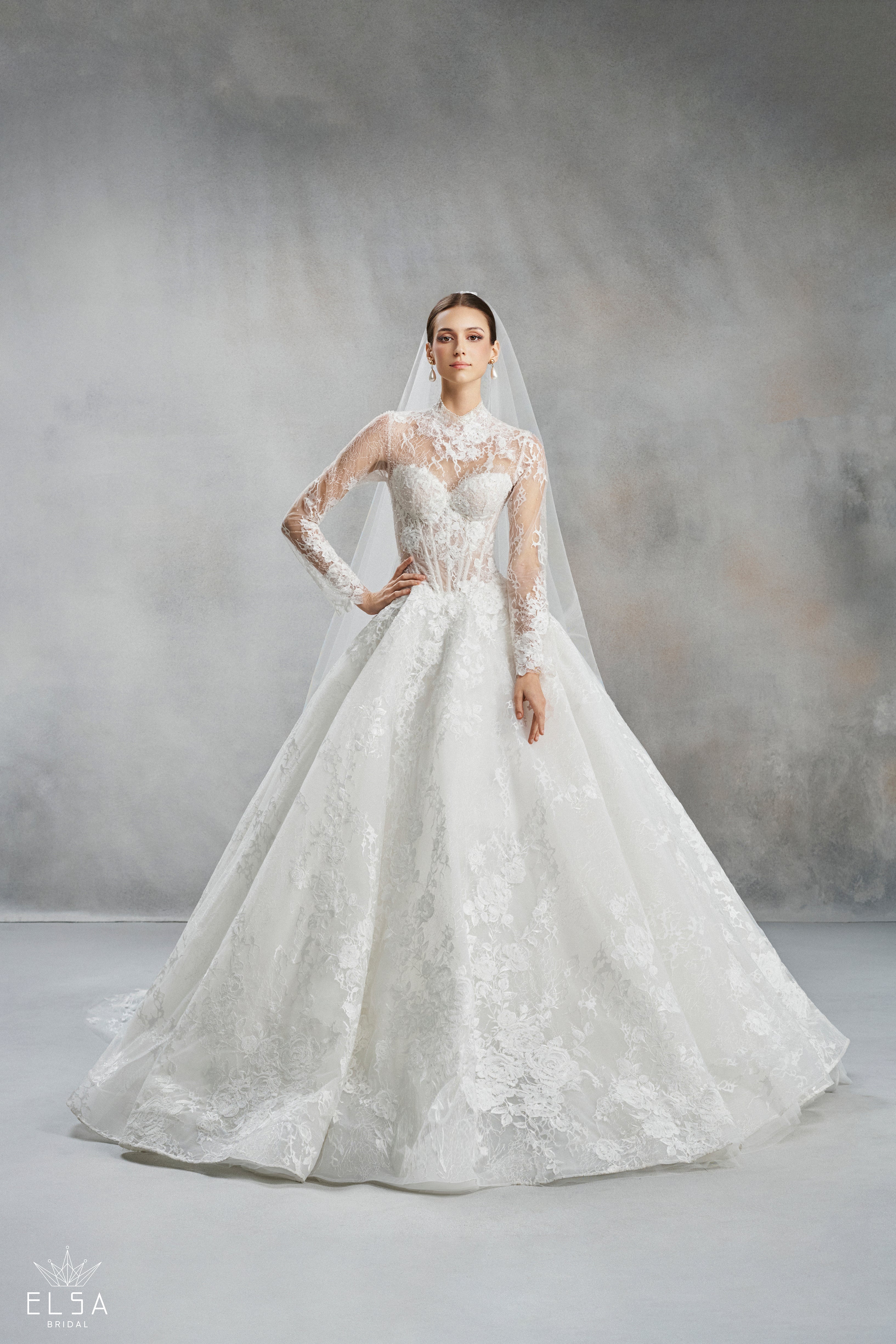 A breathtaking fusion of modern modesty and ethereal glamour, this high-neck ball gown is designed for the bride who wants to look like a vision of starlight and spring. The gown features a sophisticated illusion turtleneck that flows into slender long sleeves, all meticulously adorned with hand-stitched 3D floral appliqués and shimmering crystal vines. The semi-sheer bodice, with its visible haute couture boning, creates a perfectly sculpted silhouette that sparkles with every movement.