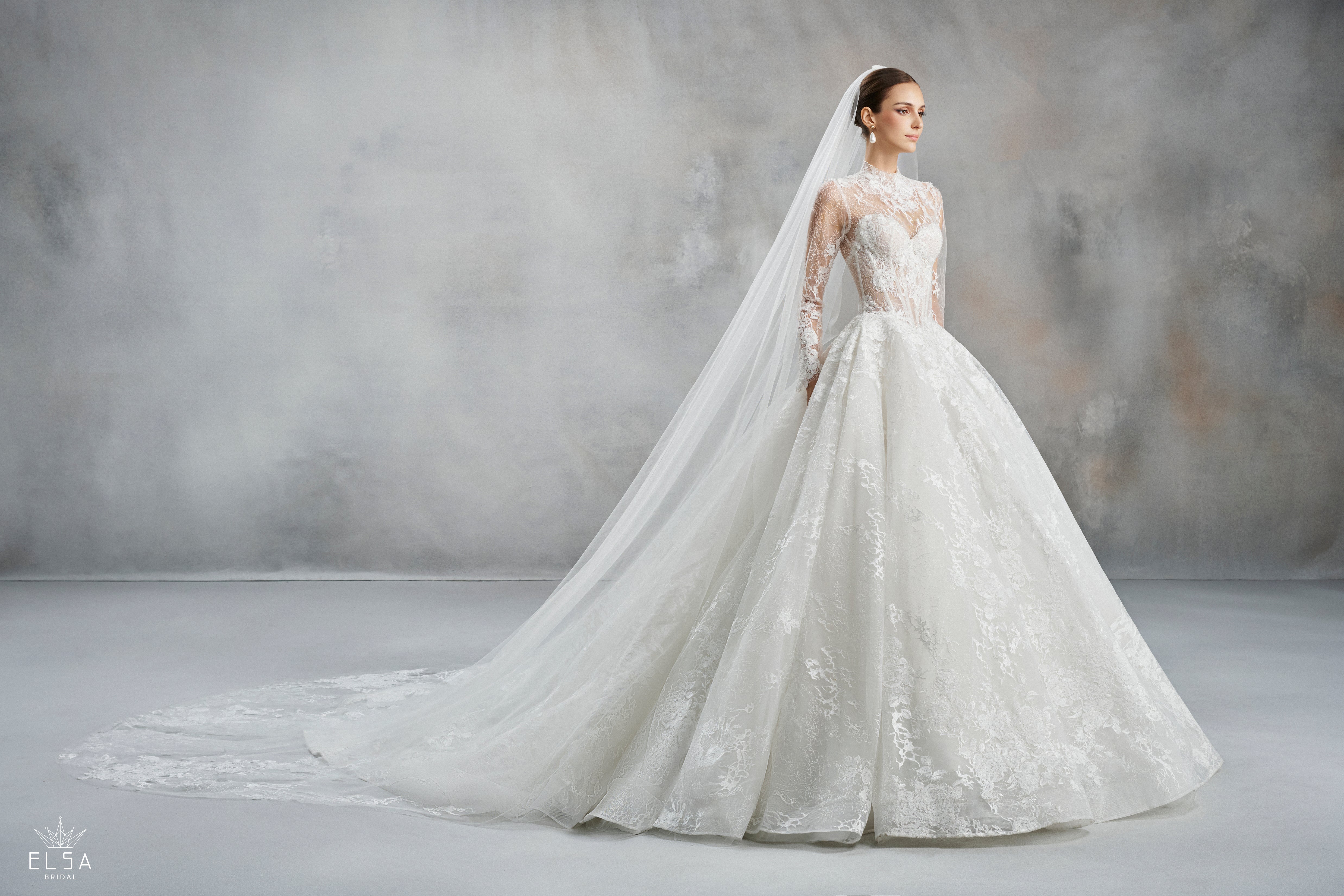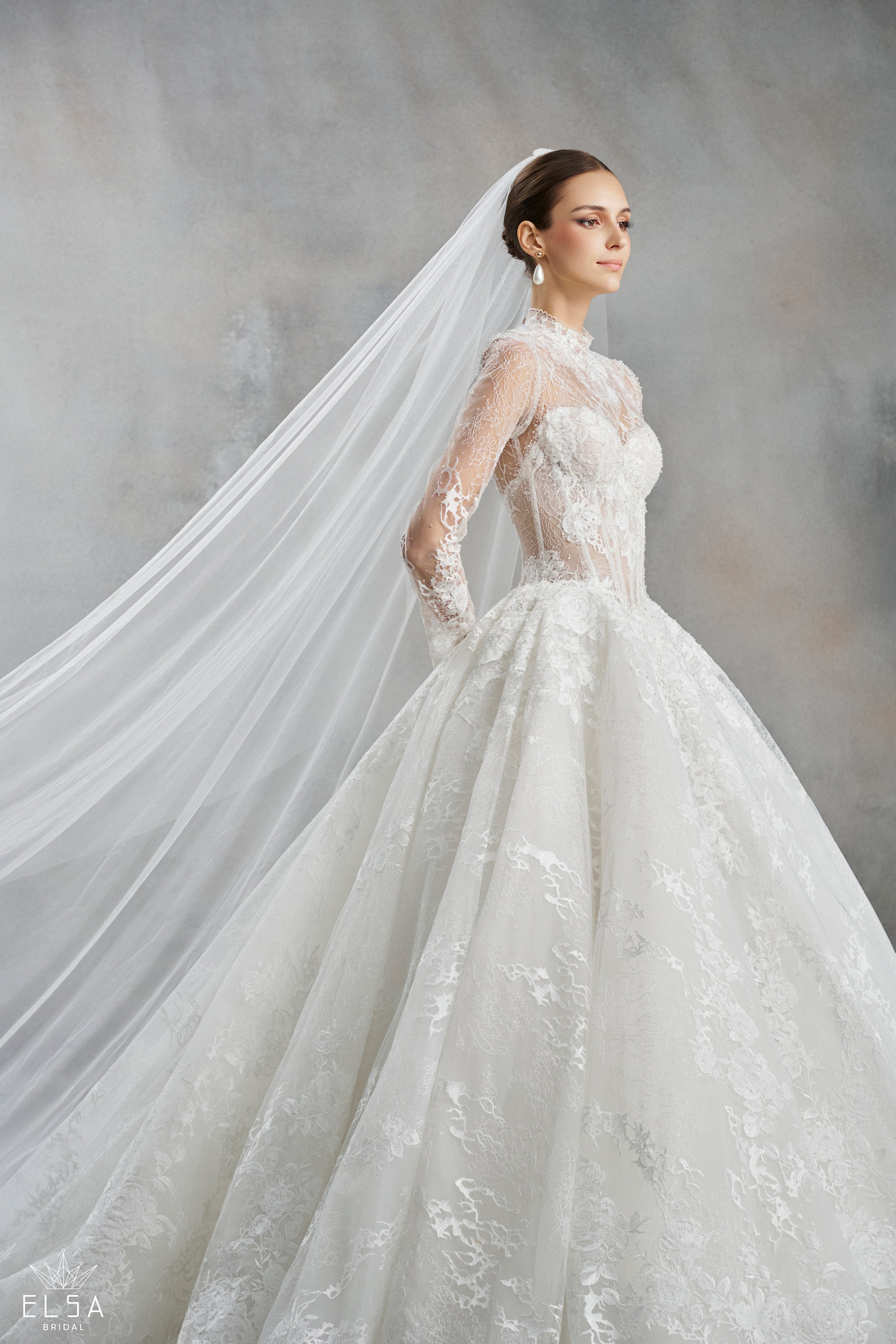 Illusion Jewel High-Neck: A sophisticated, high-coverage neckline encrusted with micro-pearls and crystals that frames the face with a radiant glow.