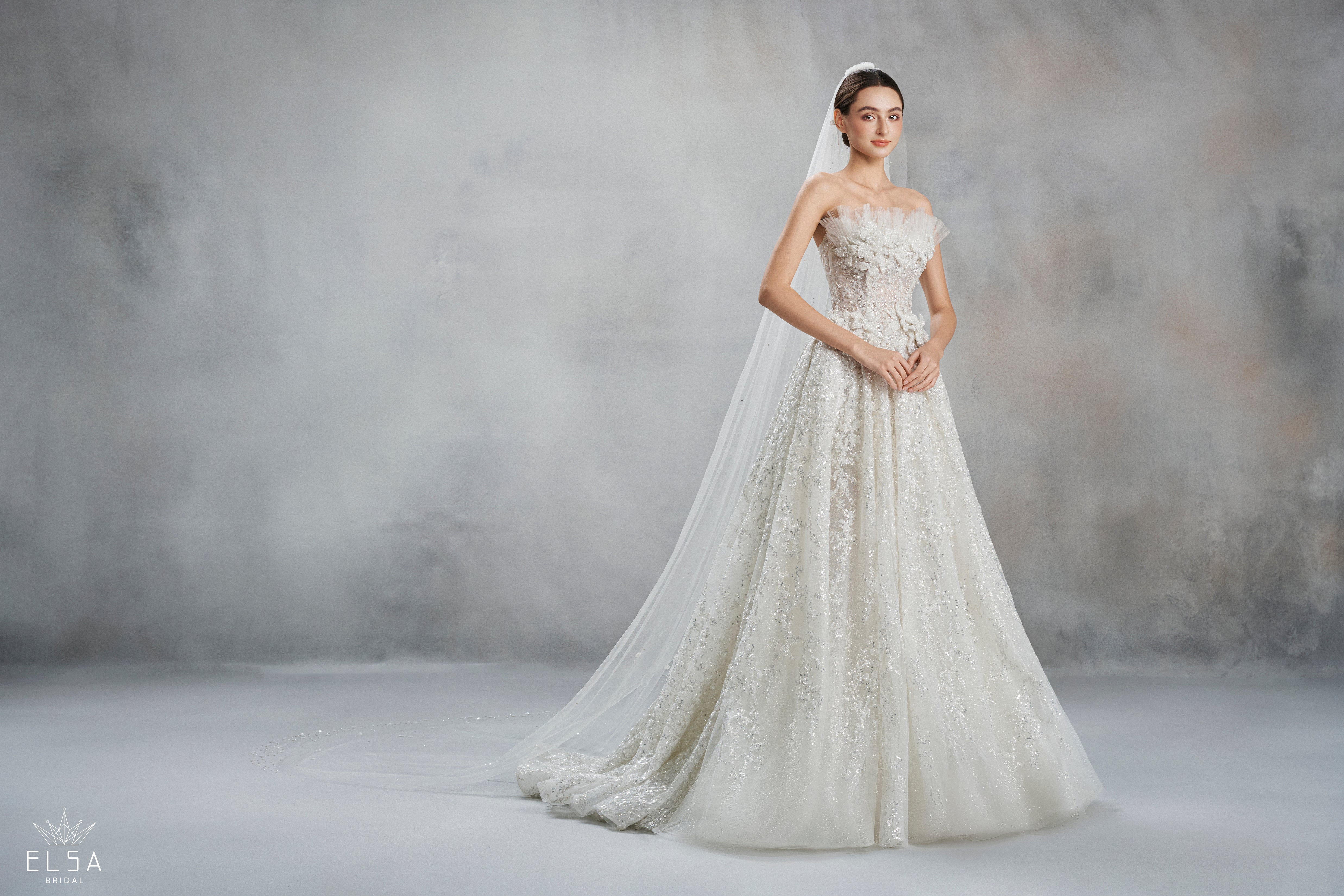 A celebration of refined glamour and delicate artistry, this strapless A-line gown is designed for the bride who wants a sophisticated, high-shimmer aesthetic. The bodice features a unique architectural ruffled neckline crafted from pleated tulle, creating a soft, fluttery frame for the décolletage. Below the ruffles, the semi-sheer corset is intricately adorned with 3D floral lace appliqués and concentrated crystal beadwork that tapers gracefully toward the waist.