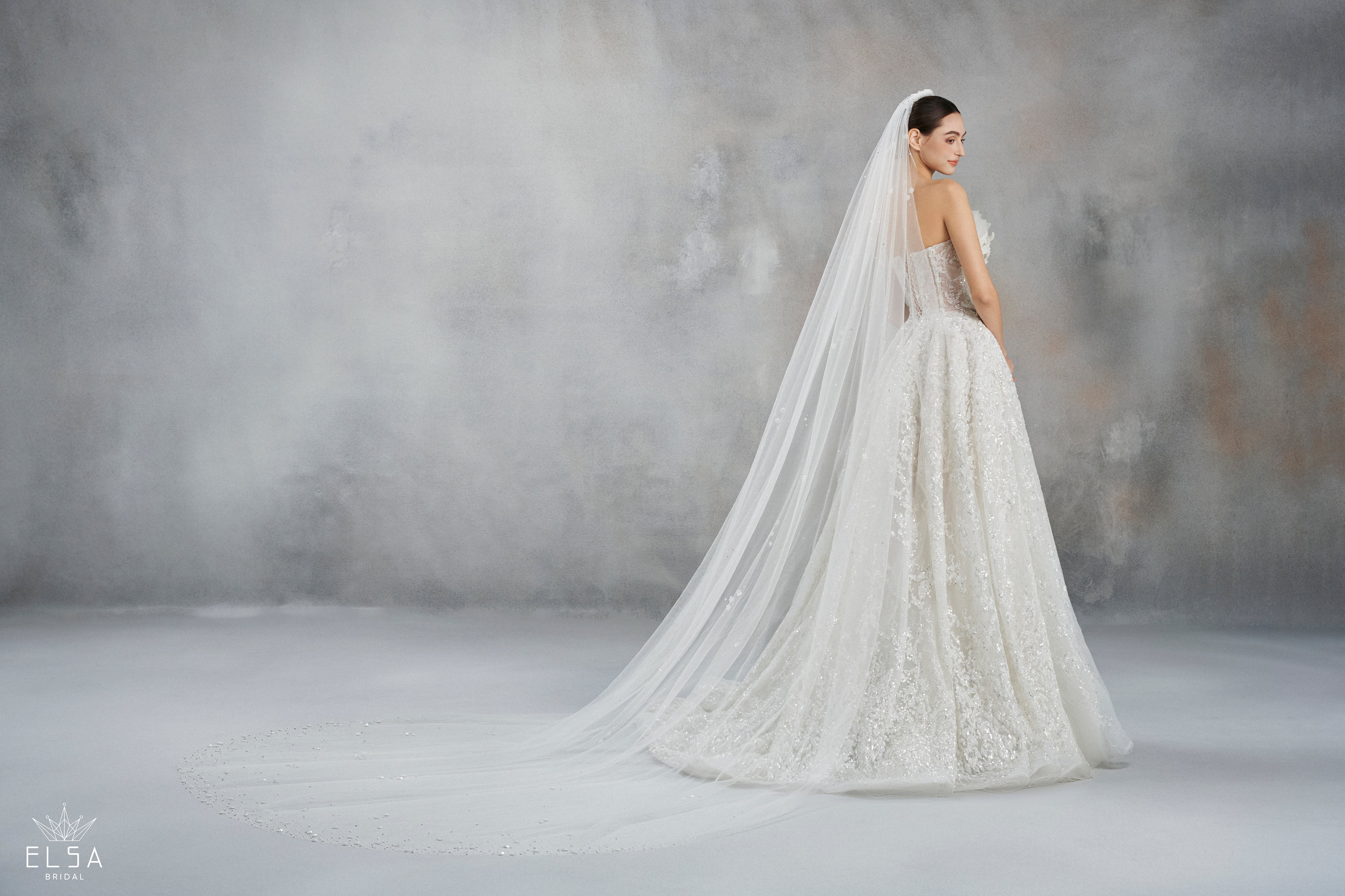 The gown flows into a classic A-line skirt made from premium glitter-dusted tulle, giving the fabric a multidimensional, starlight effect. As the light catches the surface, the subtle botanical embroidery throughout the skirt reveals a hidden layer of detail, ensuring a radiant and unforgettable presence from every angle.