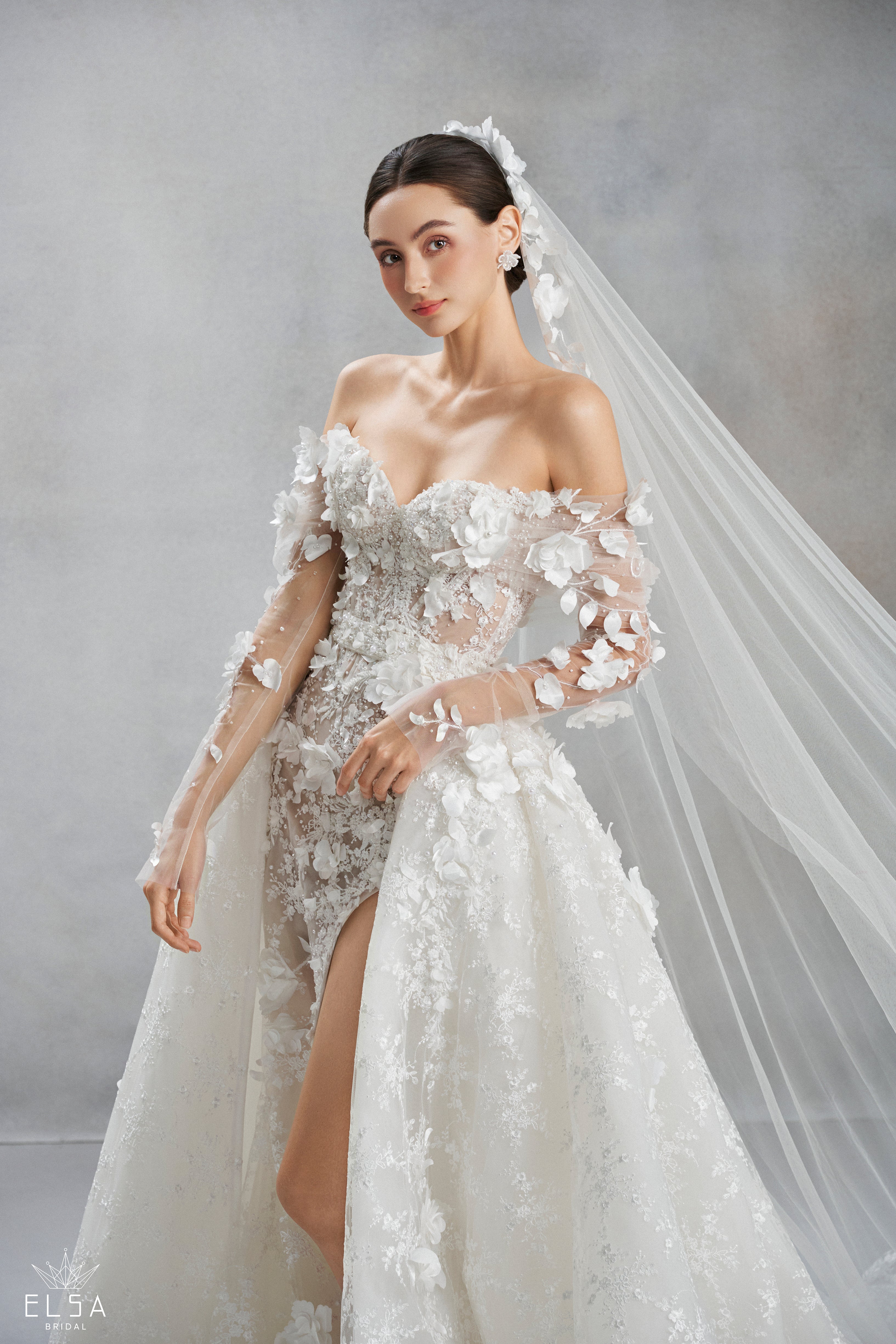 A breathtaking masterclass in high-fashion versatility, this off-the-shoulder couture gown is designed for the bride who demands both a dramatic entrance and a bold, modern silhouette. The gown features a sheer, corset-boned bodice and long illusion sleeves, all encrusted with an extraordinary dense garden of hand-sewn 3D silk blossoms and crystalline vine embroidery. The daring thigh-high side slit adds a contemporary edge, showcasing the legs and allowing for effortless movement.