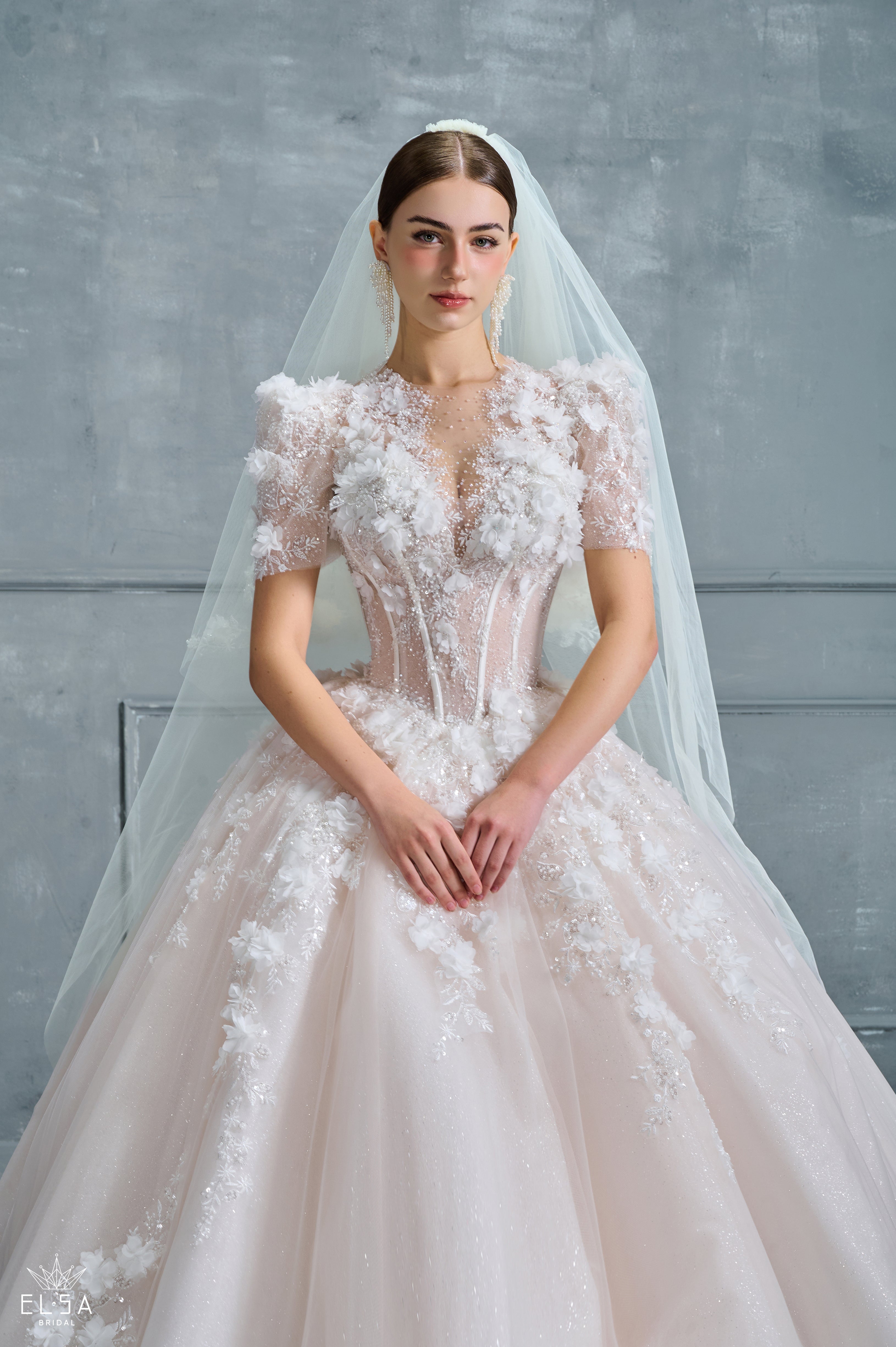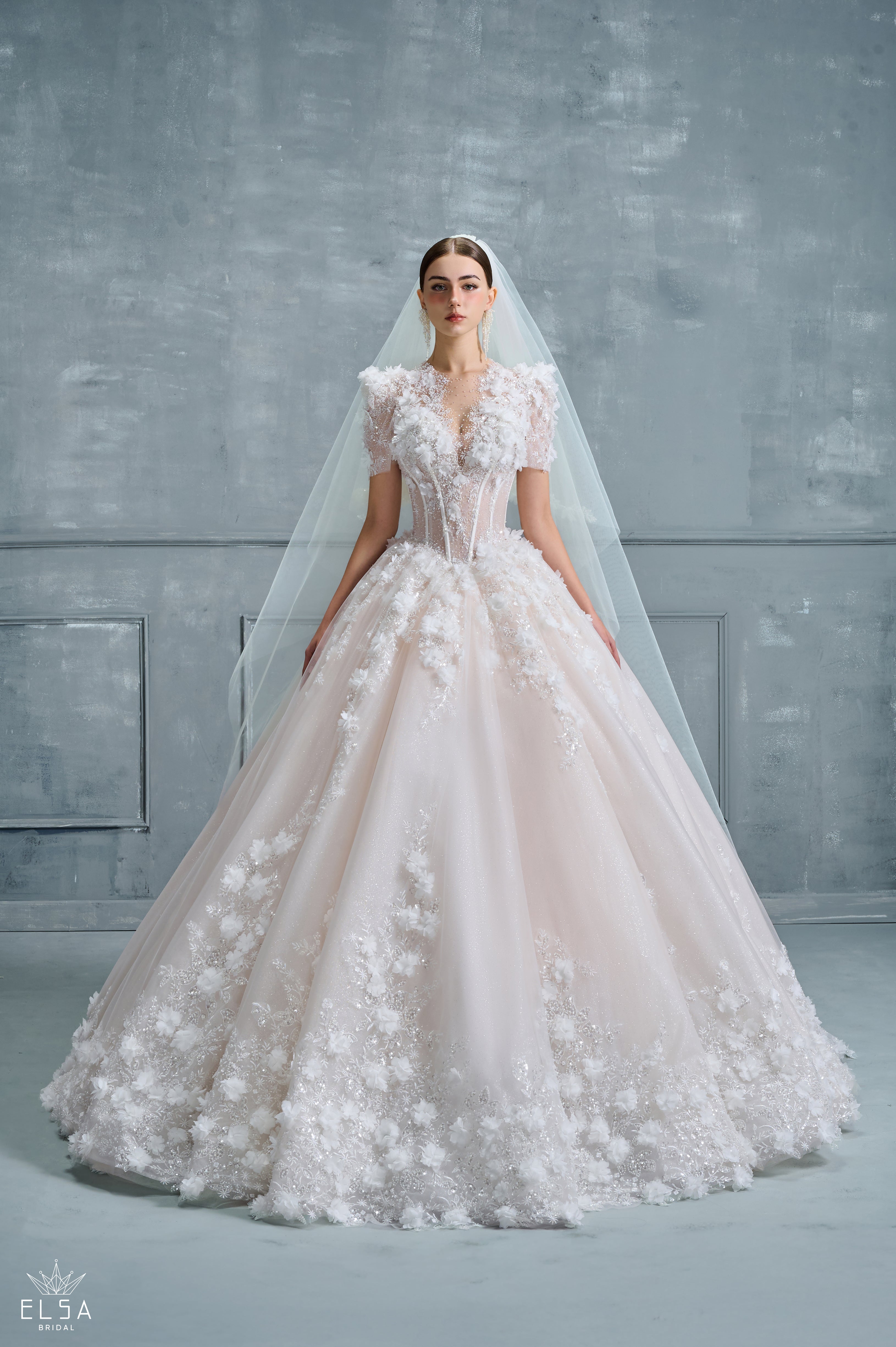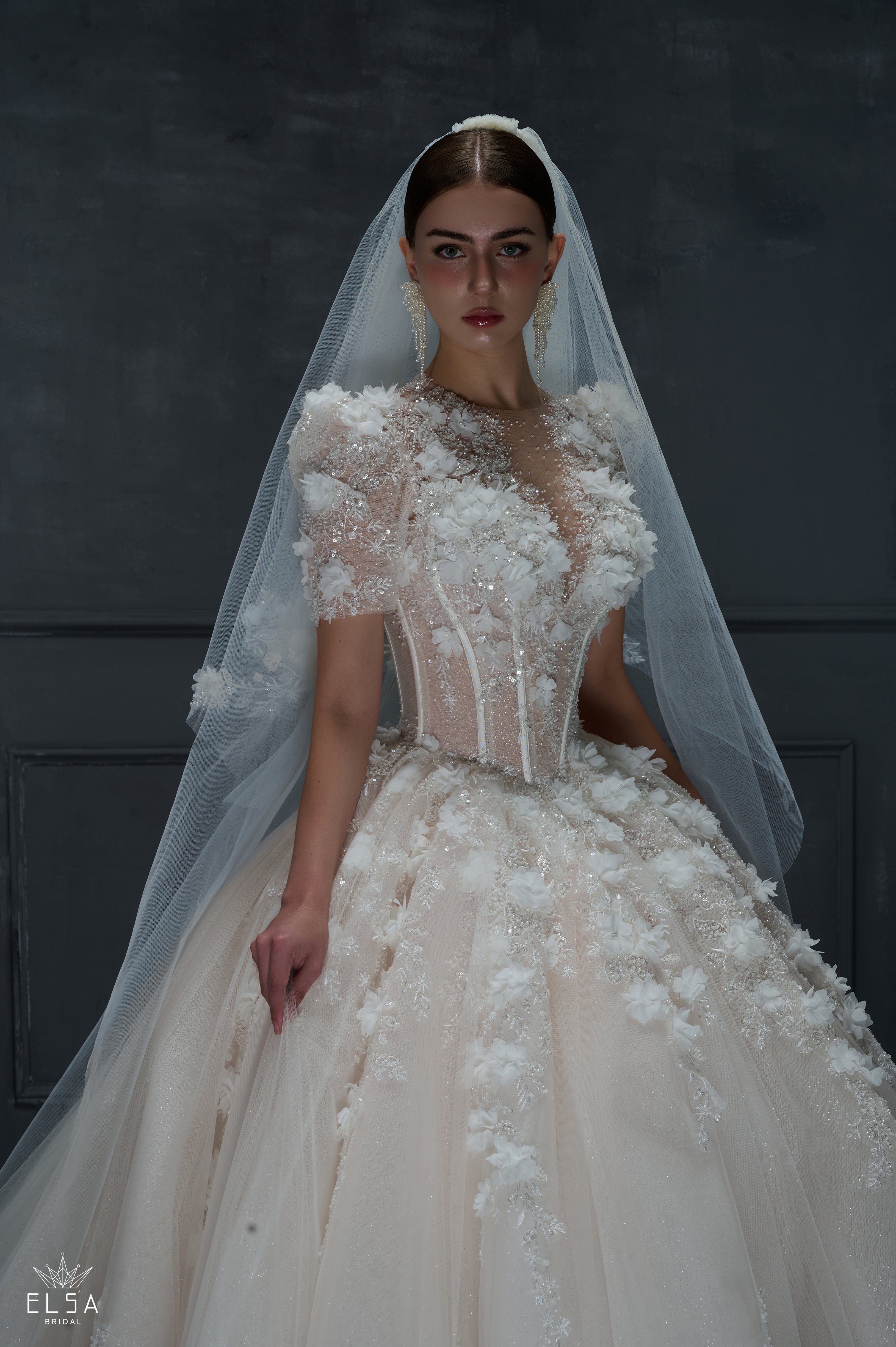 Romantic yet powerful, this gown celebrates the poetry of nature through three-dimensional floral artistry. The corseted bodice features delicate lace petals and hand-applied blossoms that bloom across the shoulders, while the voluminous skirt unfurls like a field of ivory flowers beneath the soft glow of dawn. A masterpiece of craftsmanship, it evokes both modern femininity and timeless couture refinement.