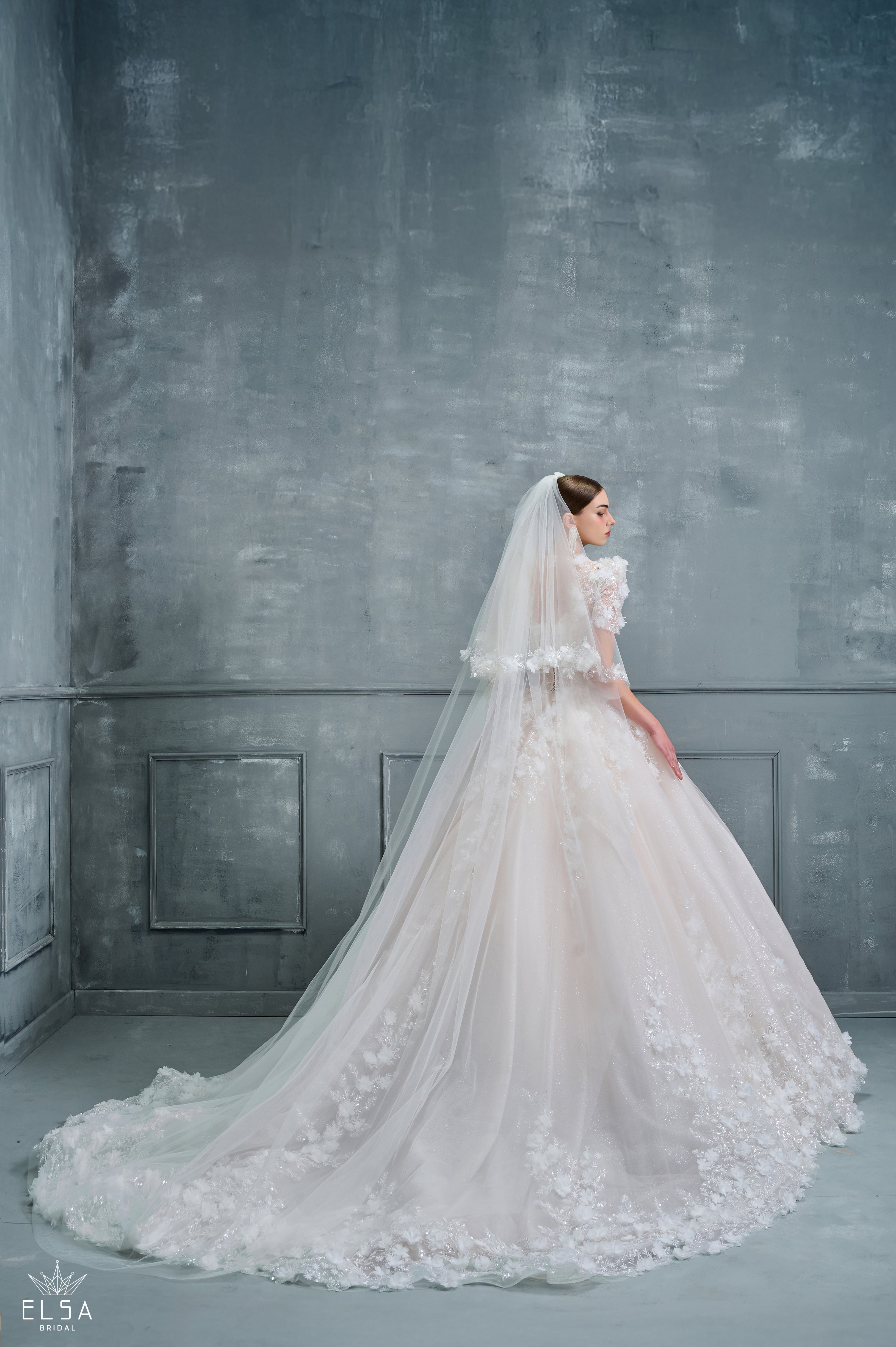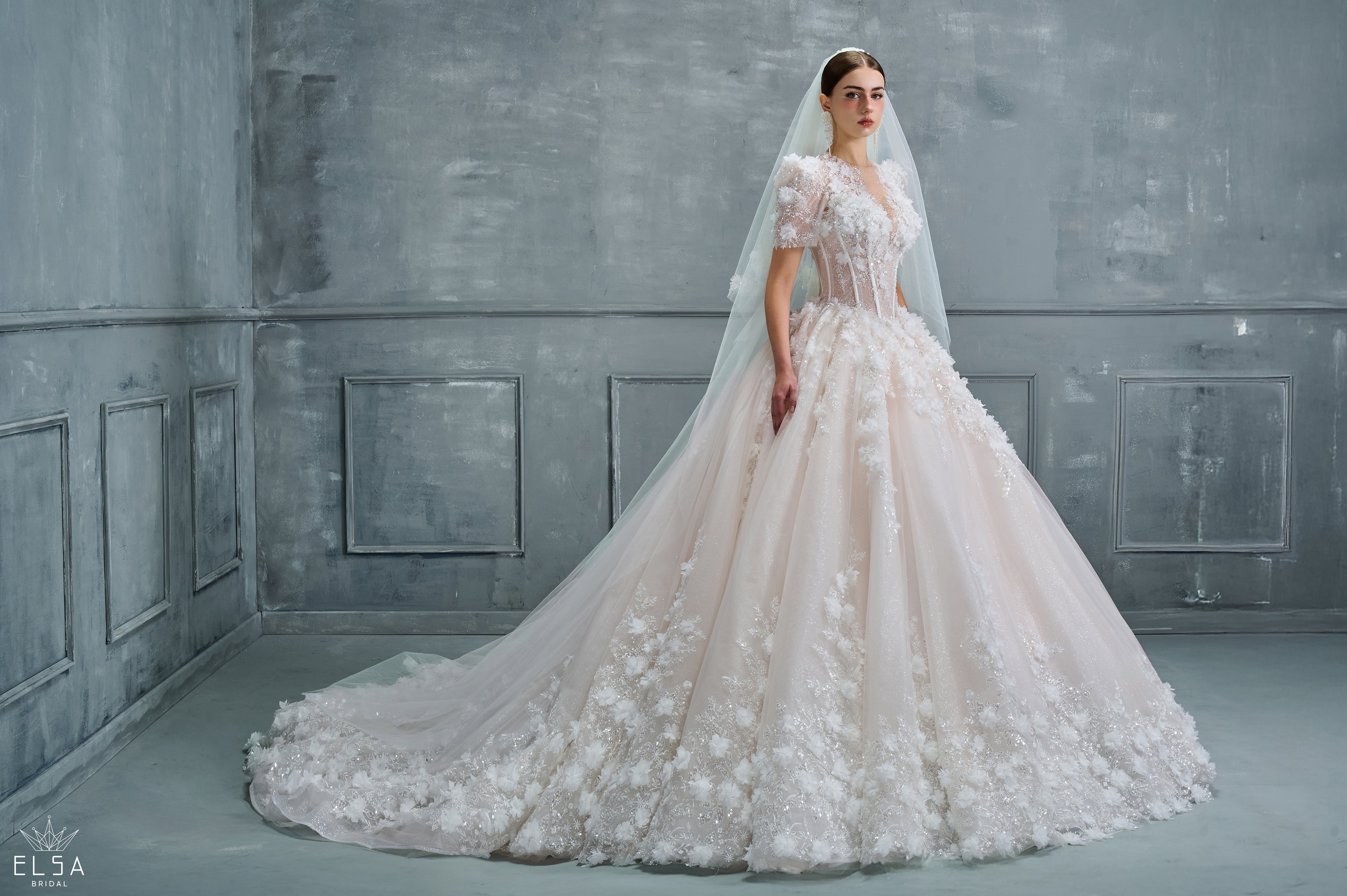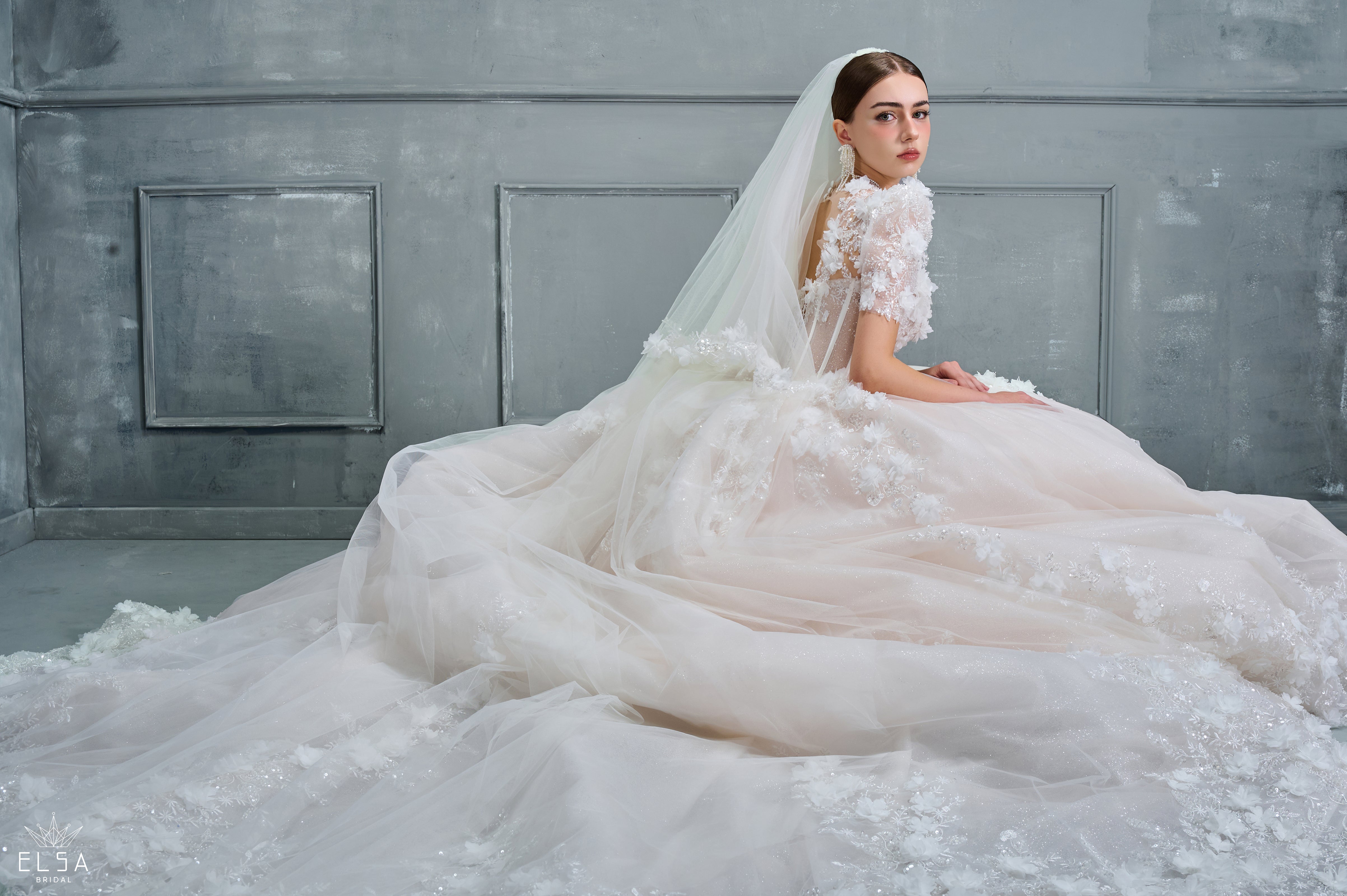Romantic yet powerful, this gown celebrates the poetry of nature through three-dimensional floral artistry. The corseted bodice features delicate lace petals and hand-applied blossoms that bloom across the shoulders, while the voluminous skirt unfurls like a field of ivory flowers beneath the soft glow of dawn. A masterpiece of craftsmanship, it evokes both modern femininity and timeless couture refinement.