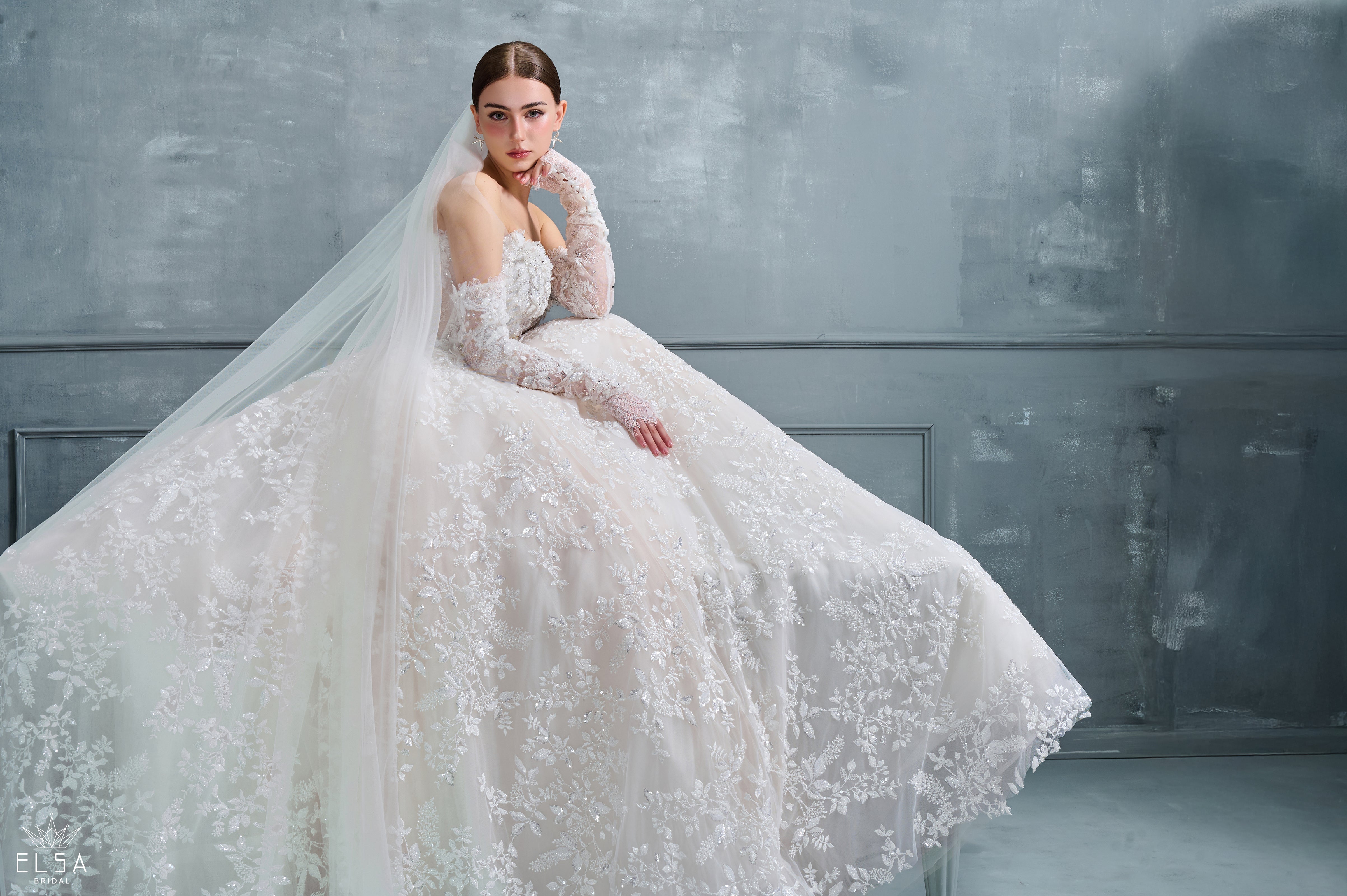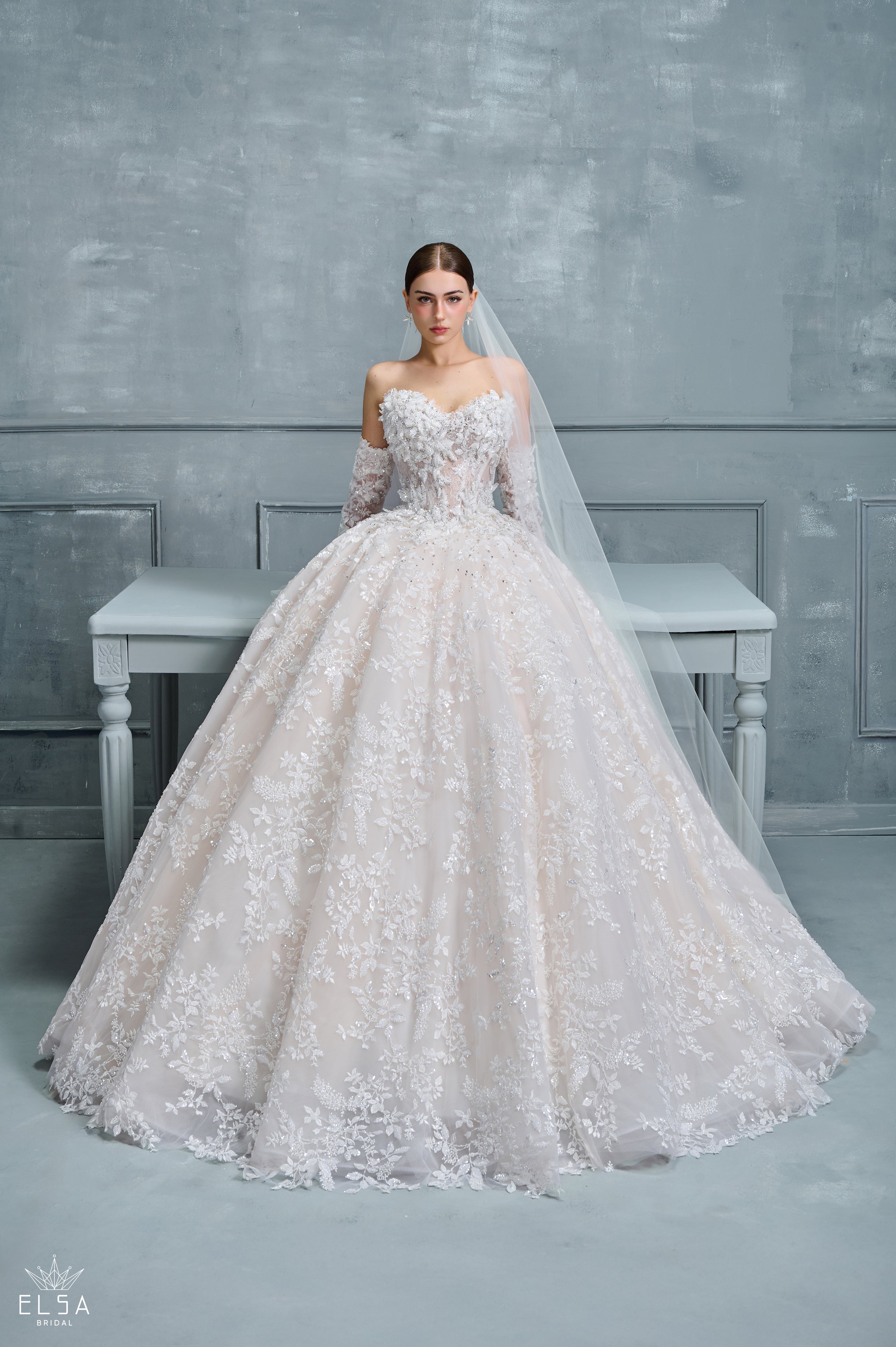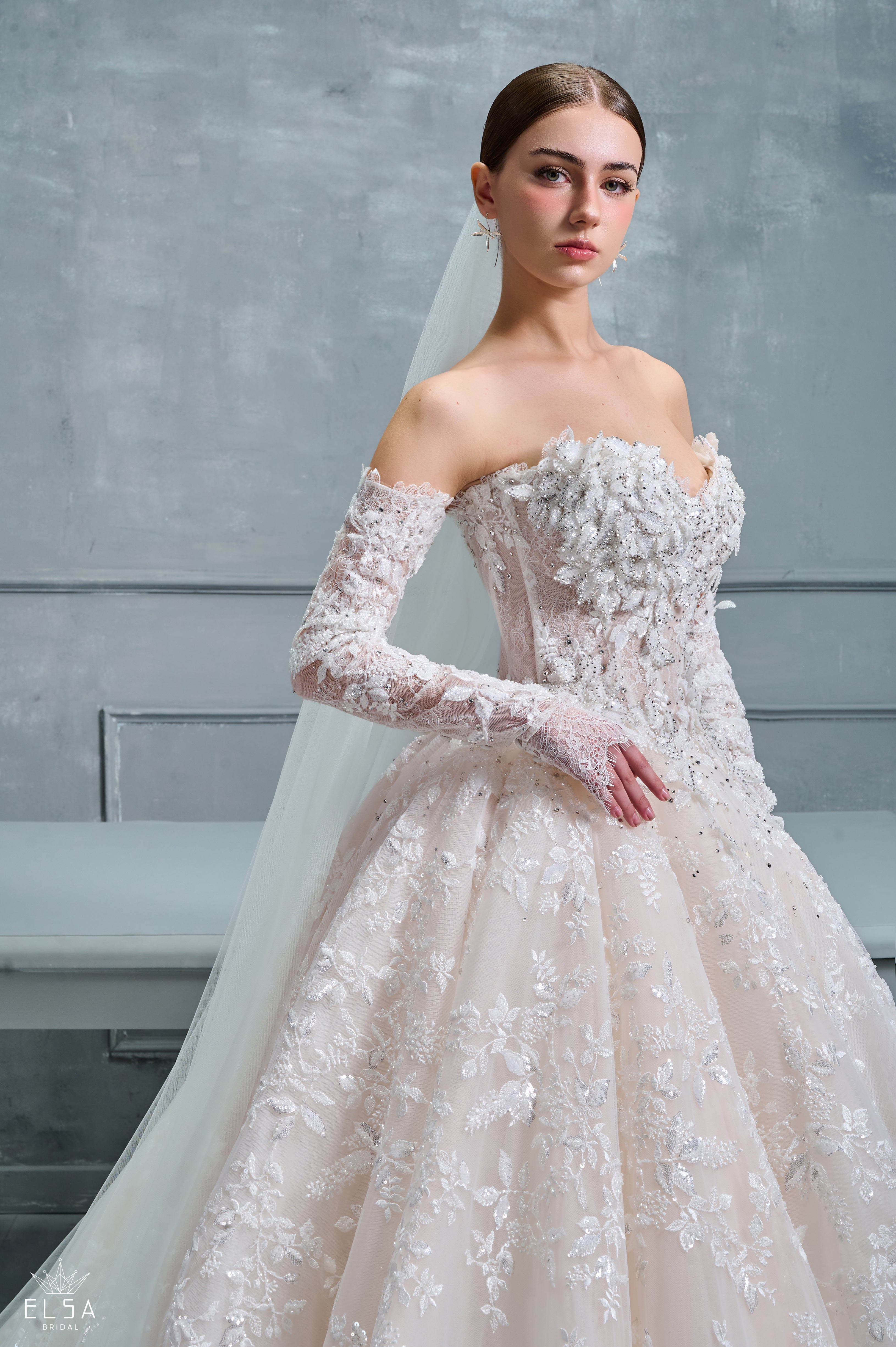 An ode to timeless romance, this strapless gown enchants with its heart-shaped neckline and sculpted bodice adorned with floral lace embroidery. Soft off-shoulder sleeves gracefully complement the intricate beading, while the grand skirt blooms in layers of ethereal tulle and lace. Designed for the modern romantic bride, it captures the beauty of everlasting love — radiant, tender, and eternal.