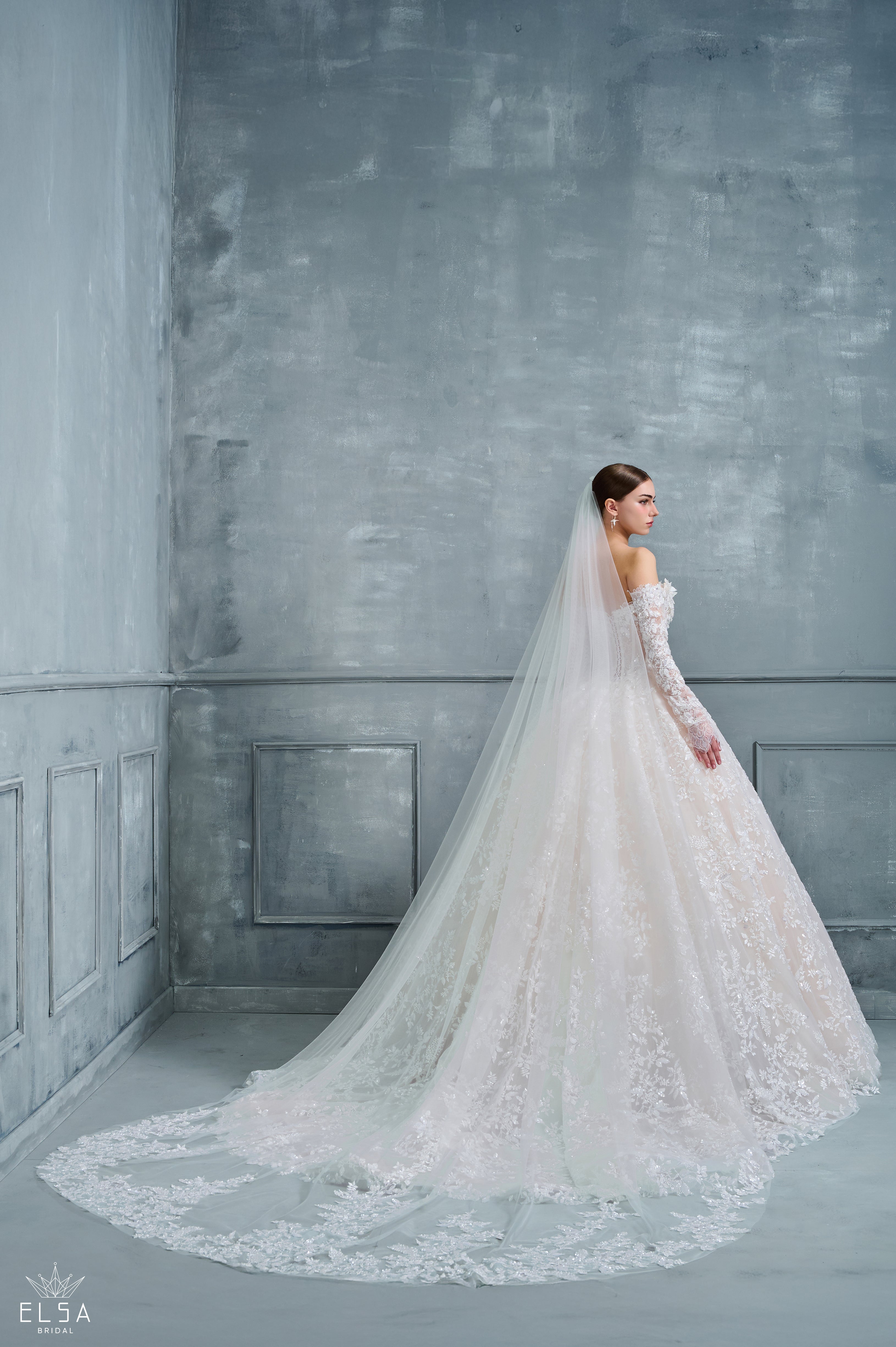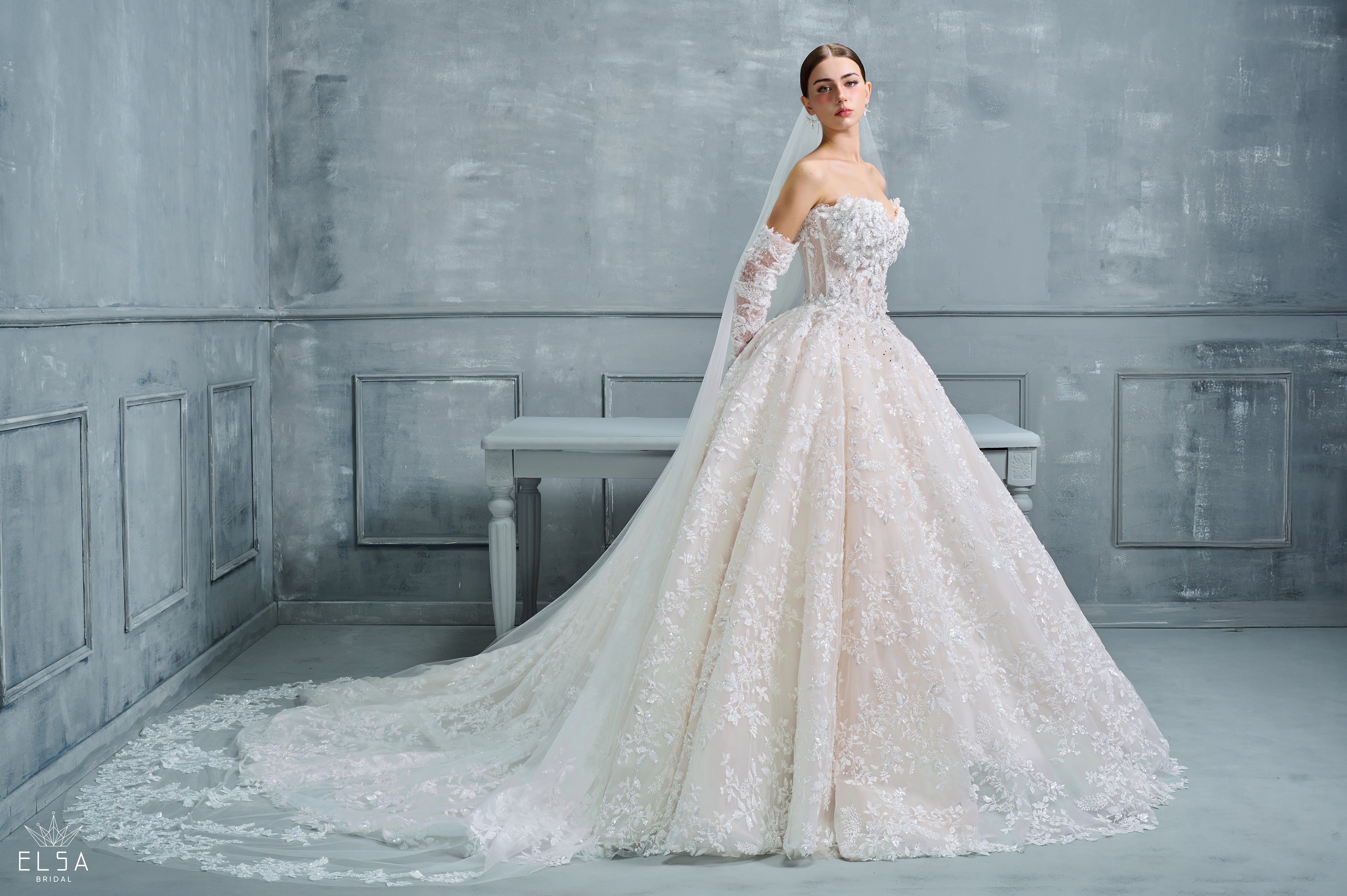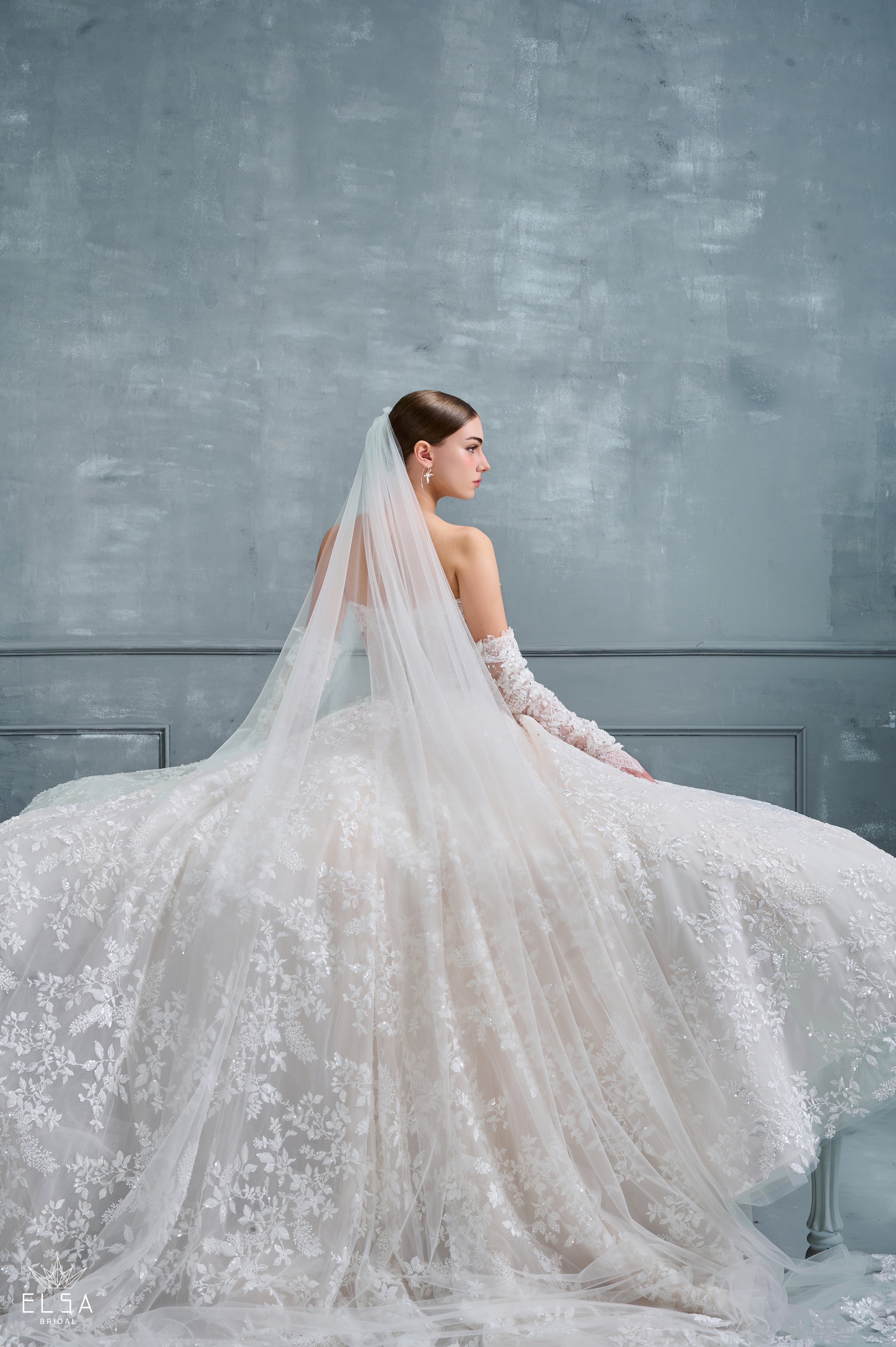 An ode to timeless romance, this strapless gown enchants with its heart-shaped neckline and sculpted bodice adorned with floral lace embroidery. Soft off-shoulder sleeves gracefully complement the intricate beading, while the grand skirt blooms in layers of ethereal tulle and lace. Designed for the modern romantic bride, it captures the beauty of everlasting love — radiant, tender, and eternal.