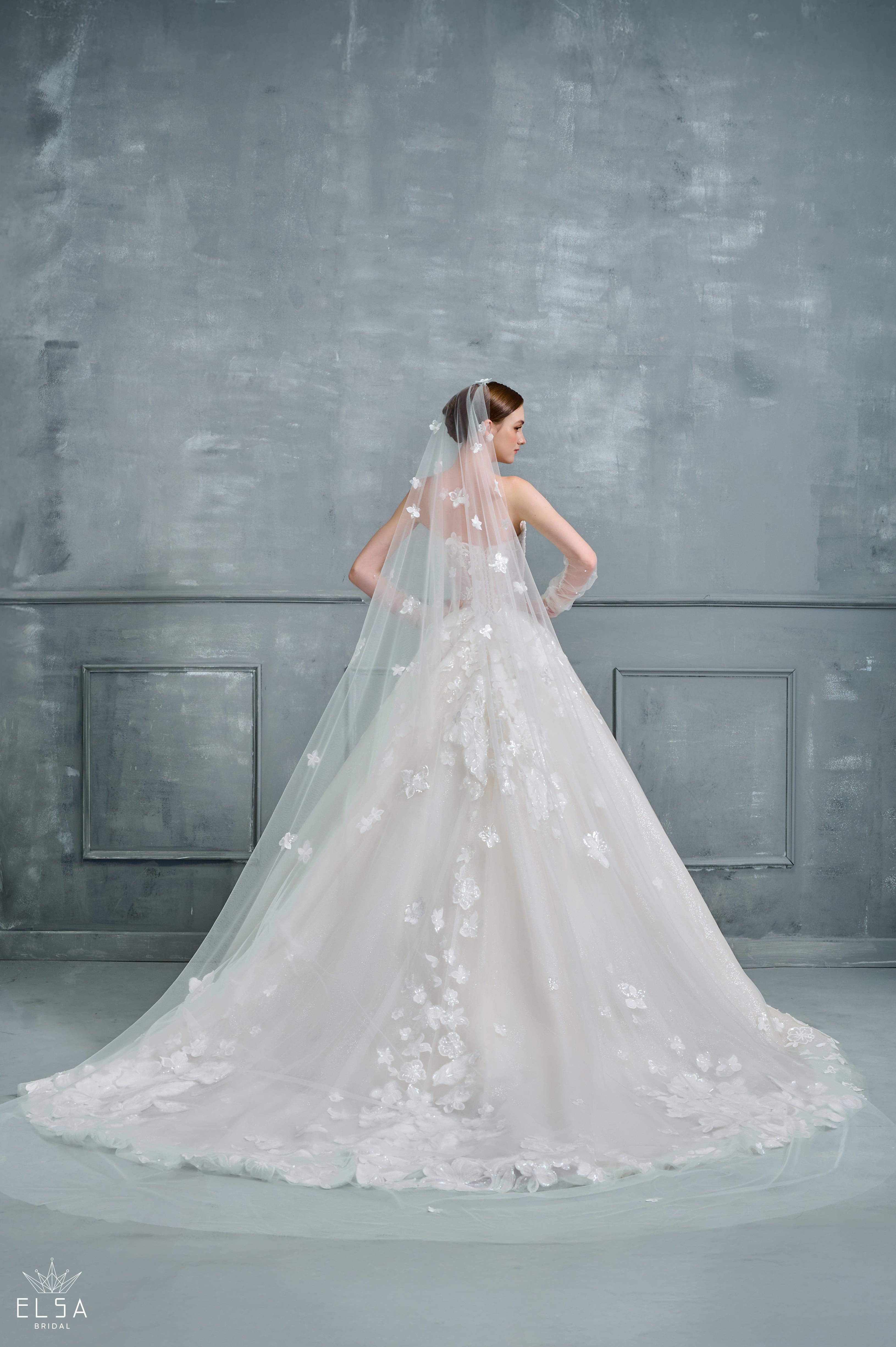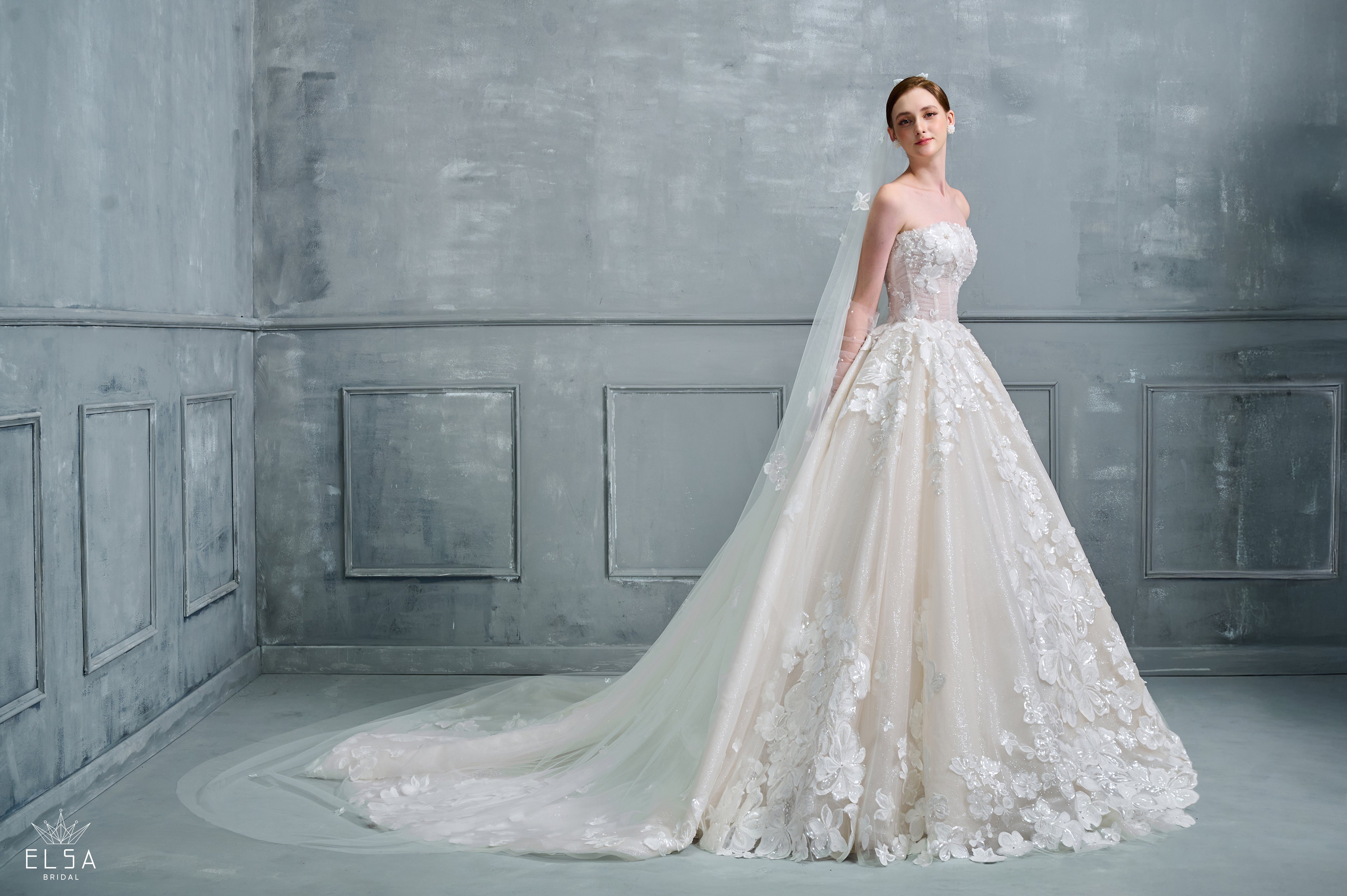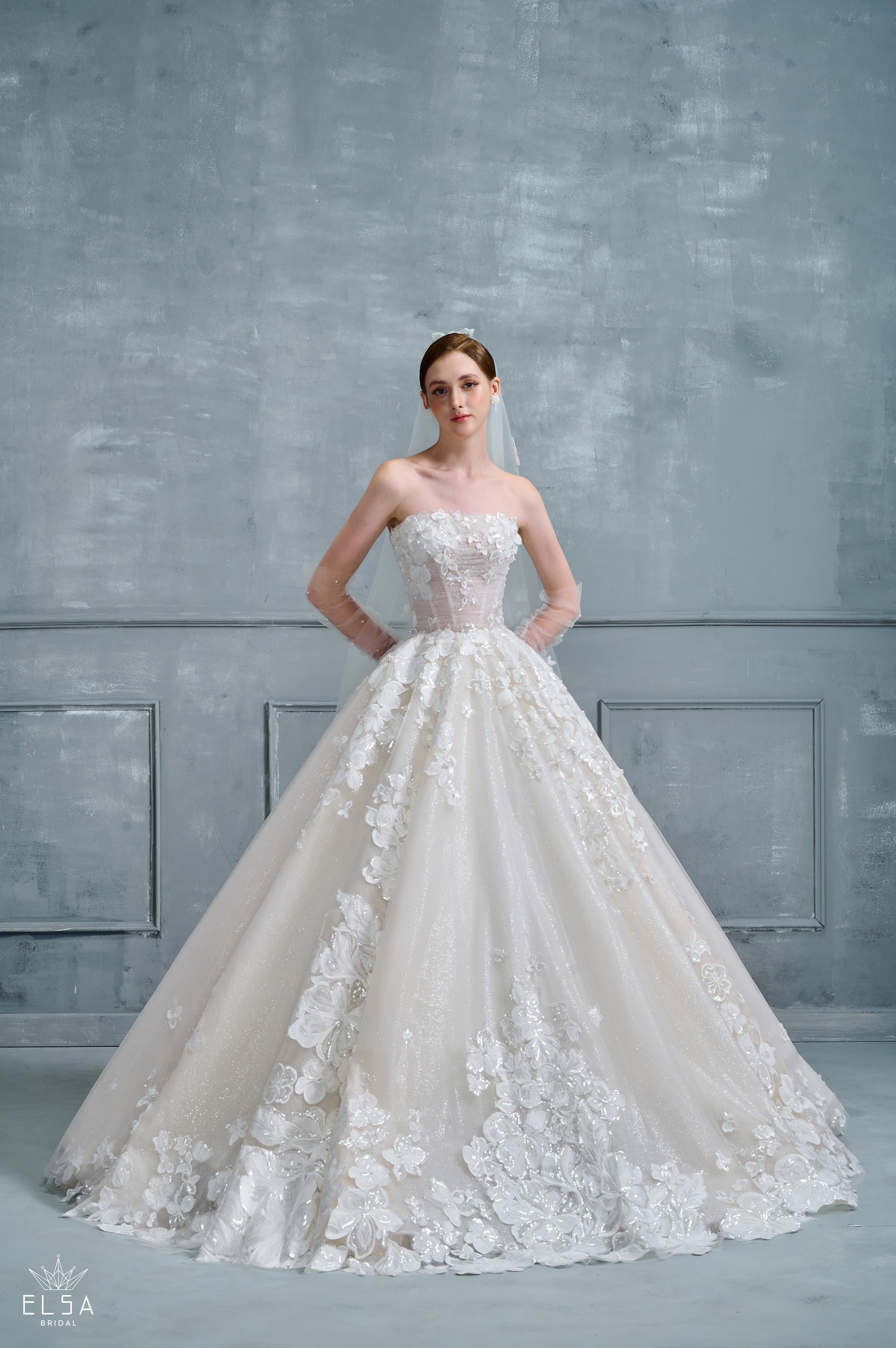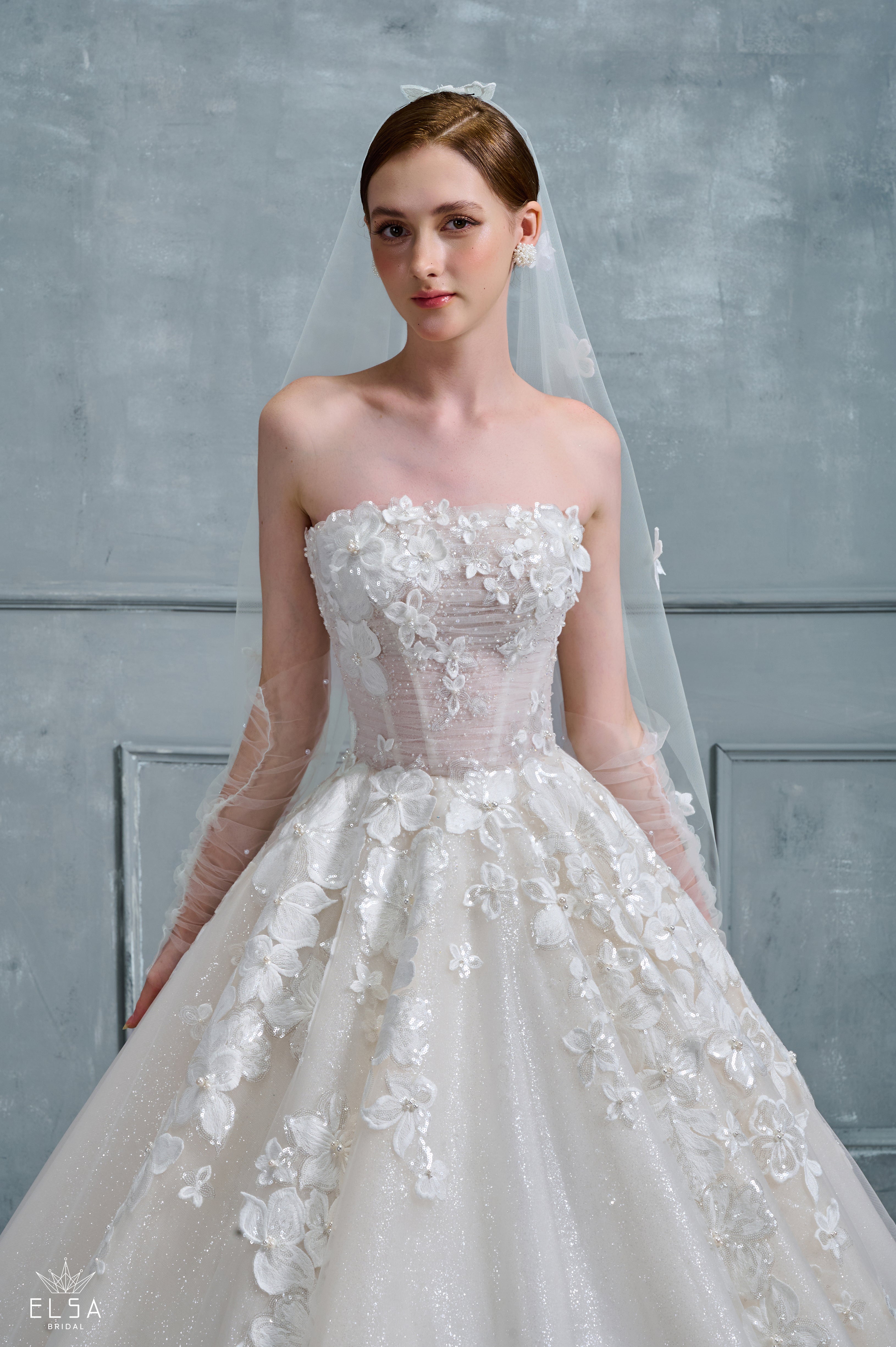 Refined and luminous, this strapless gown is a vision of minimalist opulence. The sculpted bodice, delicately adorned with floral lace, flows into a grand ballgown skirt that glimmers softly like morning dew on ivory petals. With its clean lines and gentle radiance, this design embodies effortless grace — timeless, serene, and infinitely elegant.