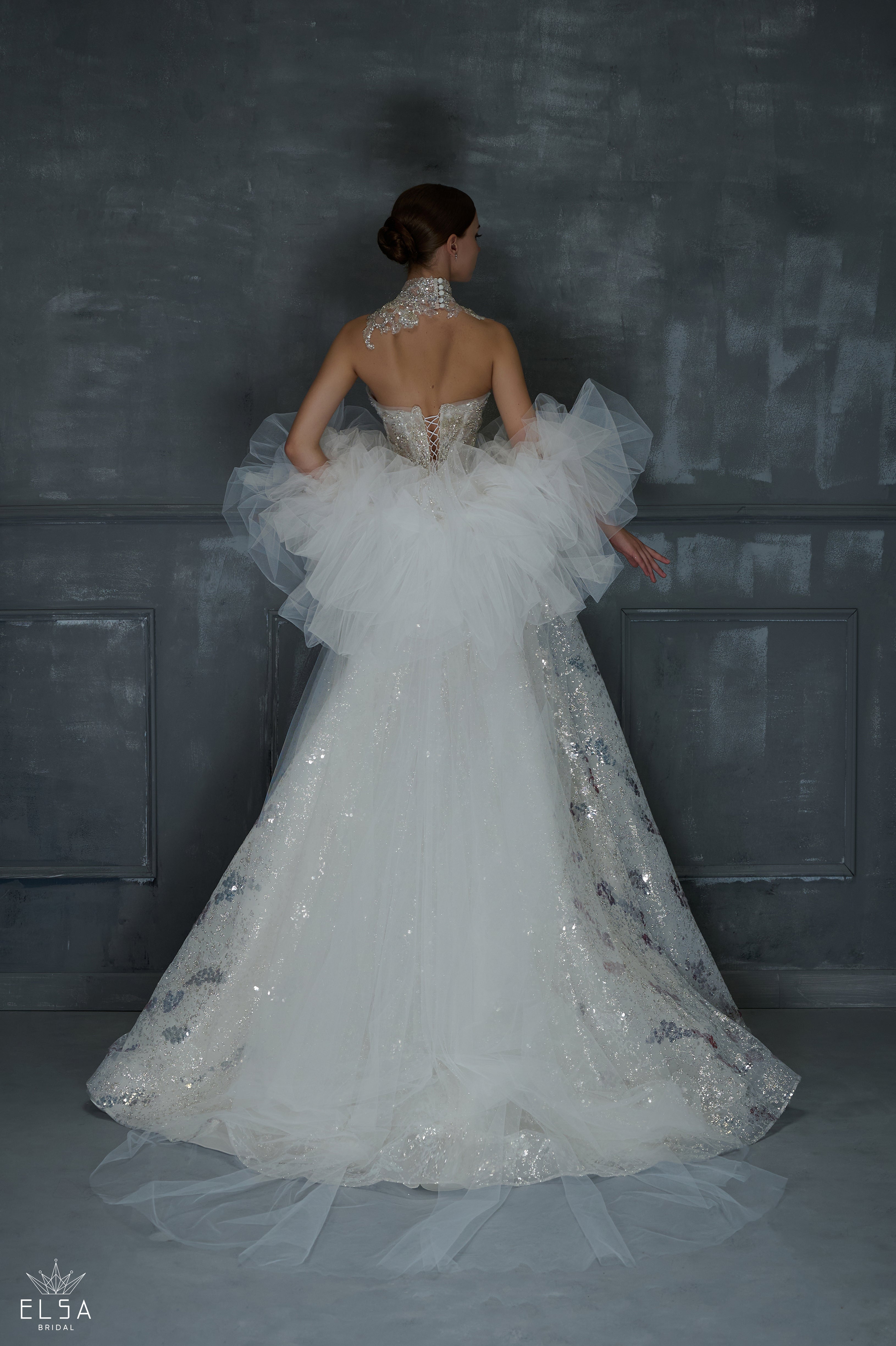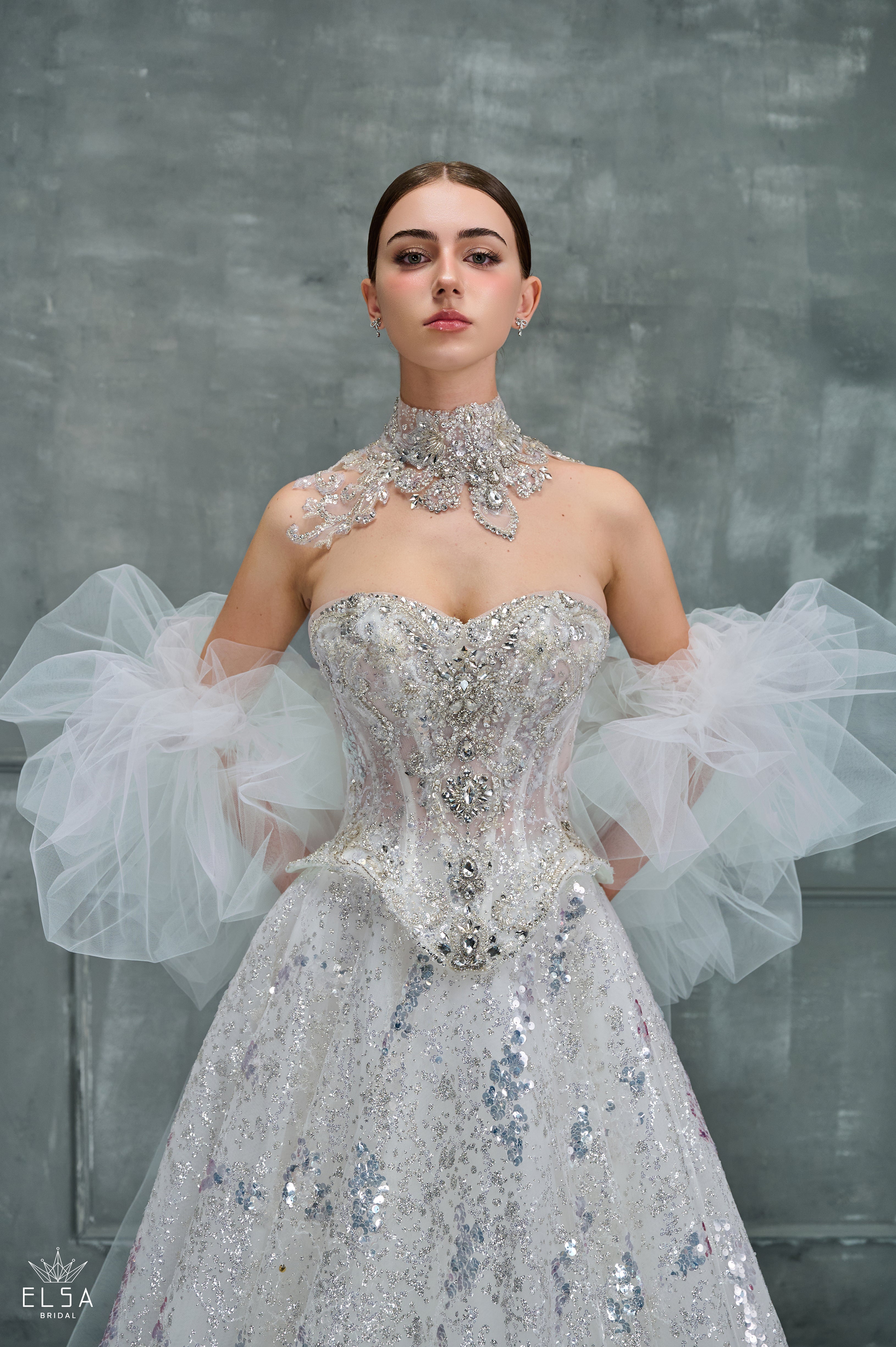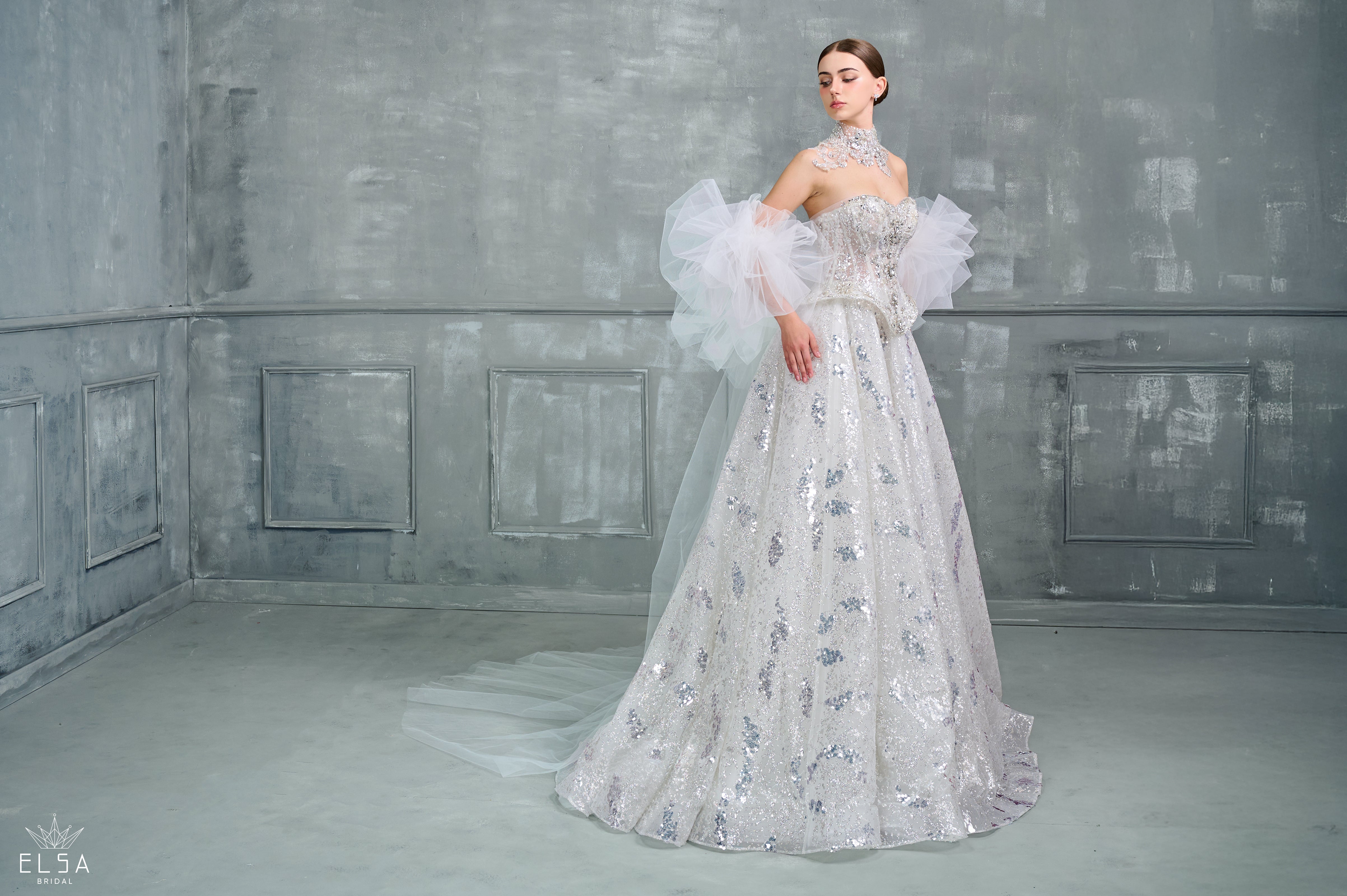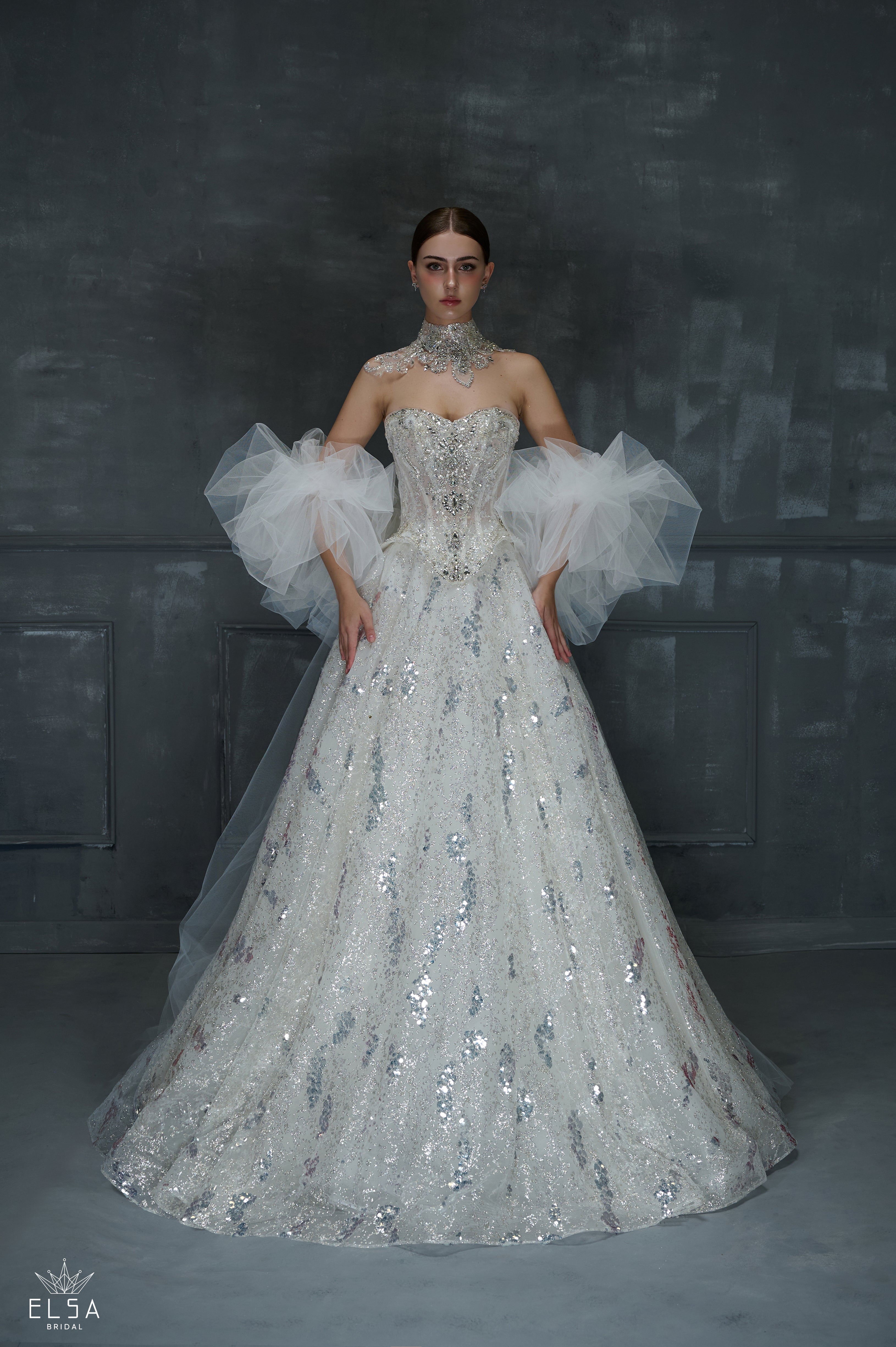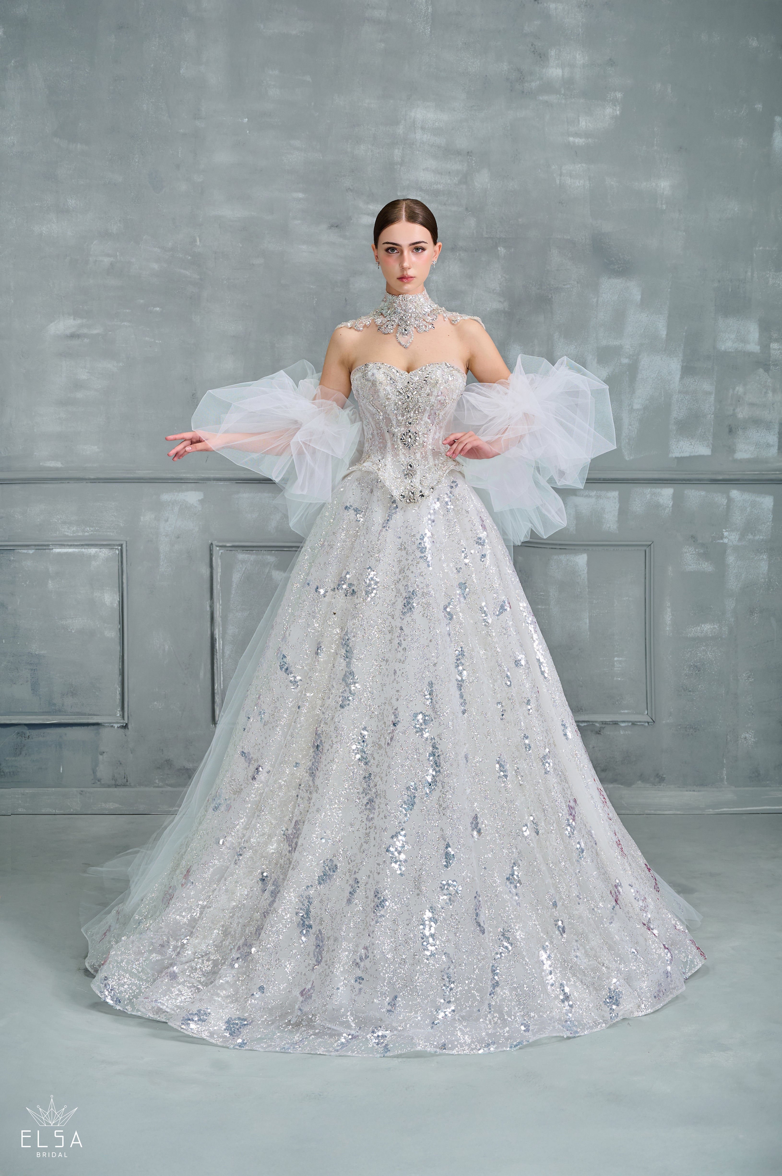 A couture masterpiece shimmering like moonlight over calm waters. The strapless bodice and full skirt are drenched in silver sequins, while delicate tulle sleeves create a sense of fantasy and lightness. Every sparkle tells a story of glamour and celestial beauty.