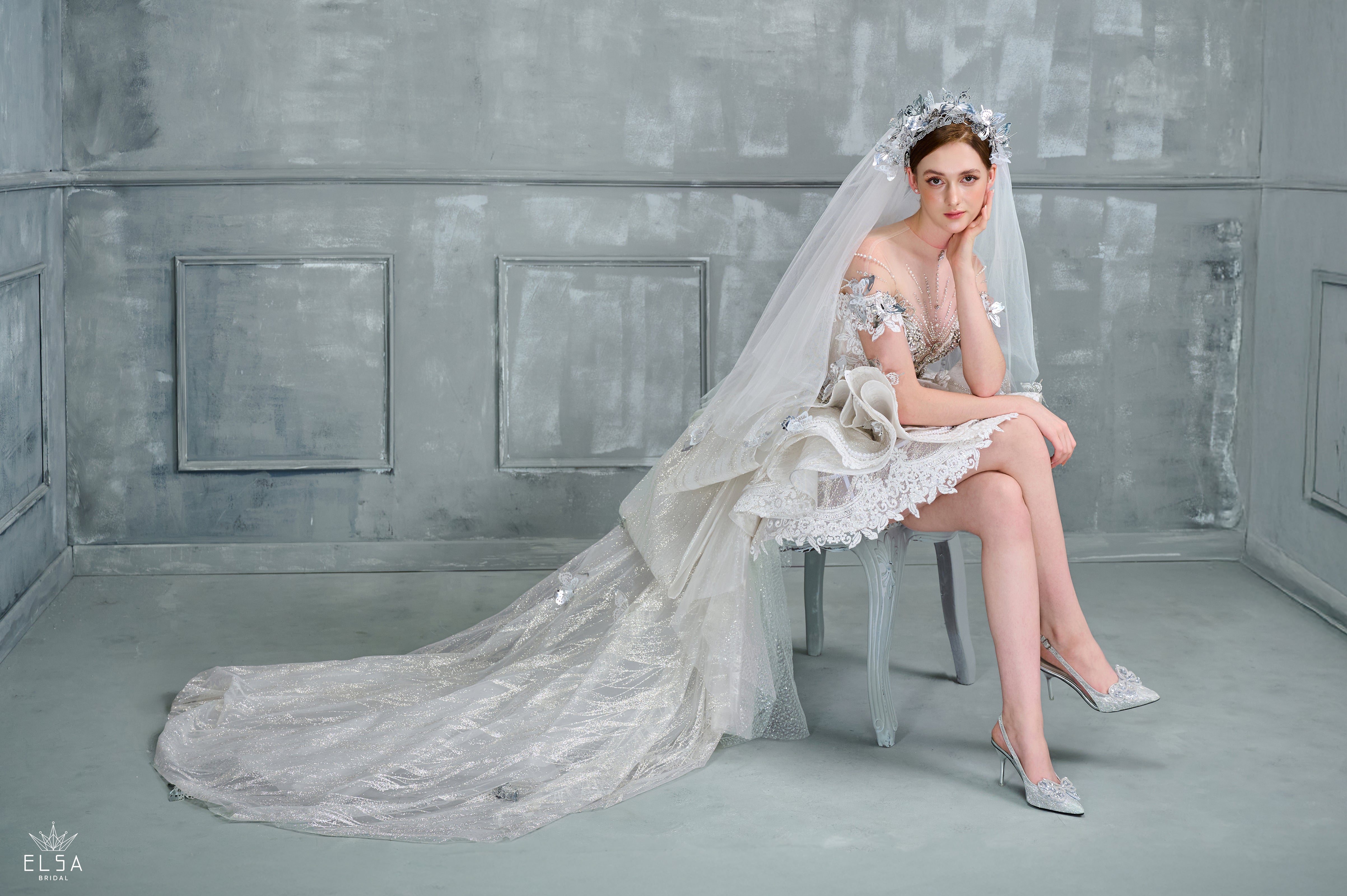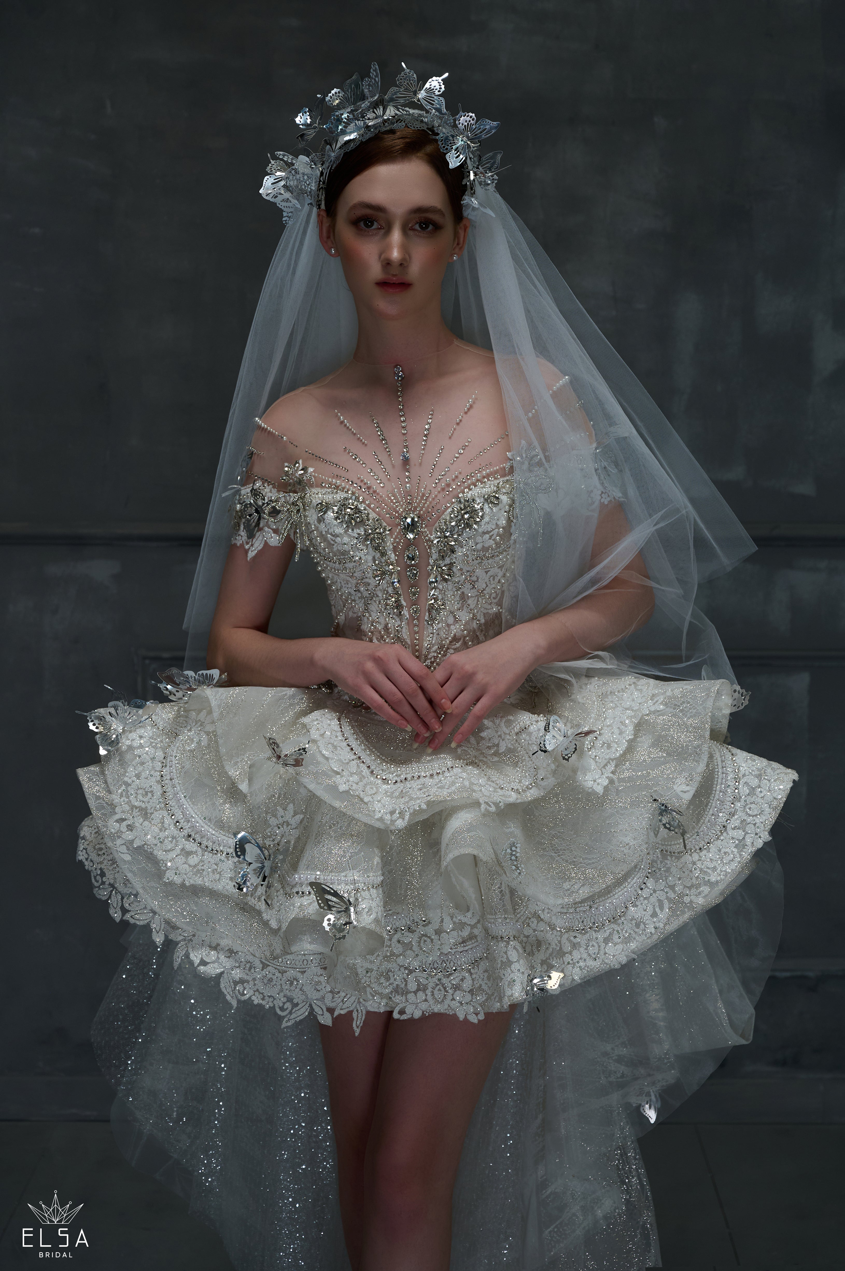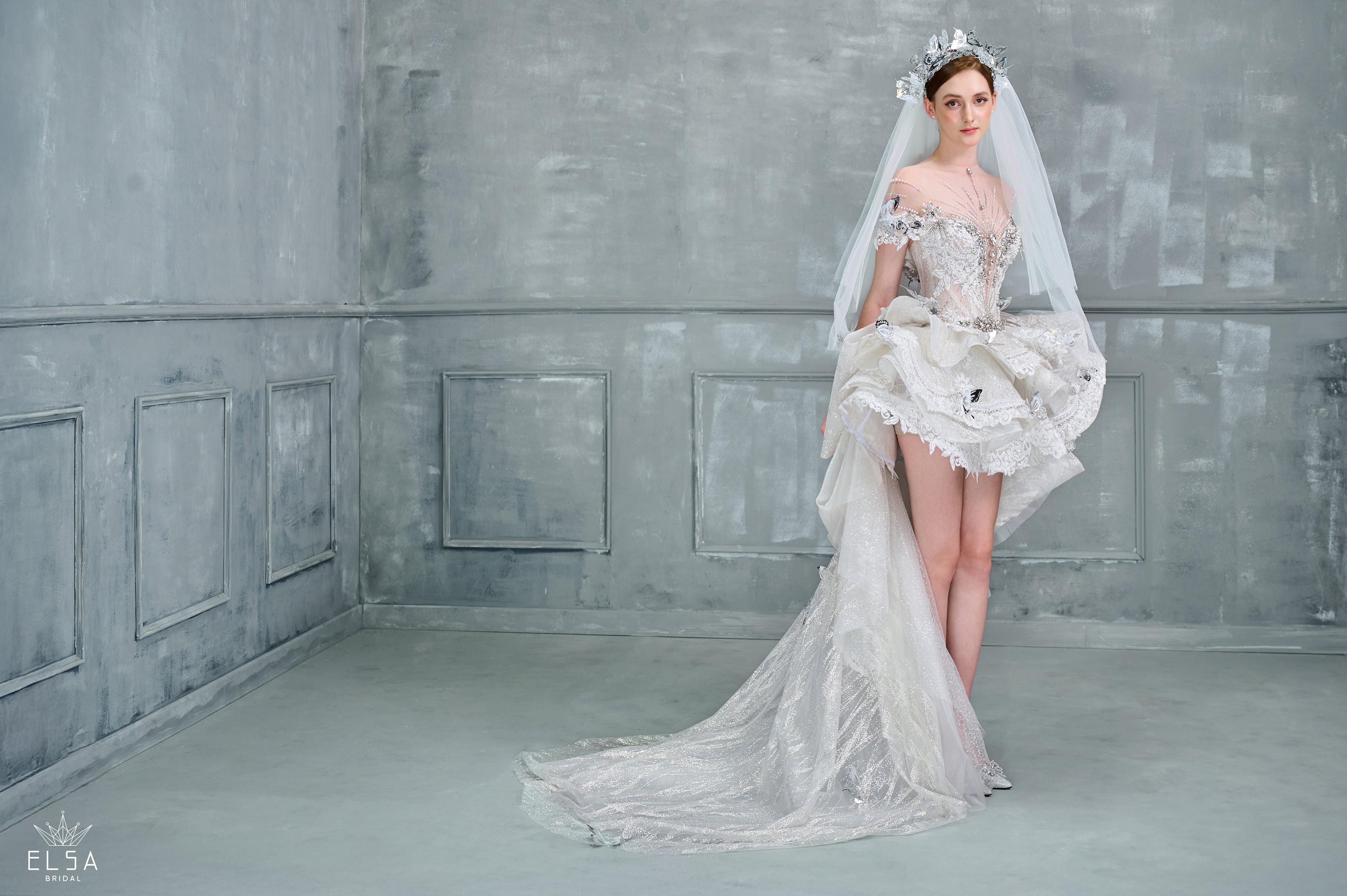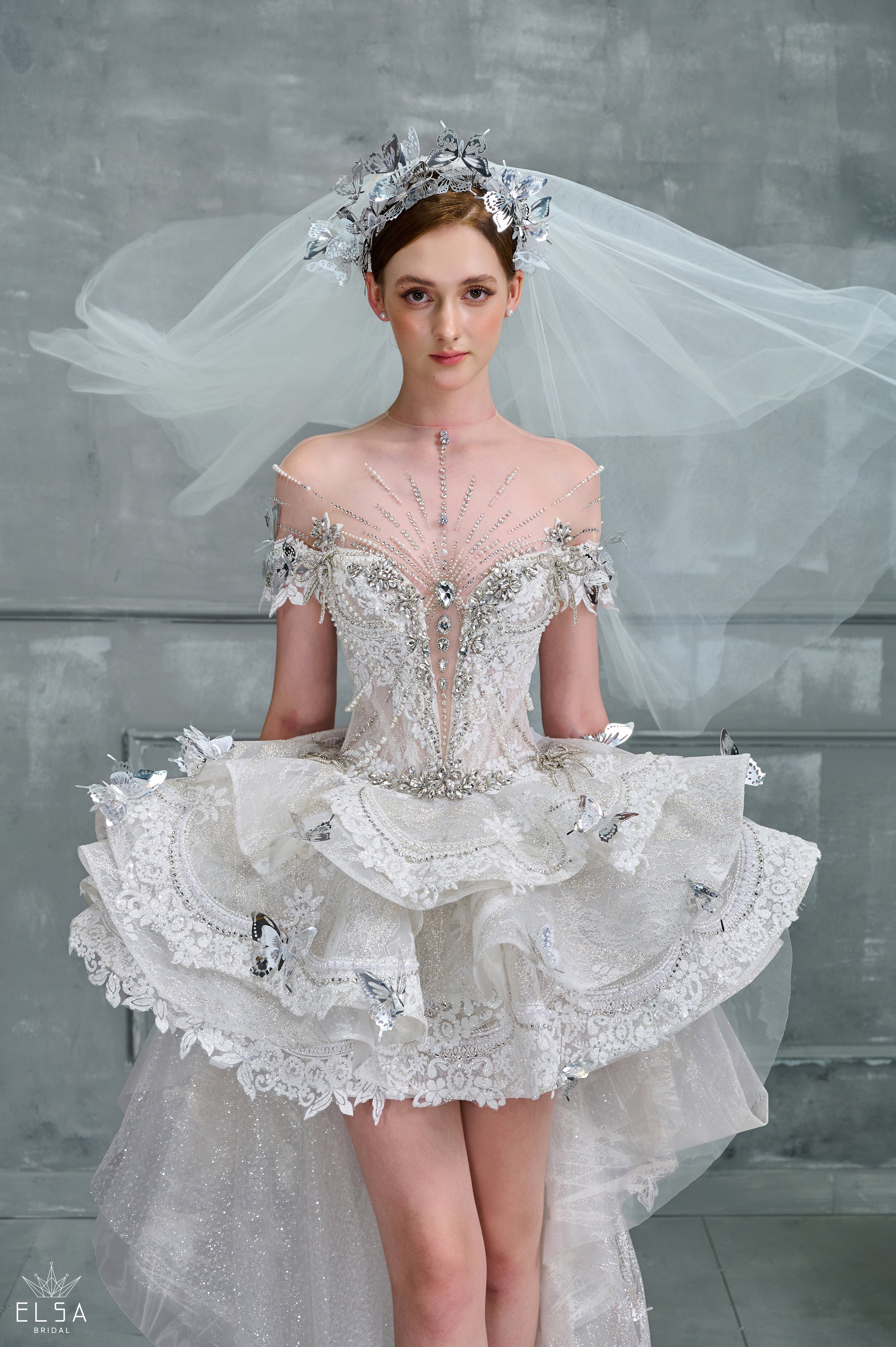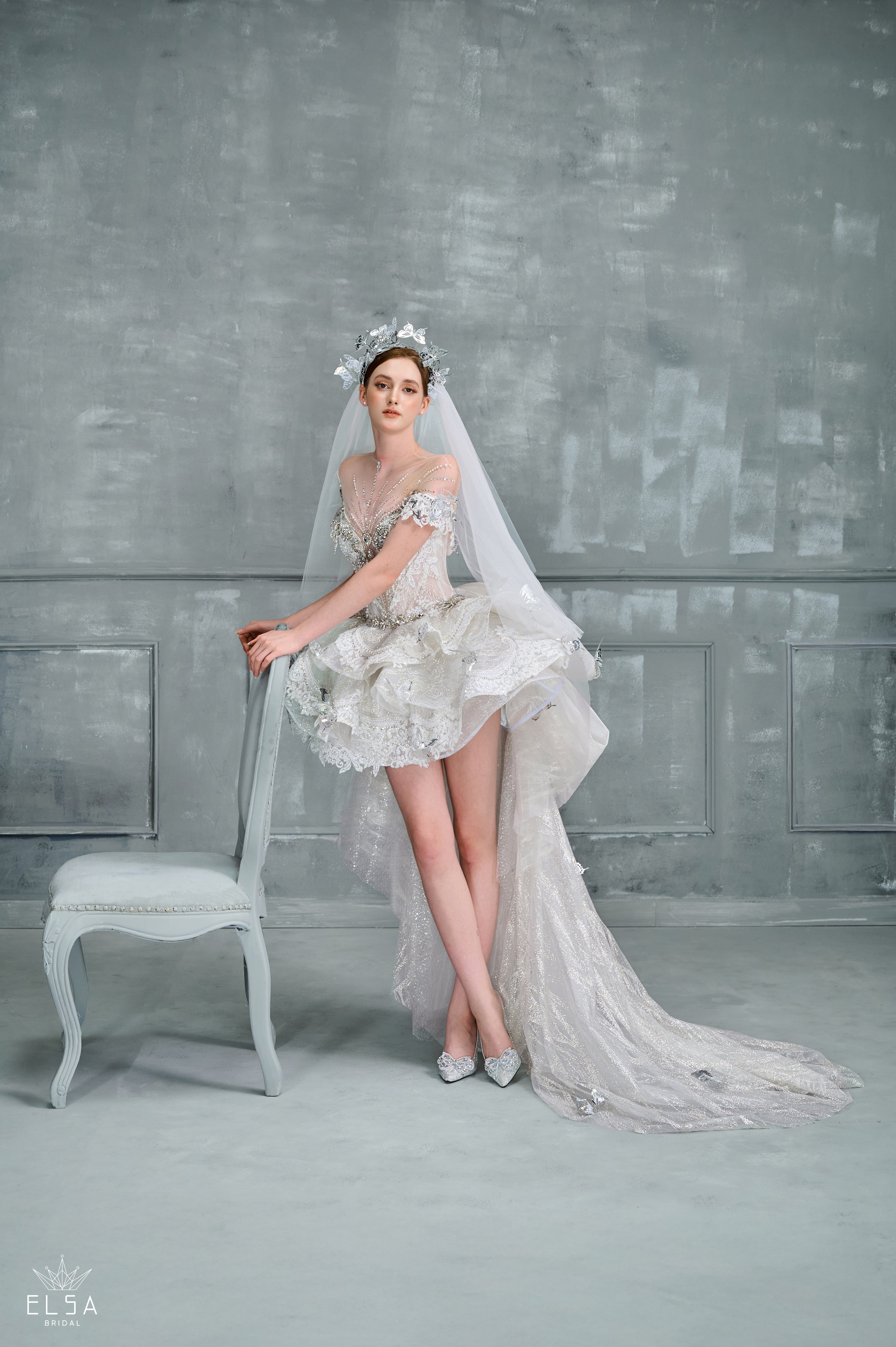 Breaking convention with defiant glamour, this short, high-low design is a declaration of modern couture. It captures the fleeting joy of a celebration, combining the playfulness of a cocktail dress with the drama of a royal train. The bodice is a dazzling silver armour of hand-placed crystals, leading into a skirt of sculpted, textured ruffles that explode in a dramatic sweep of glittering train, showcasing the legs and a bold, fashion-forward sensibility.