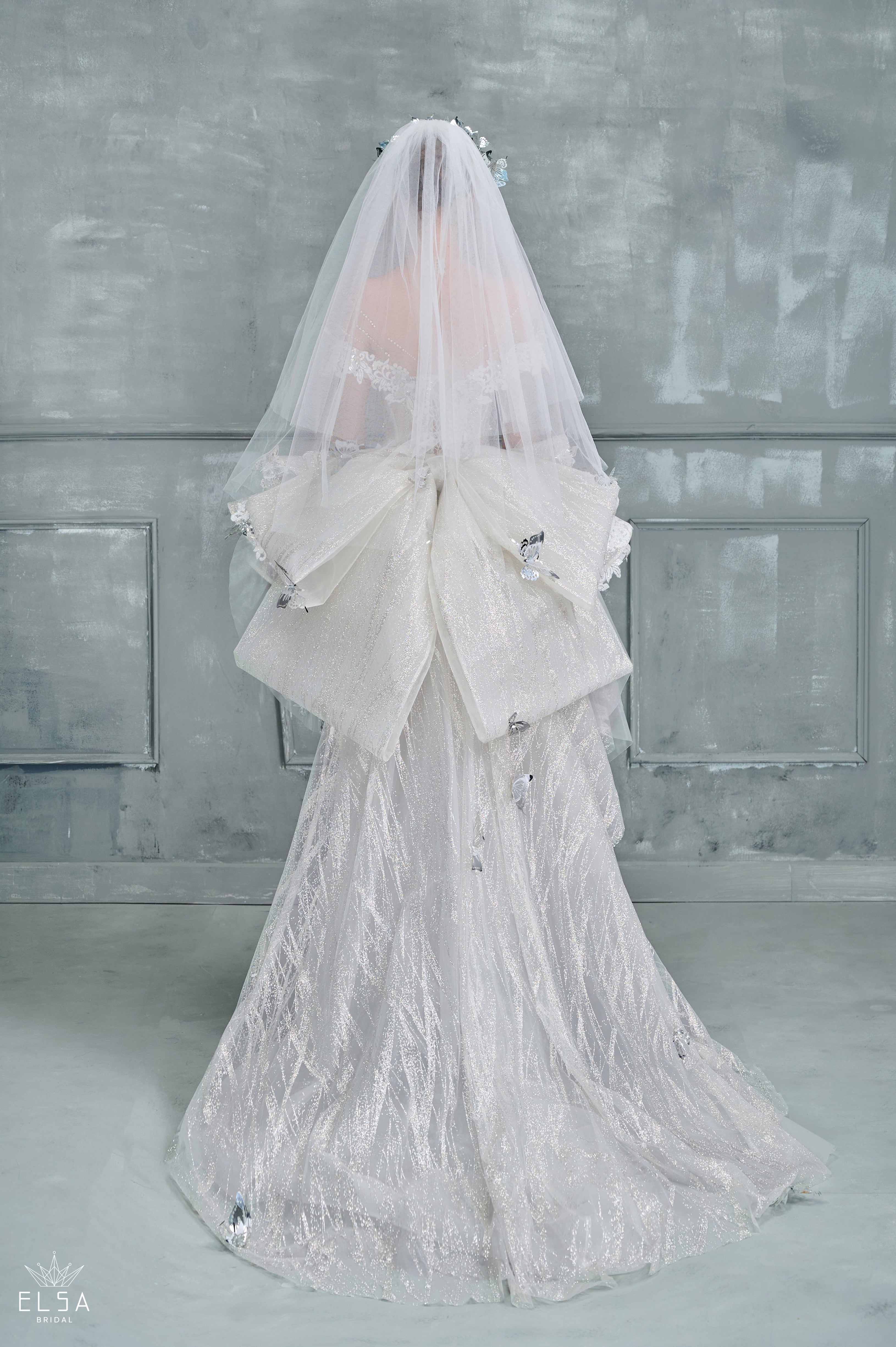 Theatrical Train: Long, flowing train crafted from heavily Glitter-Embellished Tulle and sequins for a blinding effect.
