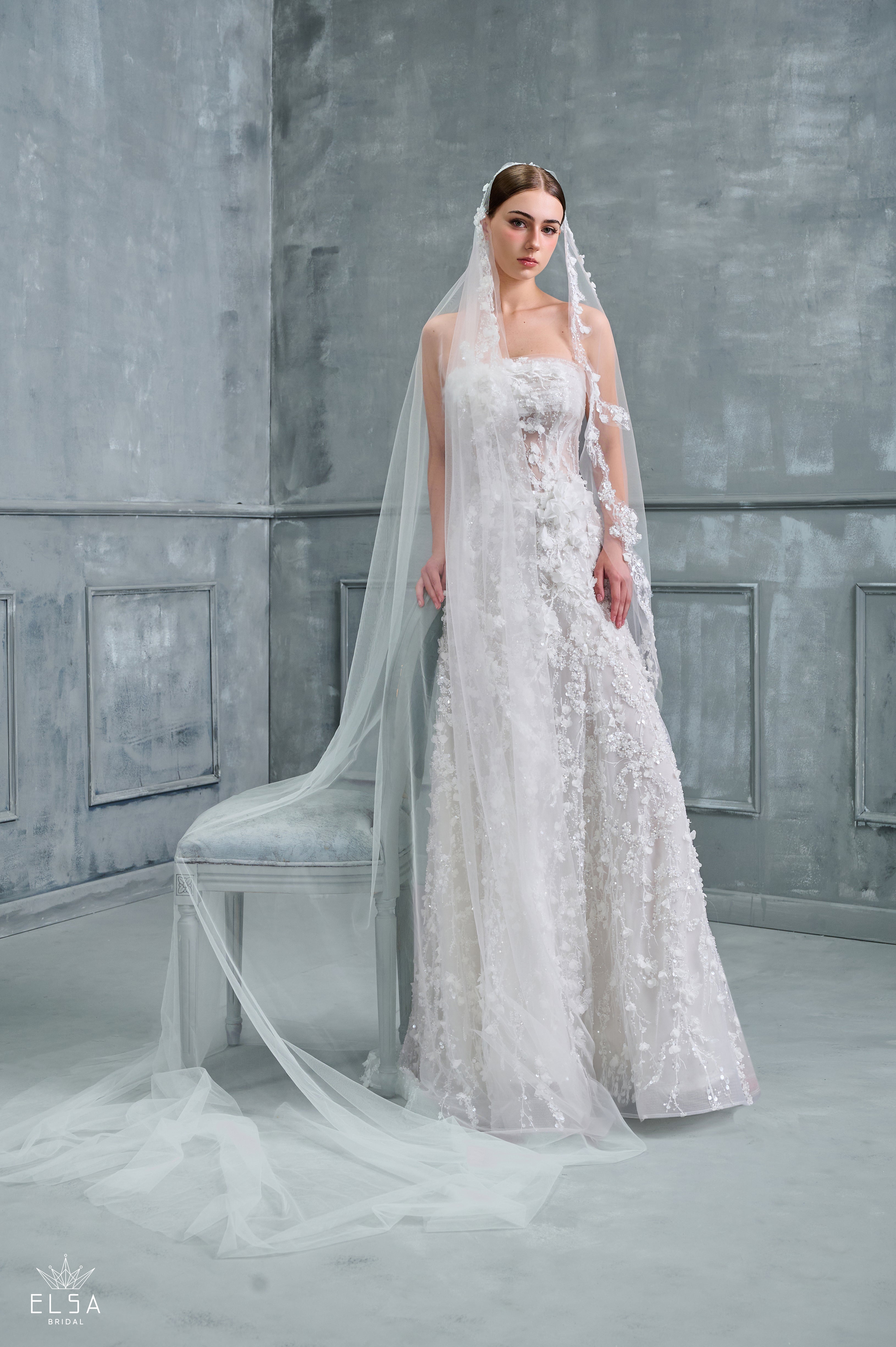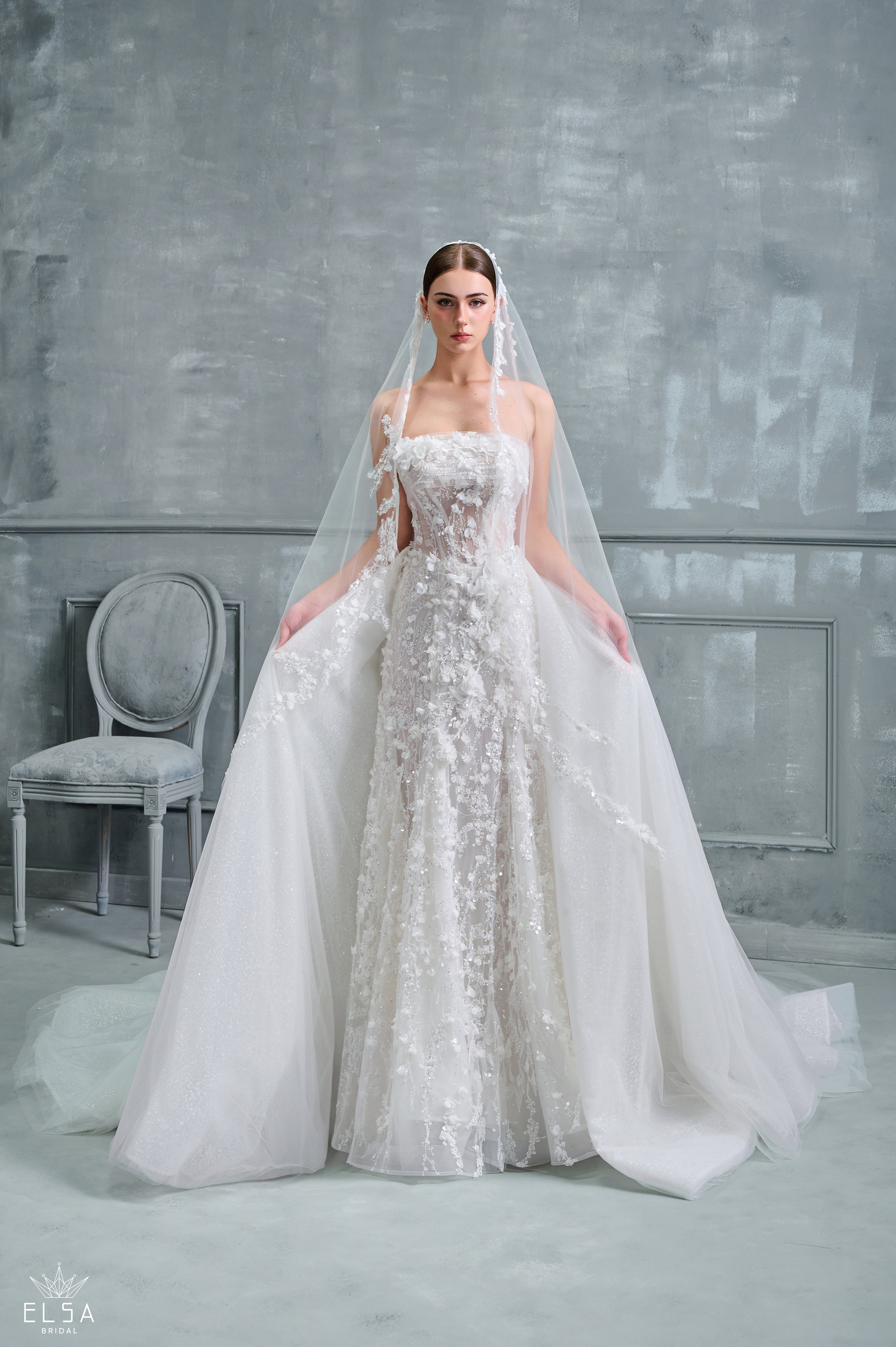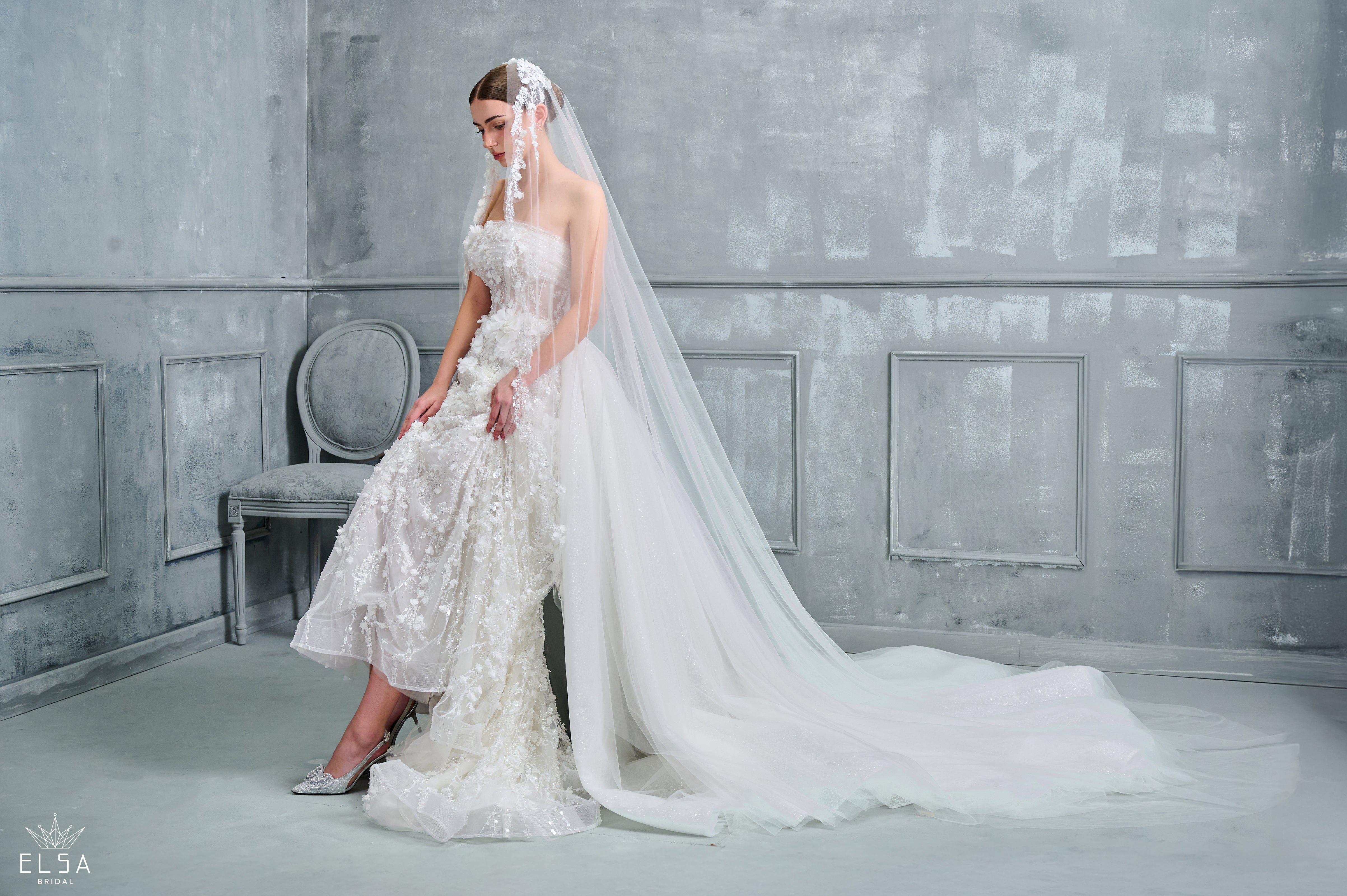Extensive 3D Appliqué Work: The gown is covered in dense, light-as-air organza flowers and petals, concentrated at the bust and scattering gracefully towards the train.
