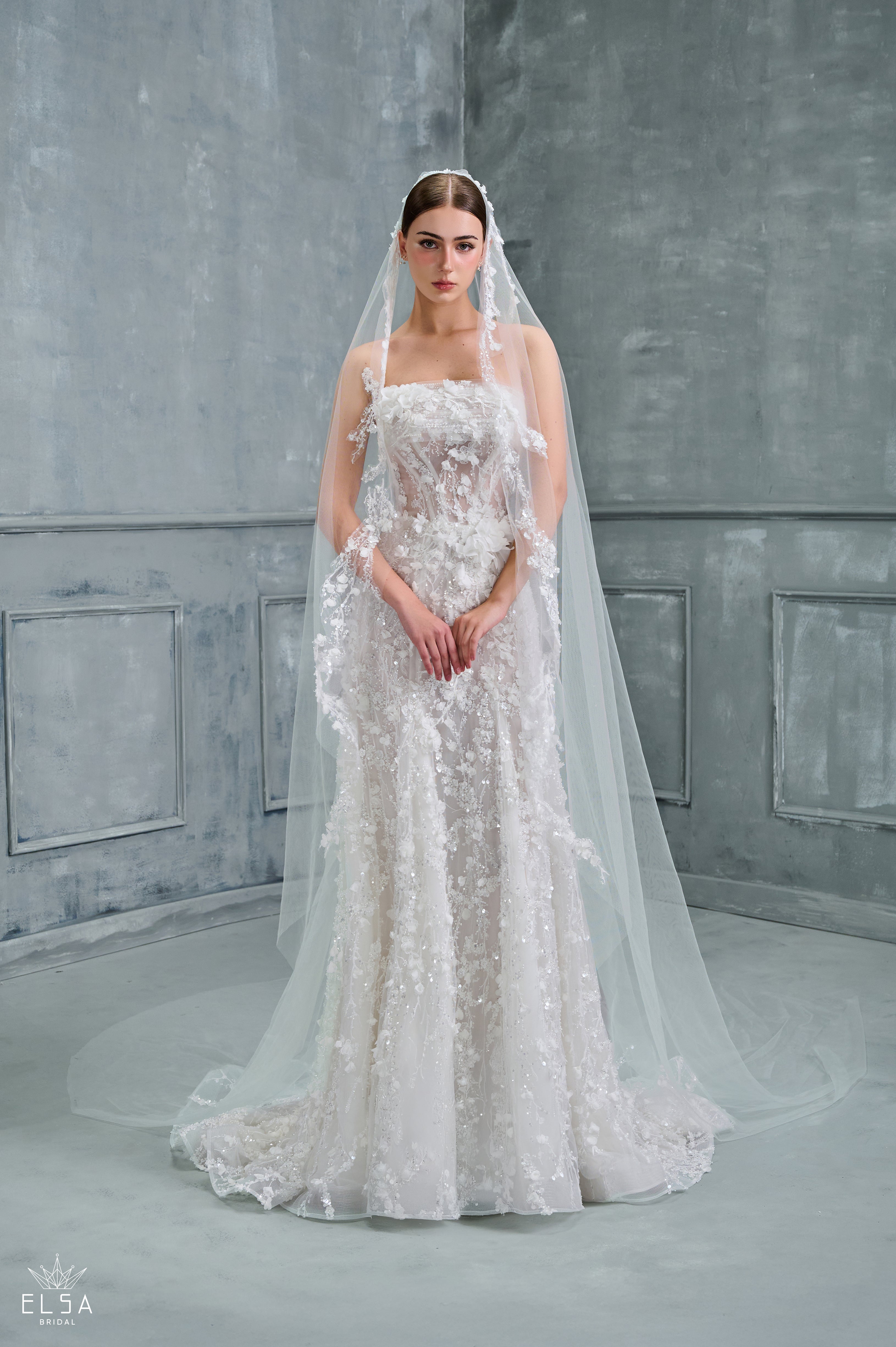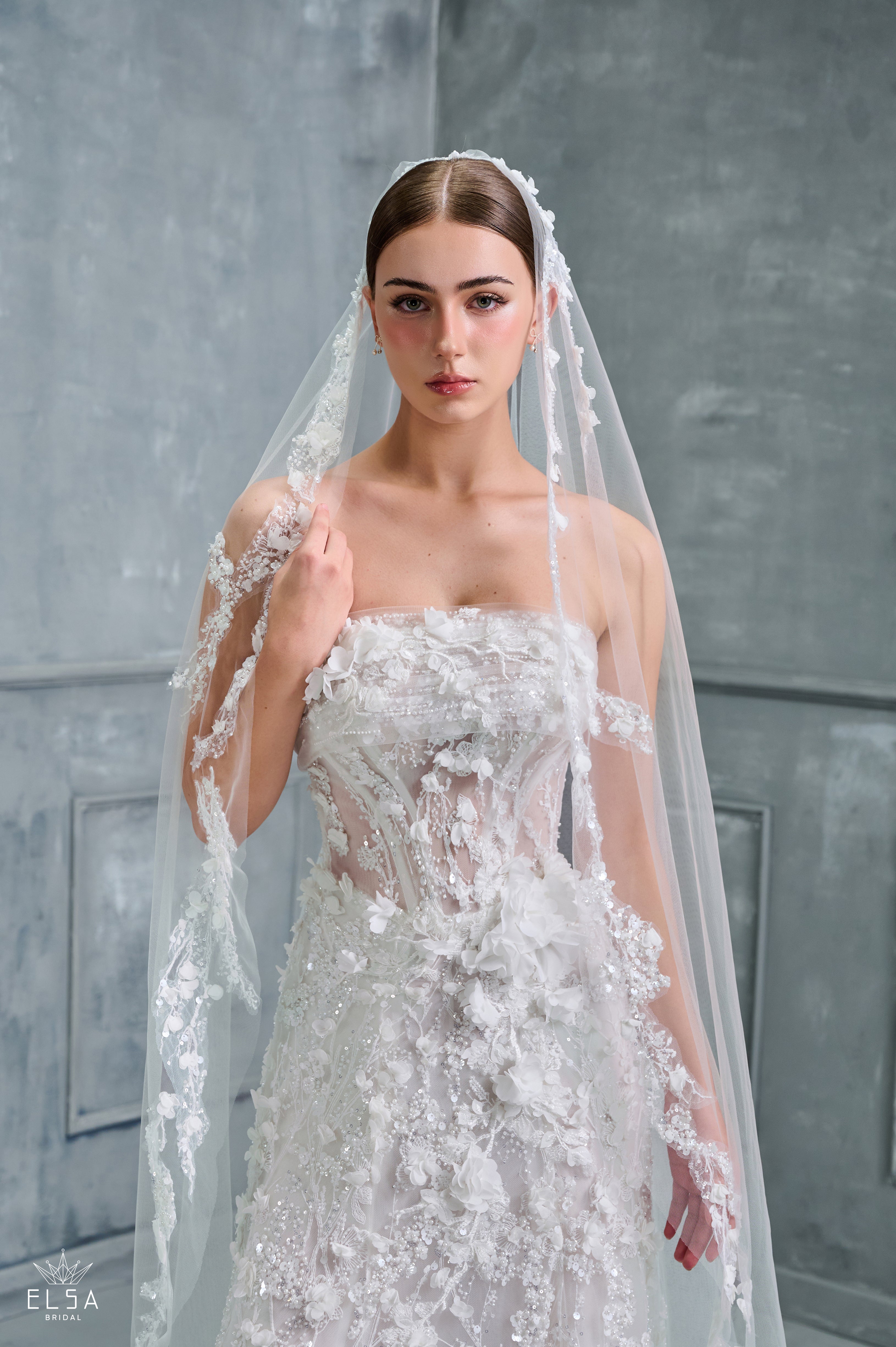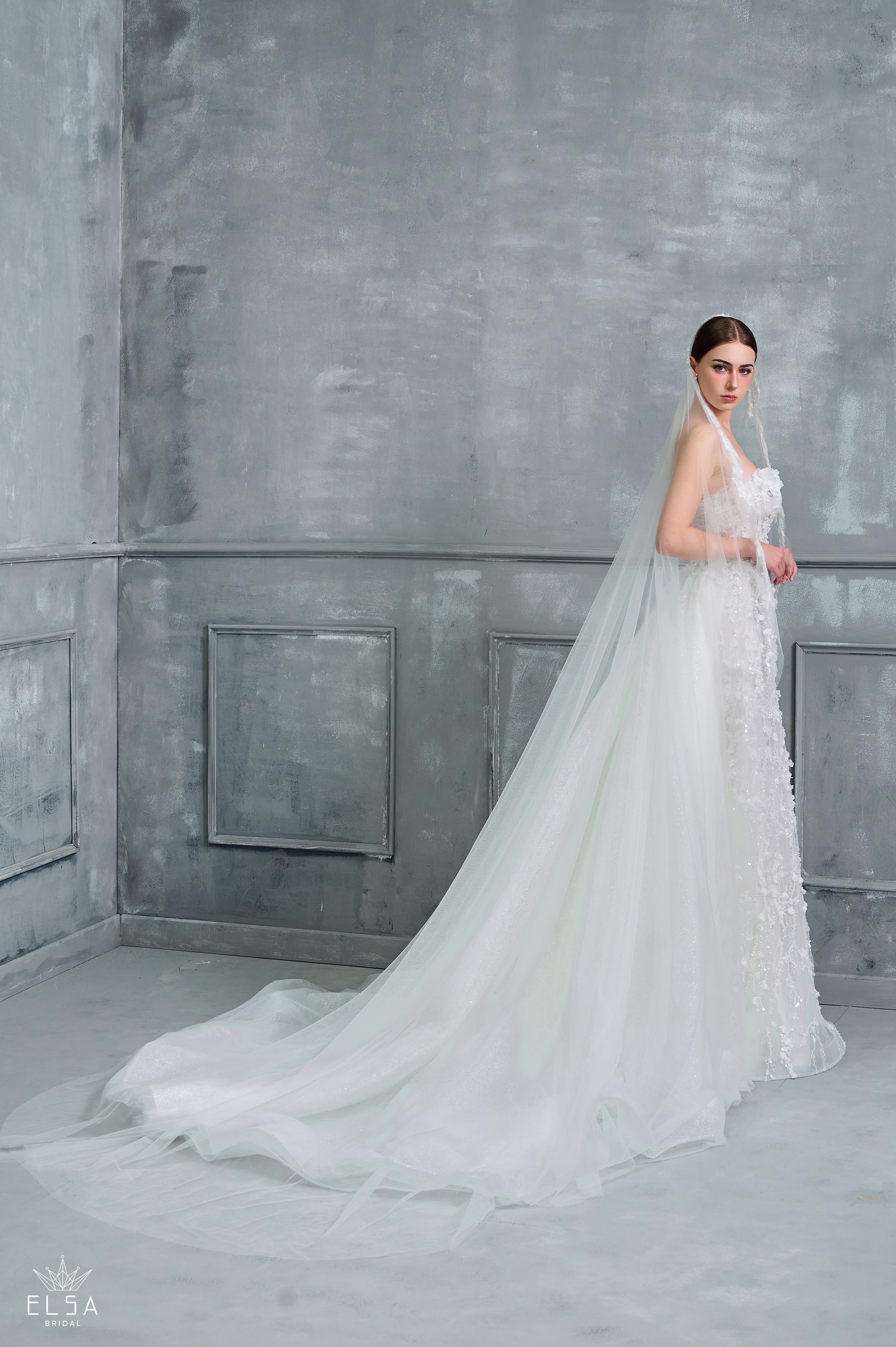 Embellishments: Hand-cut Organza and Silk 3D Flowers, Micro-beads.