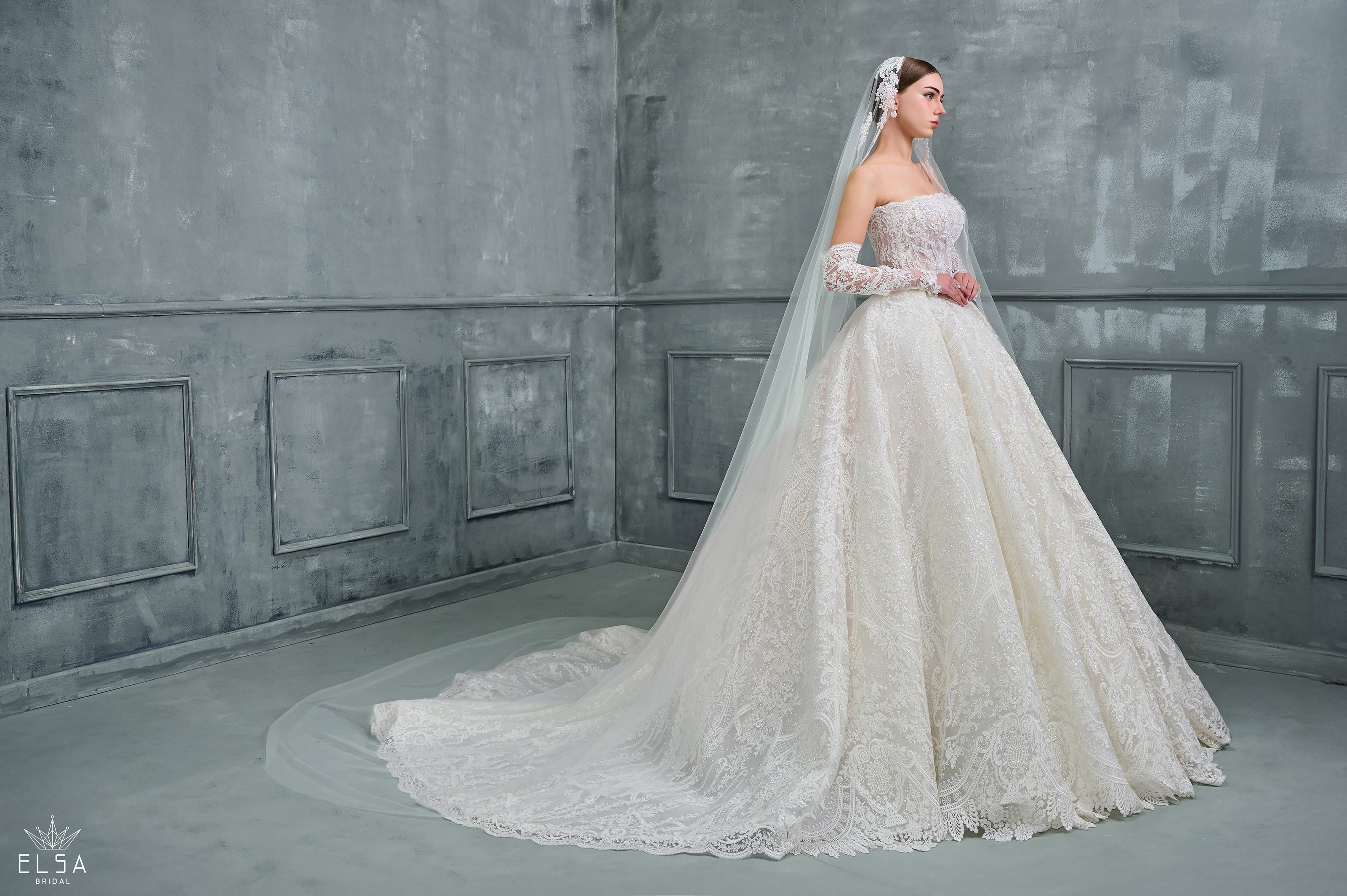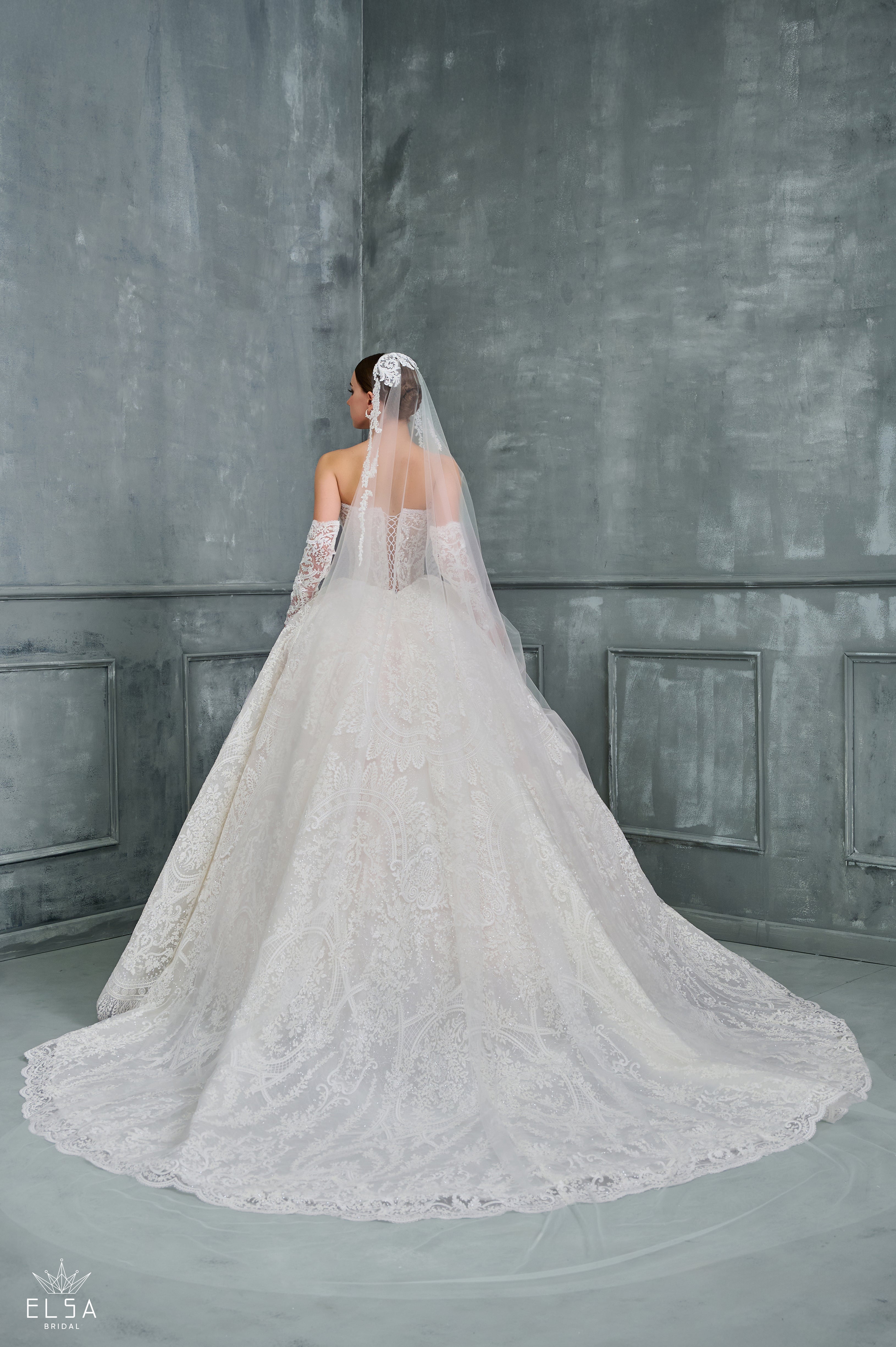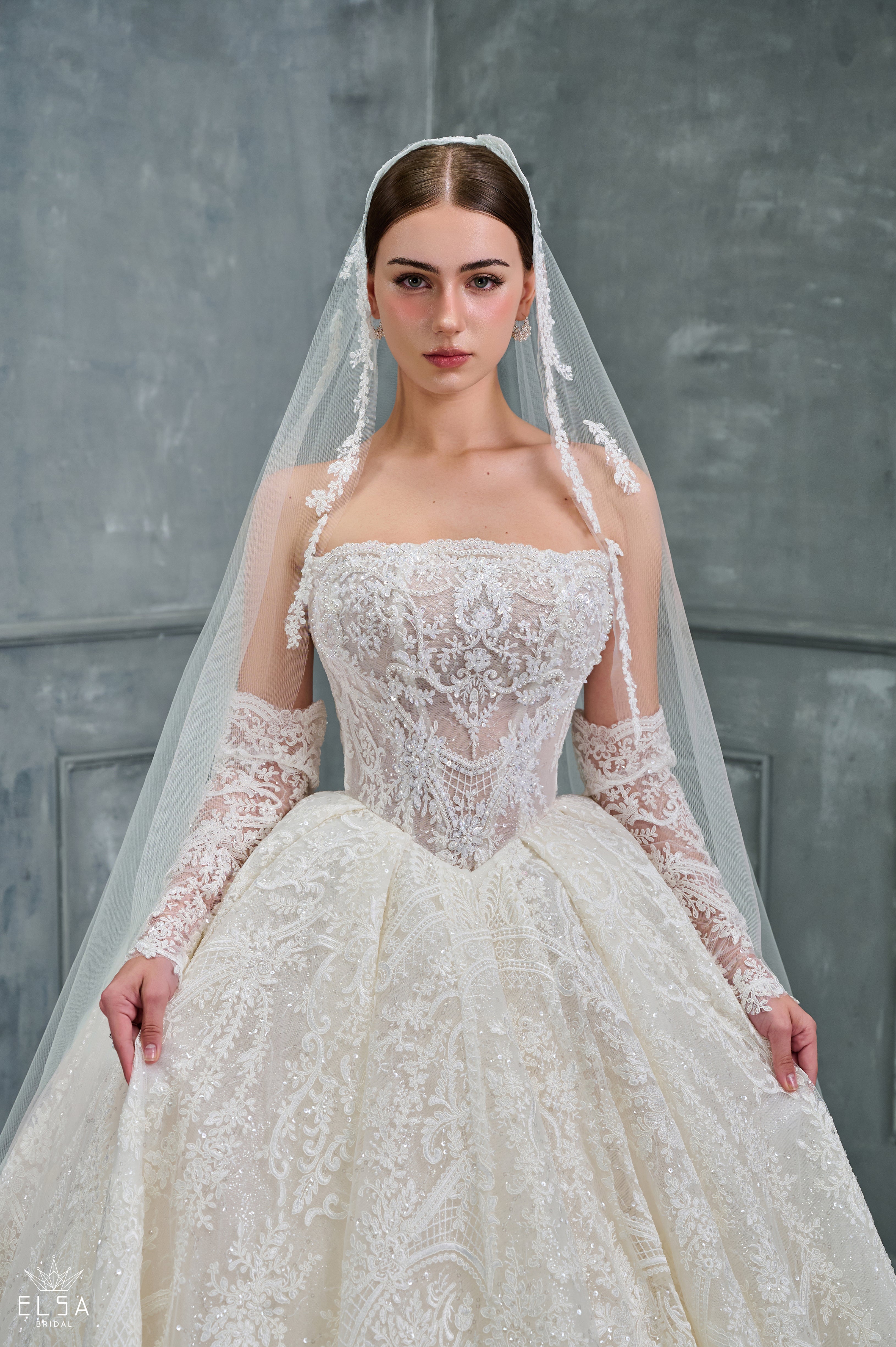 A gown of timeless romance and imperial majesty. This classic Ball Gown achieves its grandeur through the richness of its texture and perfect structure. The strapless bodice is a work of art, cinching the waist to magnificent proportions before descending into a voluminous skirt completely blanketed in exquisite French lace. Every motif of the lace is subtly dusted with shimmer, creating a depth and sparkle reminiscent of antique silver tapestry.