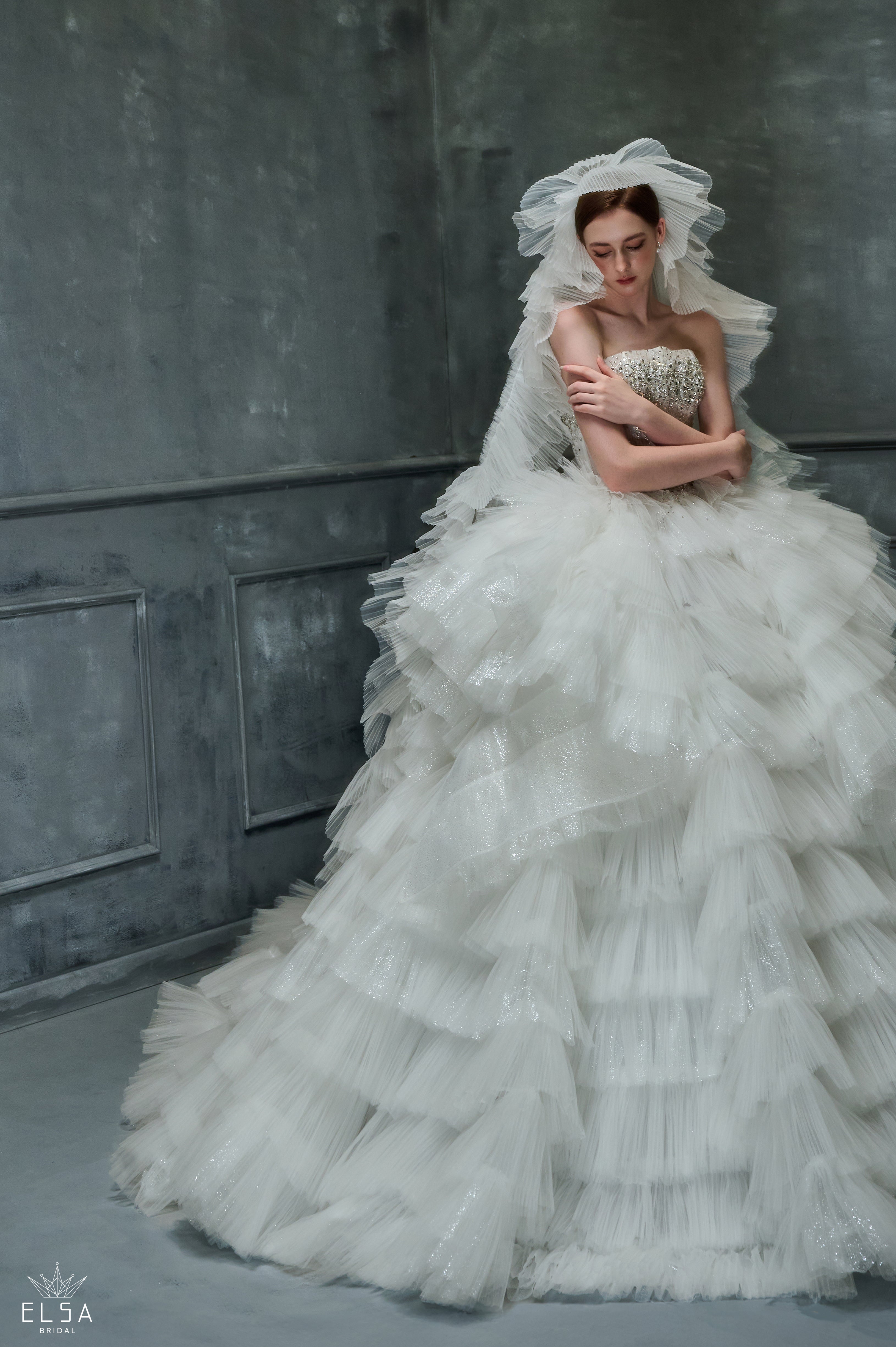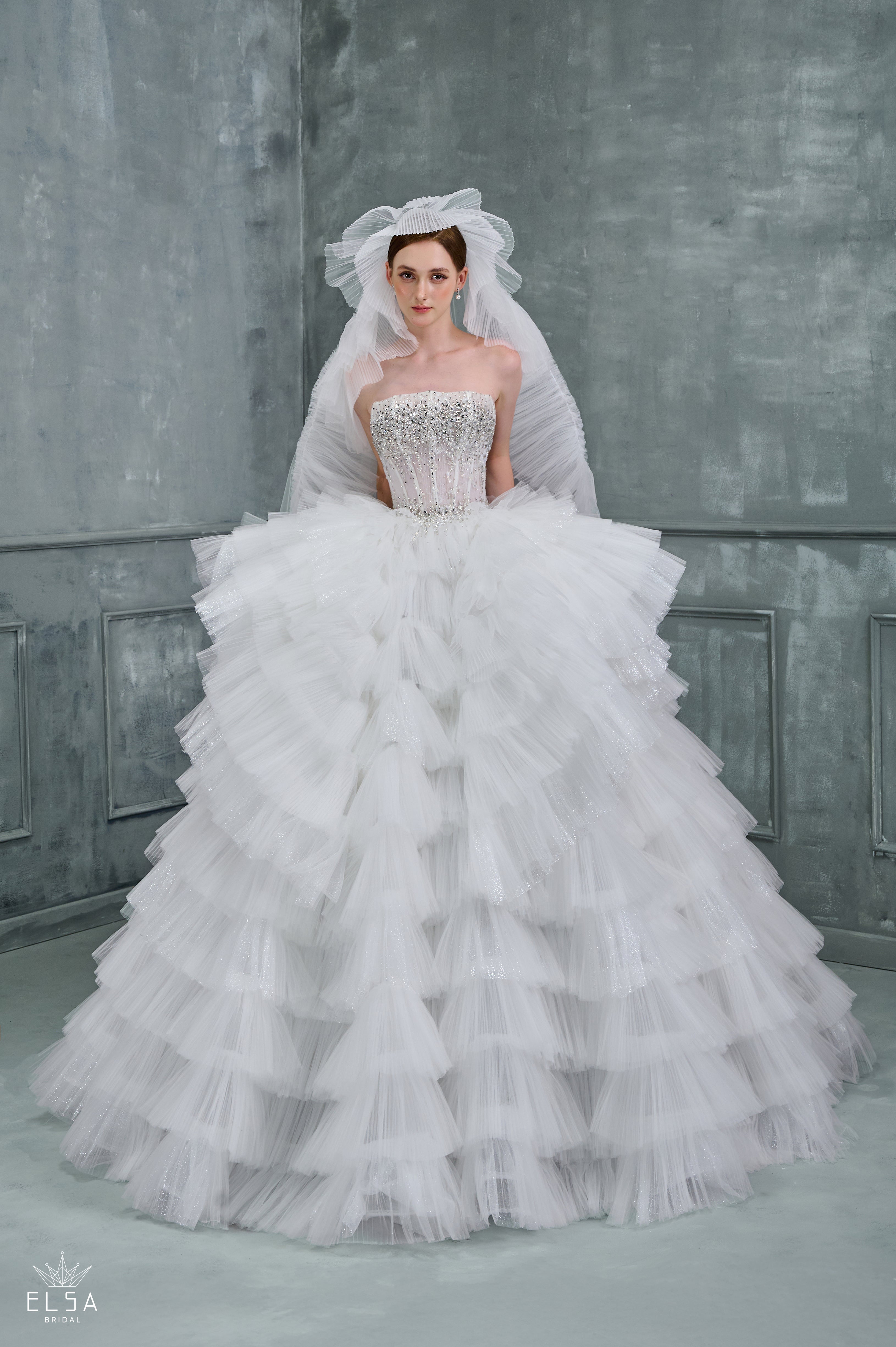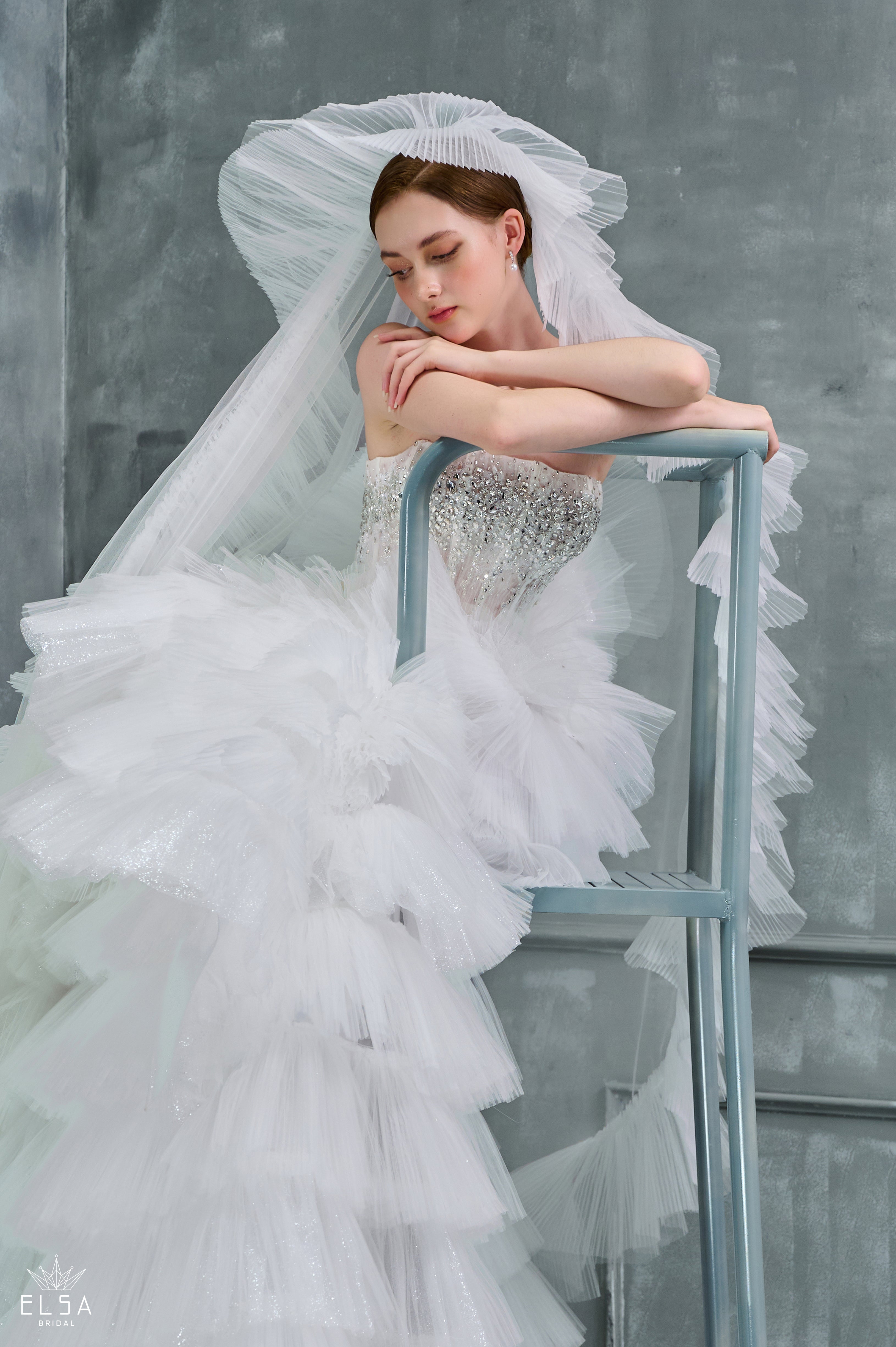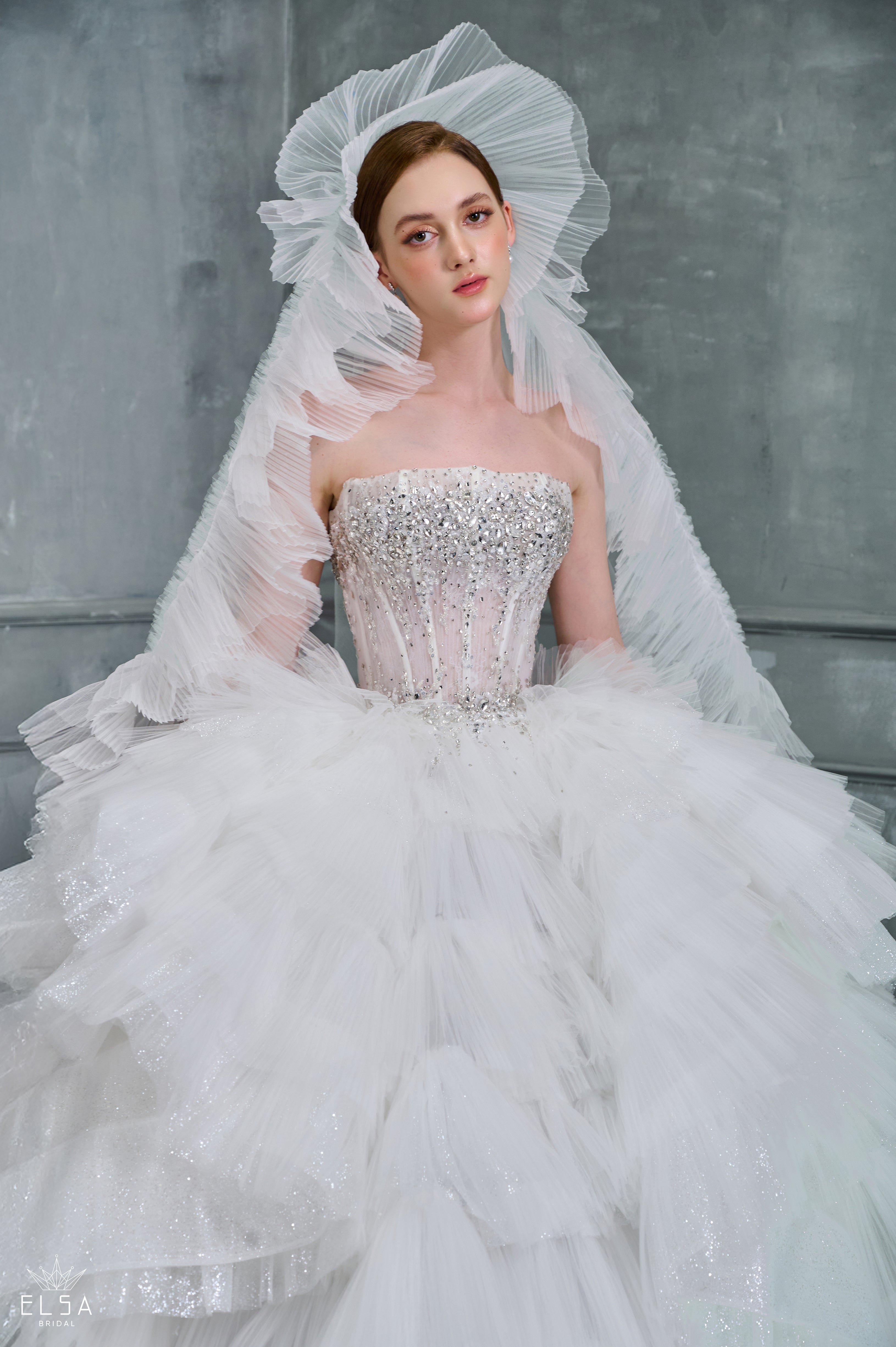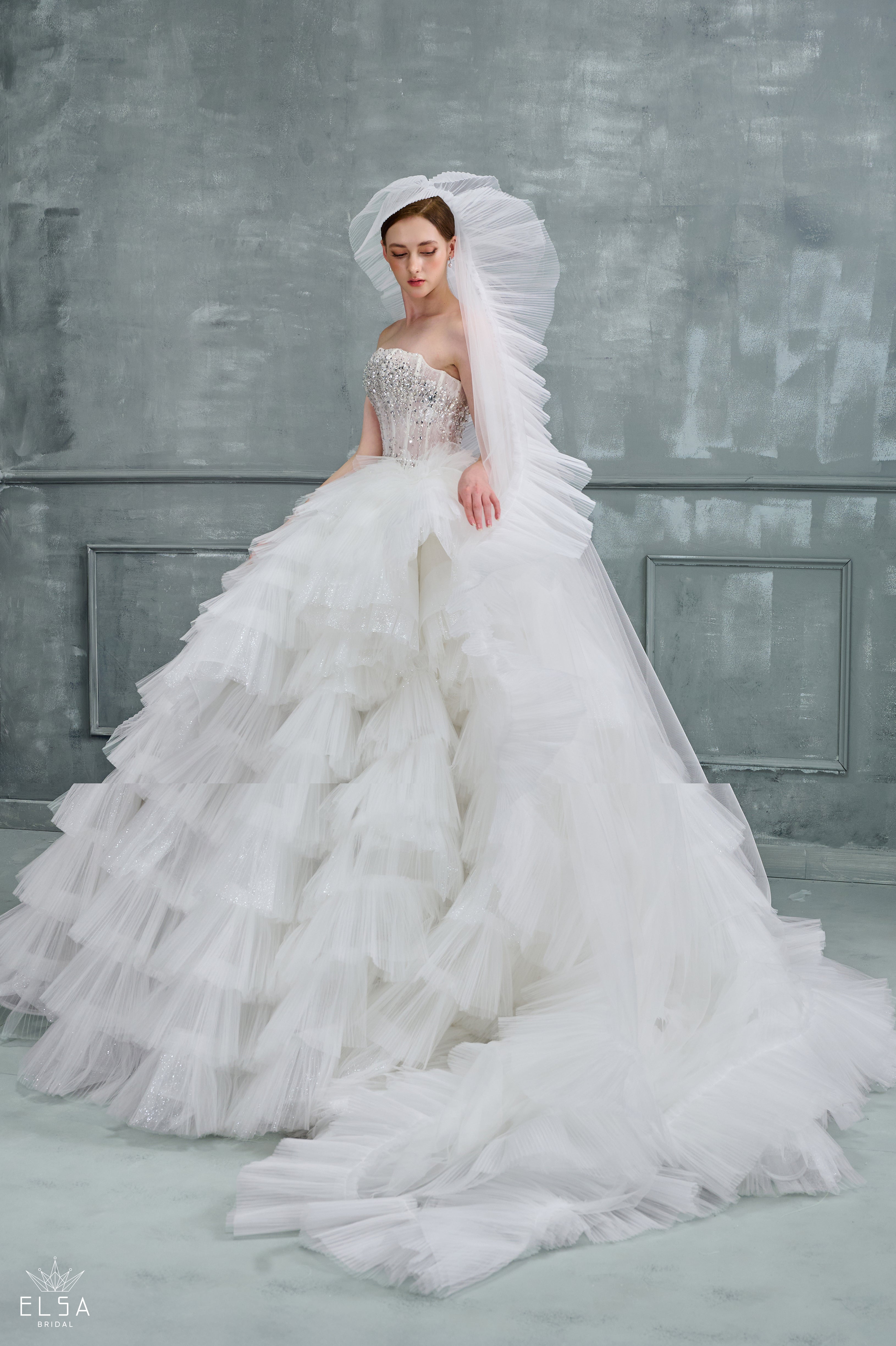 A vision of dramatic opulence, this gown is a majestic cloud rendered in white and silver light. The structured, glittering bodice, entirely encrusted with crystals, offers a dazzling contrast to the voluminous, multi-tiered skirt that flows with the weightless movement of a thousand gentle ruffles. This is a gown crafted for the grandest entrances, where the bride reigns as the undisputed queen of the night.