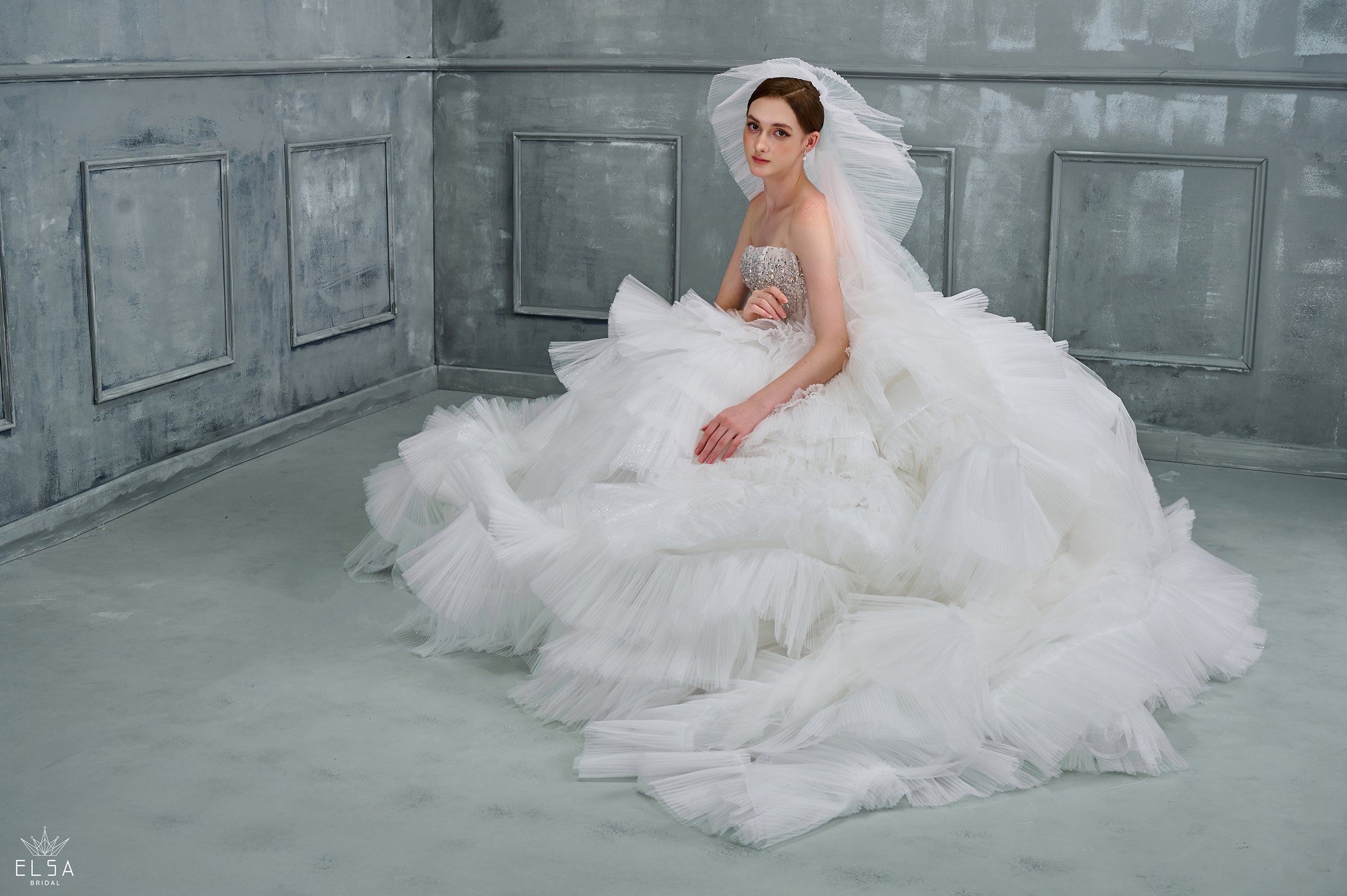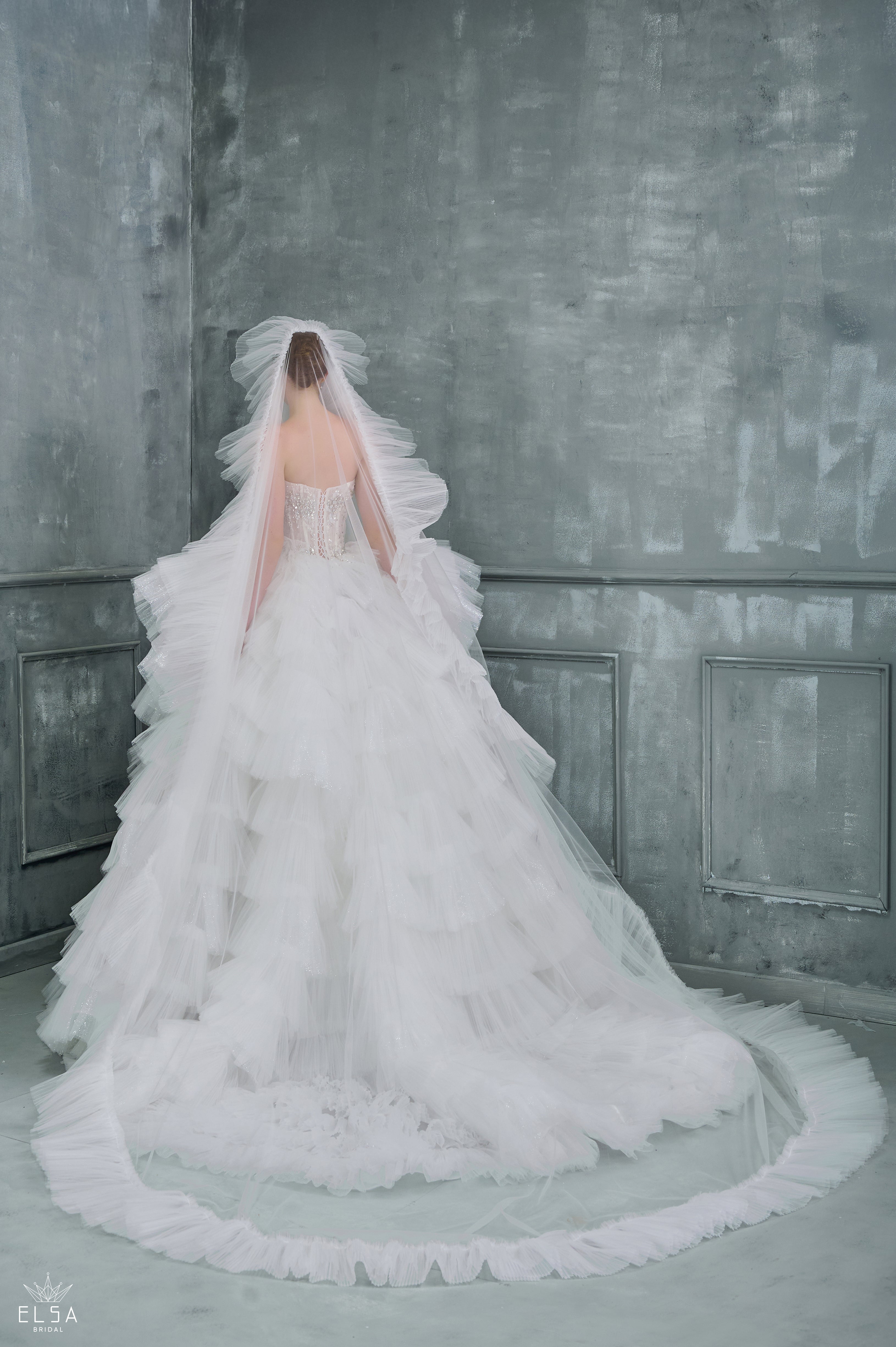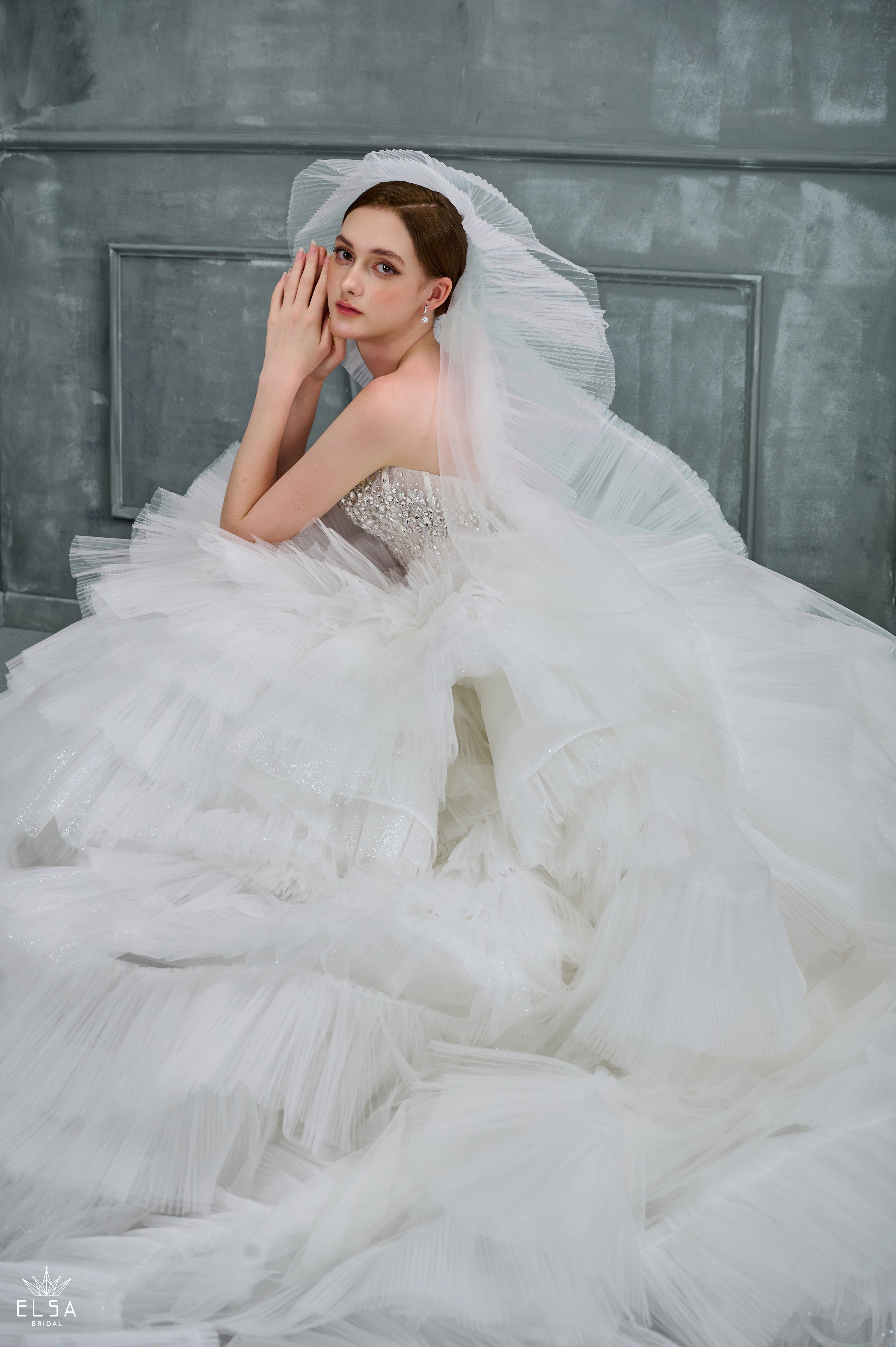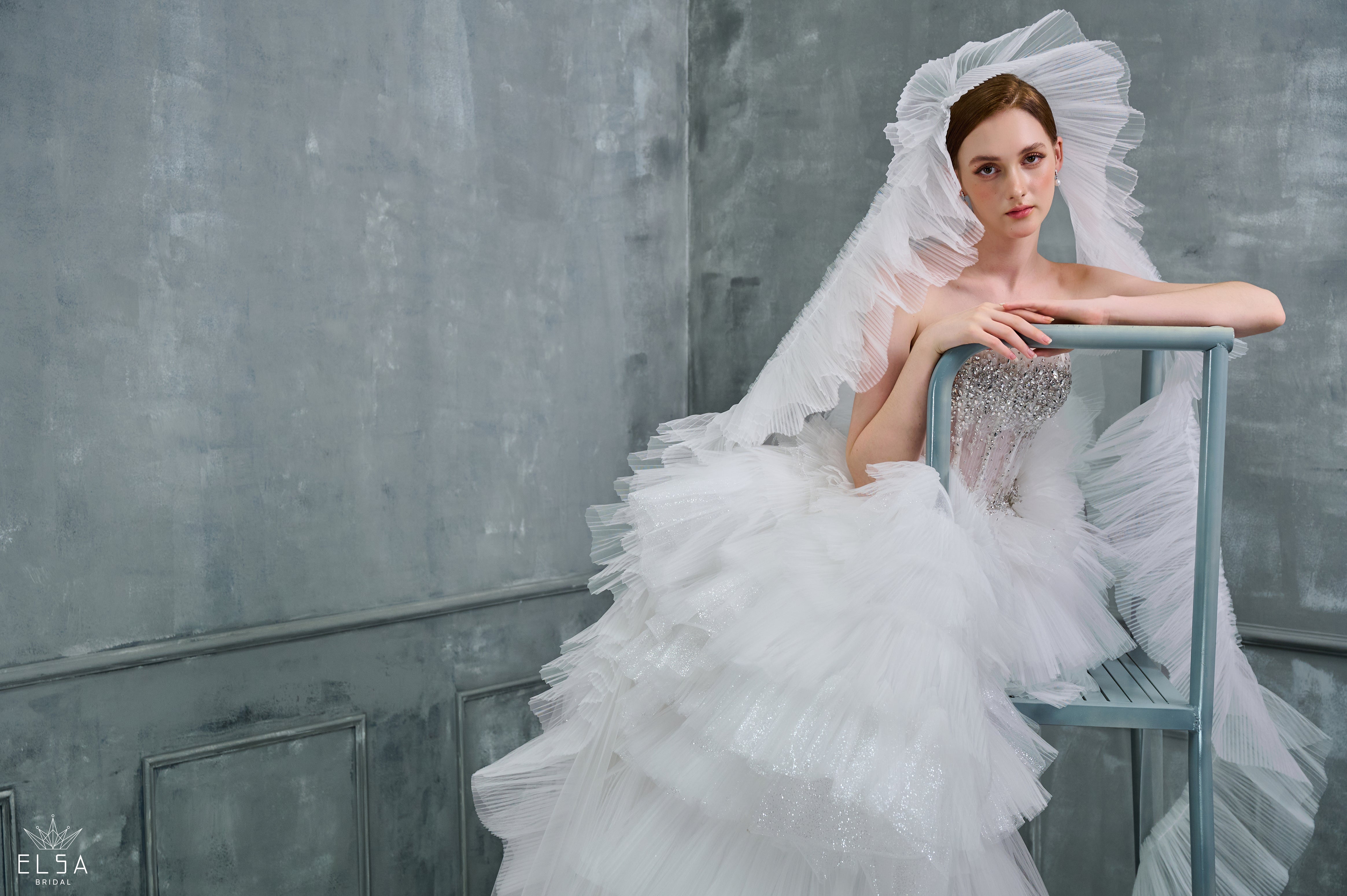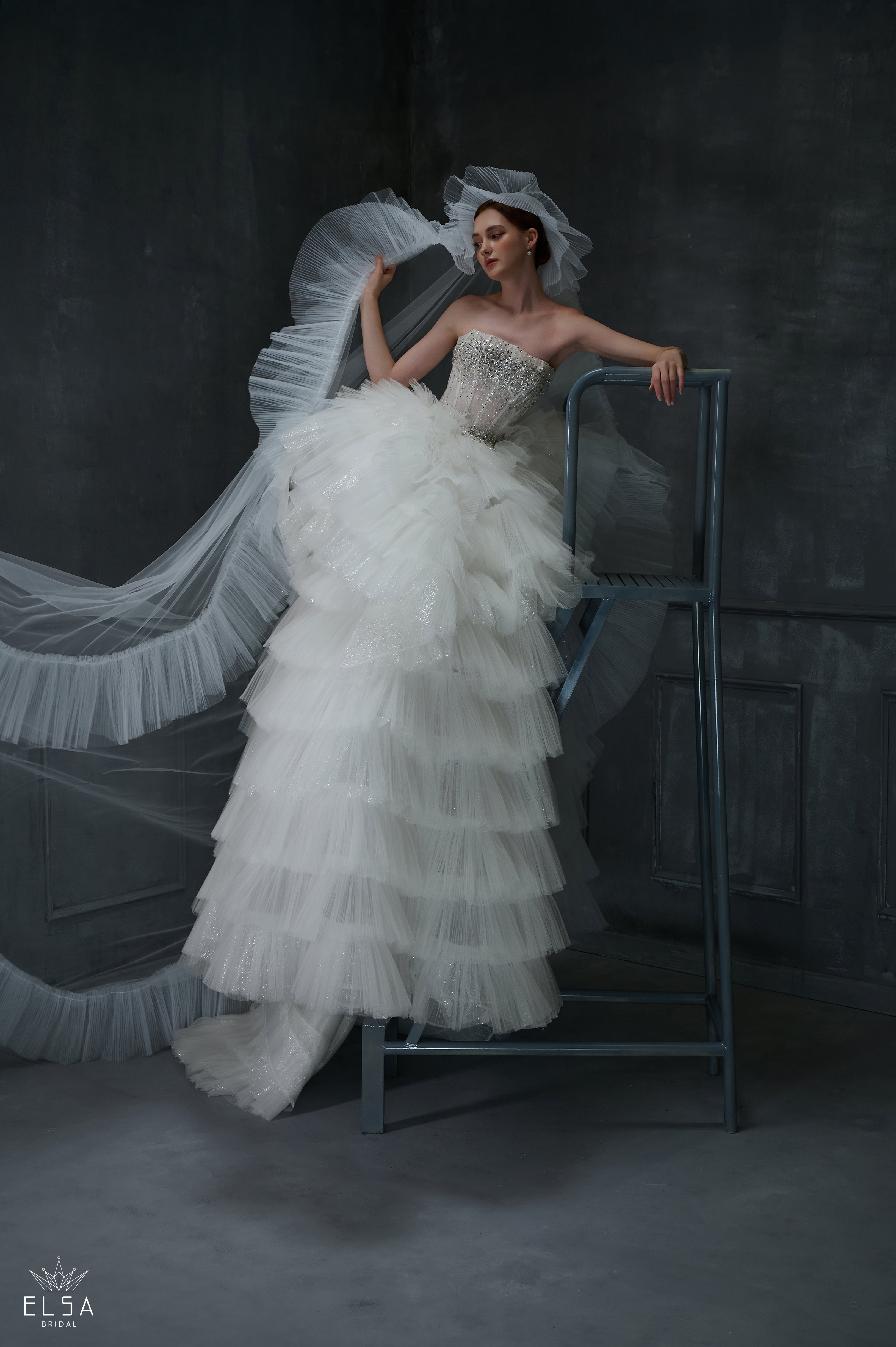 A vision of dramatic opulence, this gown is a majestic cloud rendered in white and silver light. The structured, glittering bodice, entirely encrusted with crystals, offers a dazzling contrast to the voluminous, multi-tiered skirt that flows with the weightless movement of a thousand gentle ruffles. This is a gown crafted for the grandest entrances, where the bride reigns as the undisputed queen of the night.