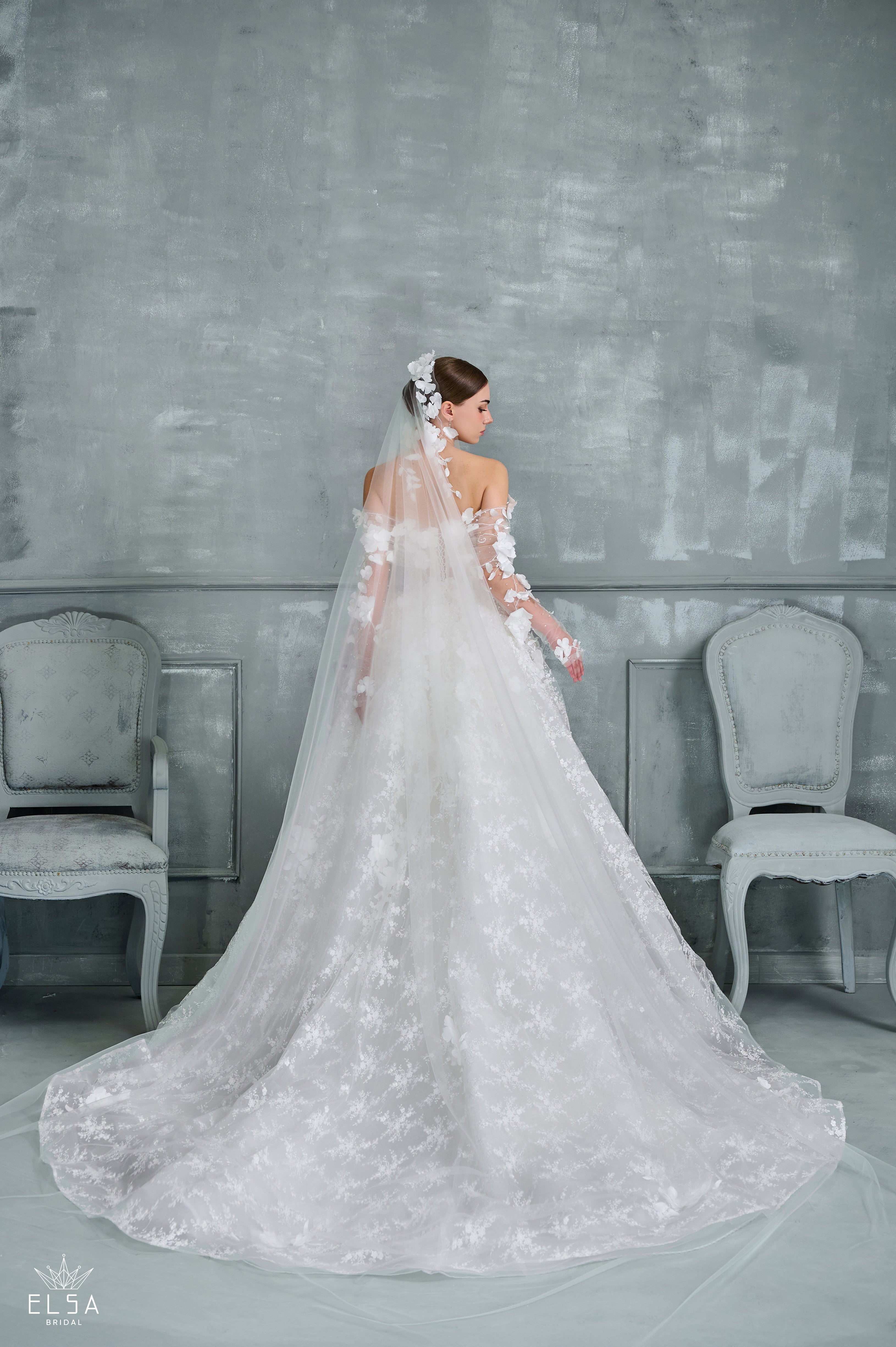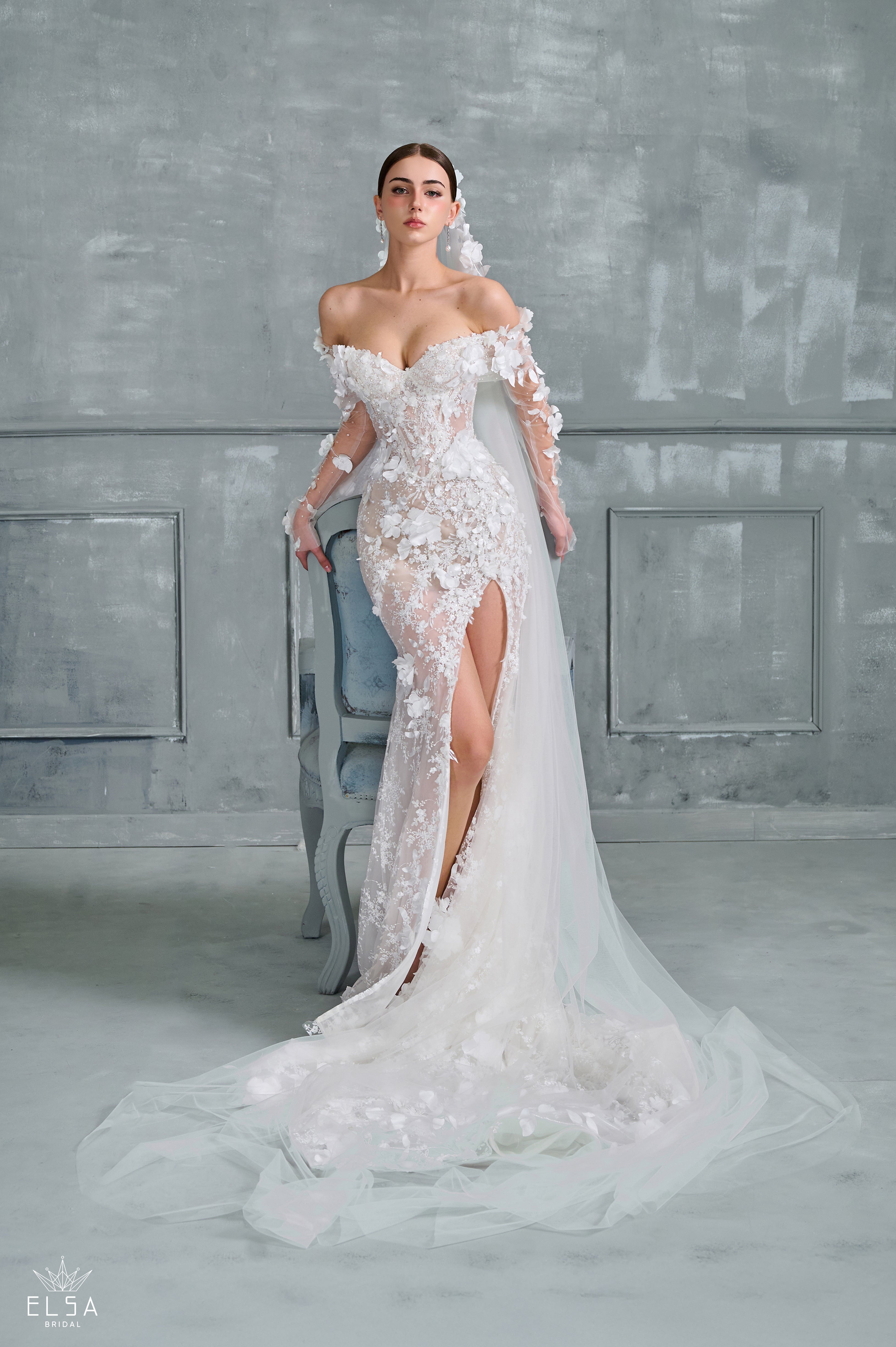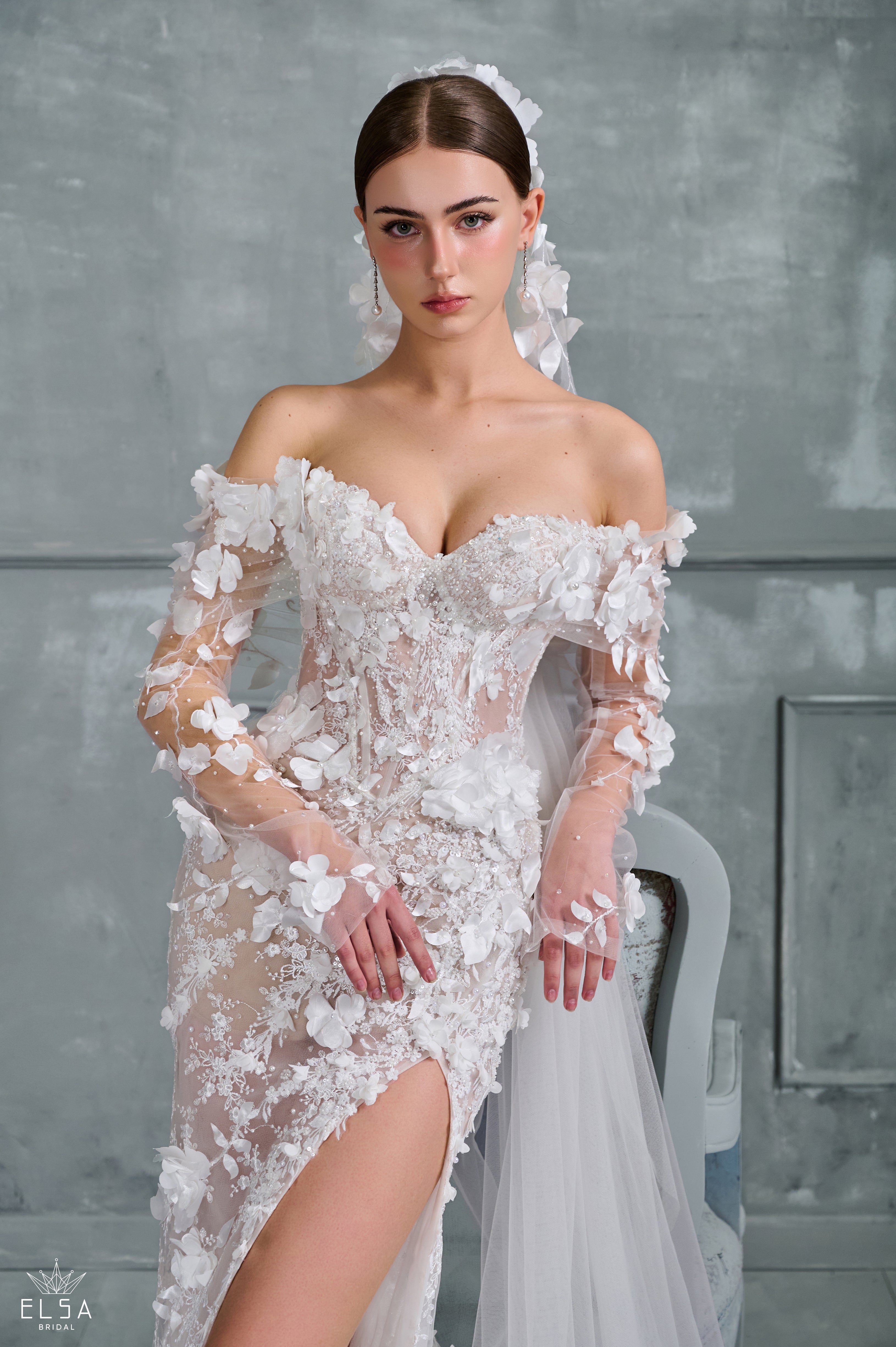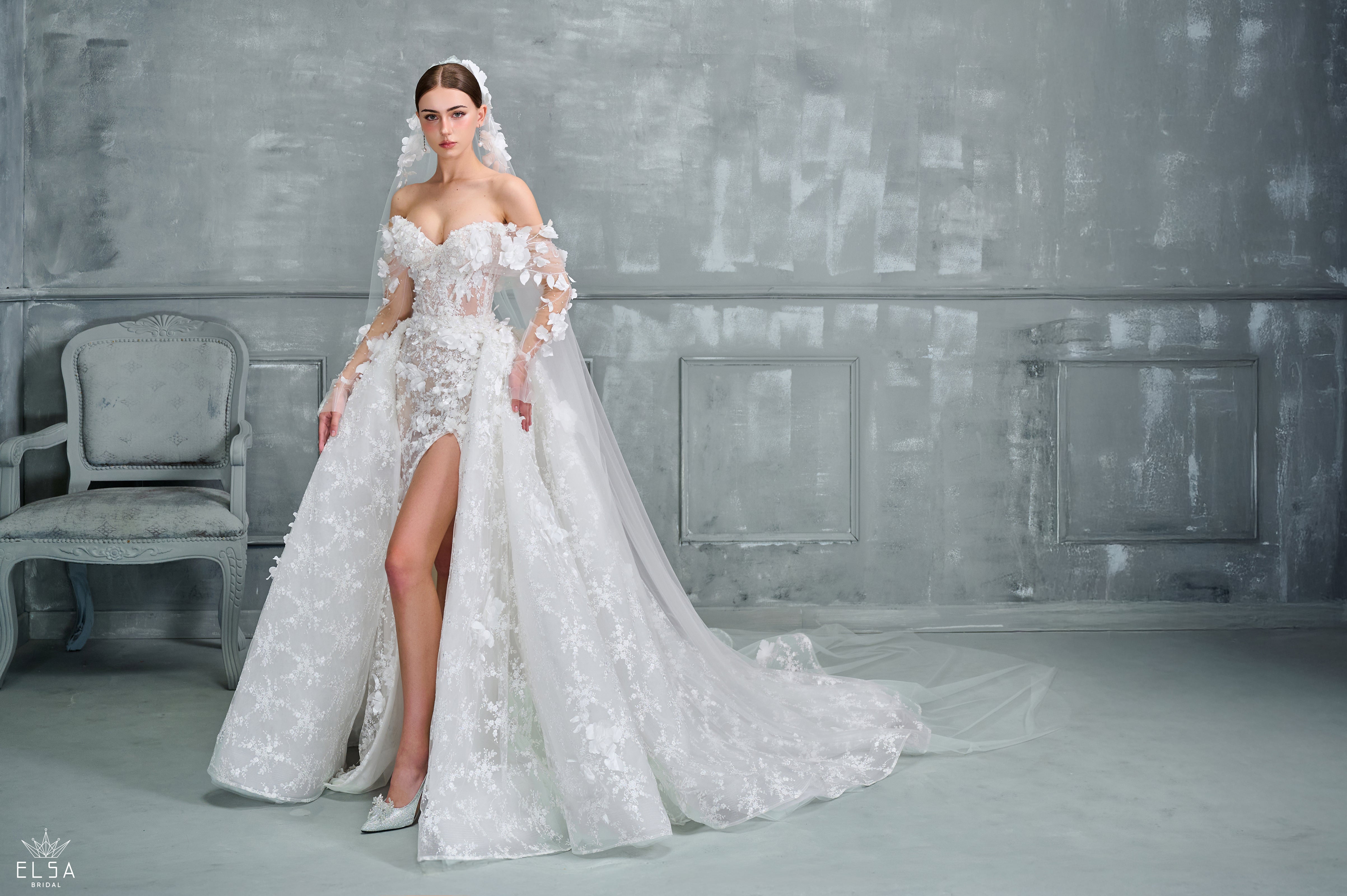 Bathed in the final glow of twilight, this off-the-shoulder ball gown blossoms like a celestial dream in motion. The sculpted strapless bodice, framed by voluminous floral lace sleeves, evokes quiet majesty—its sheer lace midriff whispering of grace and allure beneath the soft ivory blush tones. Flowing effortlessly into a full skirt with a daring thigh-high slit, the gown captures the perfect balance between romance and power. With every movement, the fabric shimmers like fading starlight, while a delicate veil, scattered with crystal blooms, adds a finishing touch of ethereal radiance. A vision for the bride who moves between strength and serenity—timeless, luminous, and utterly unforgettable.